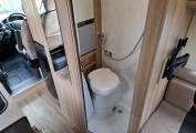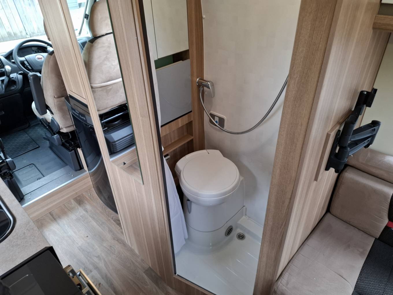 Opposite, behind the driver’s seat, is a wardrobe above a fridge with a freezer box, followed by the wetroom, with a toilet, a hand basin, and a shower.
