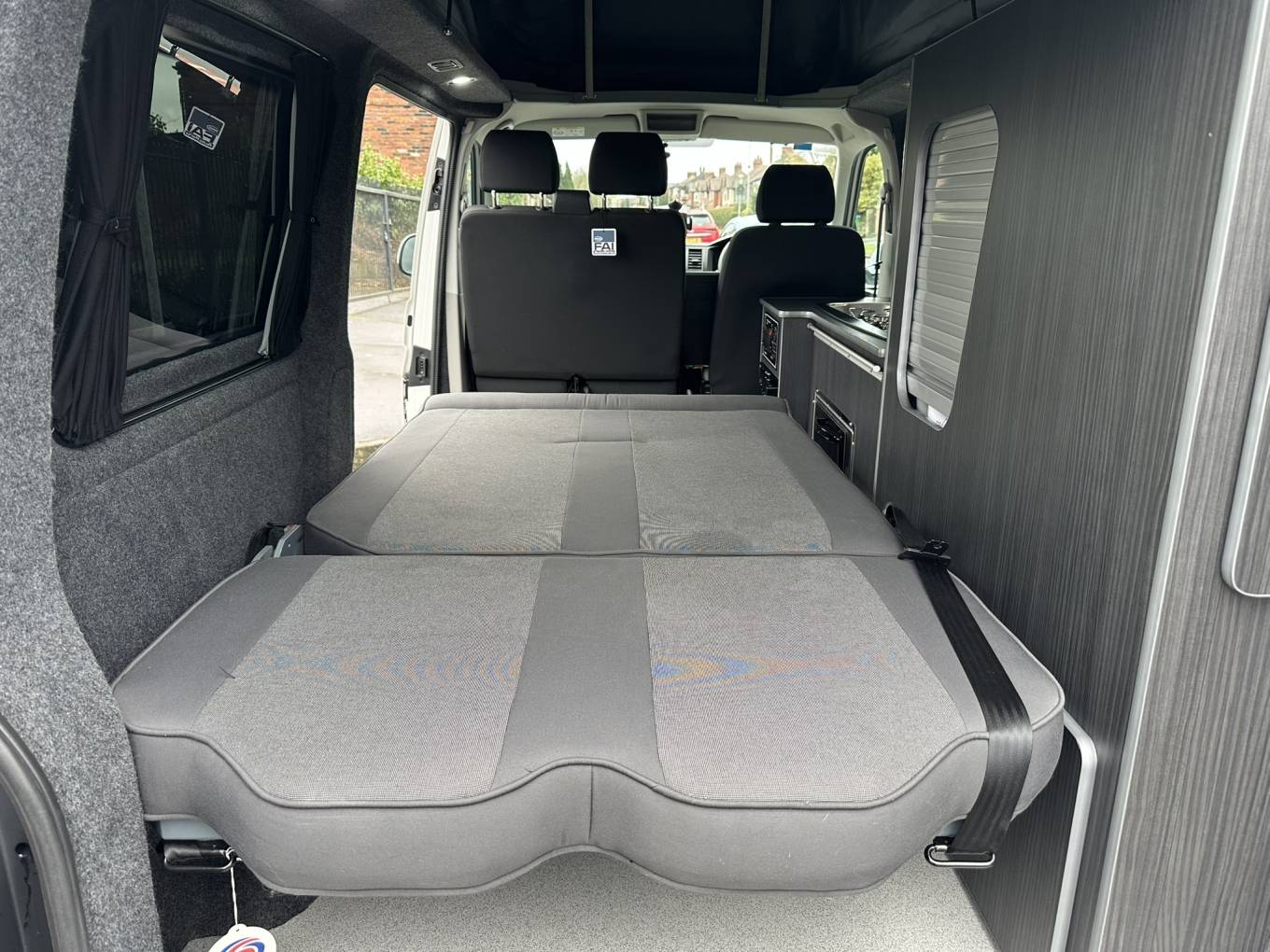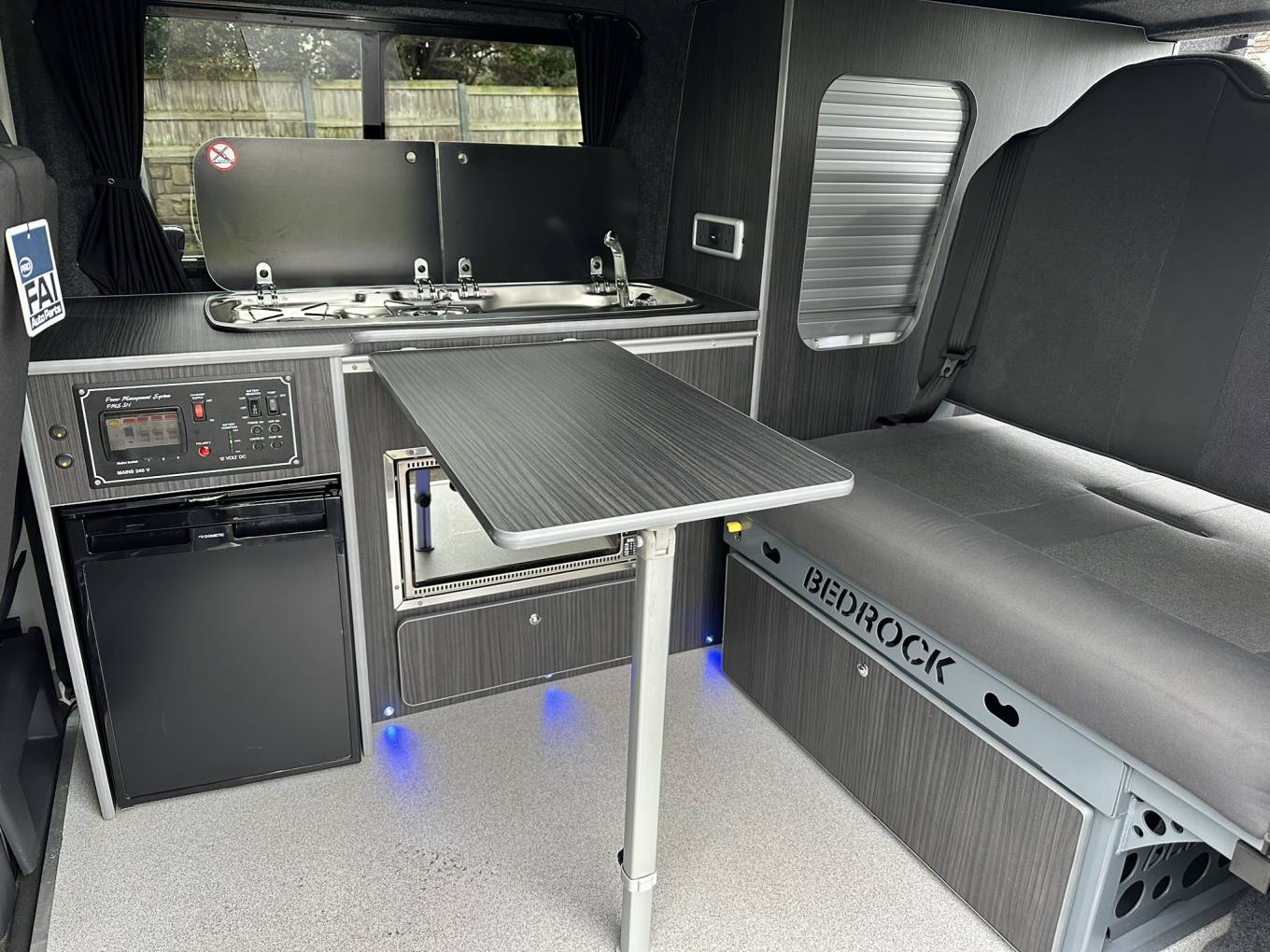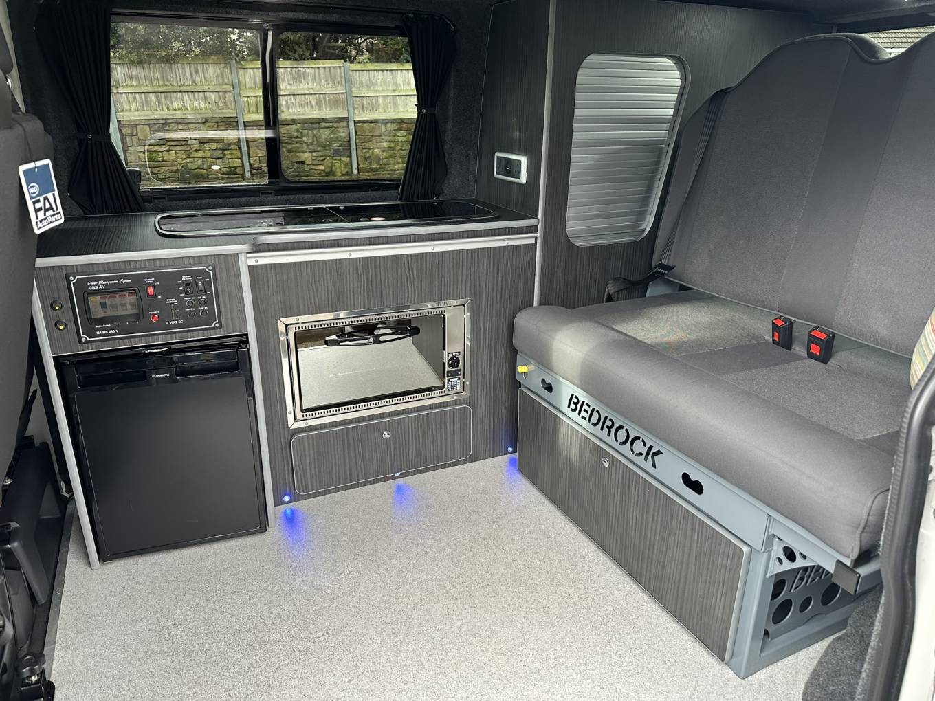 This campervan is equipped with a top-quality M1 tested Bedrock Rock and Roll bed, professionally installed by Vamoose Camper Conversions Ltd, a well-respected name in camper conversions.