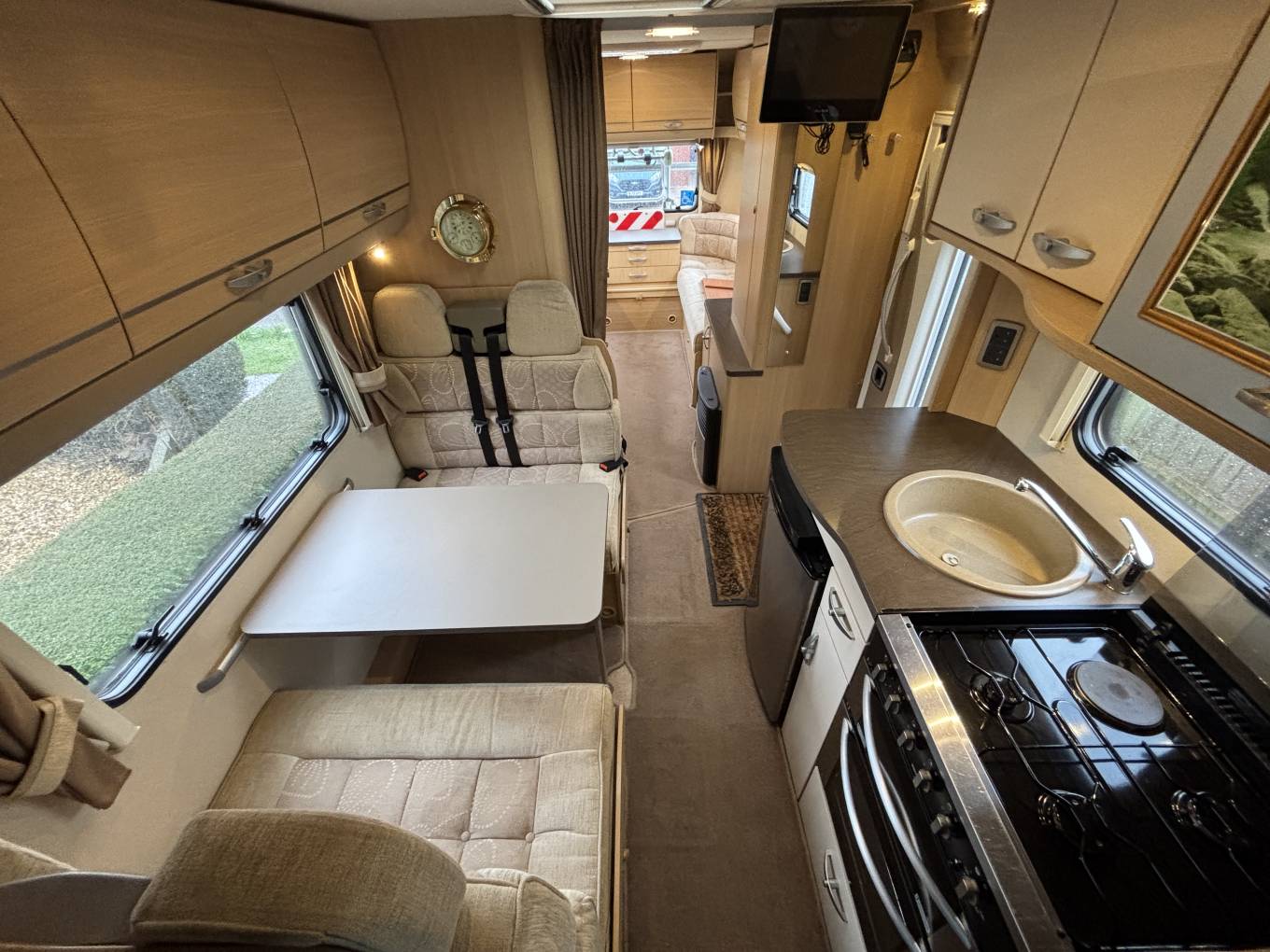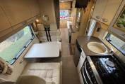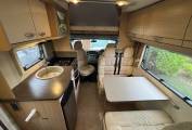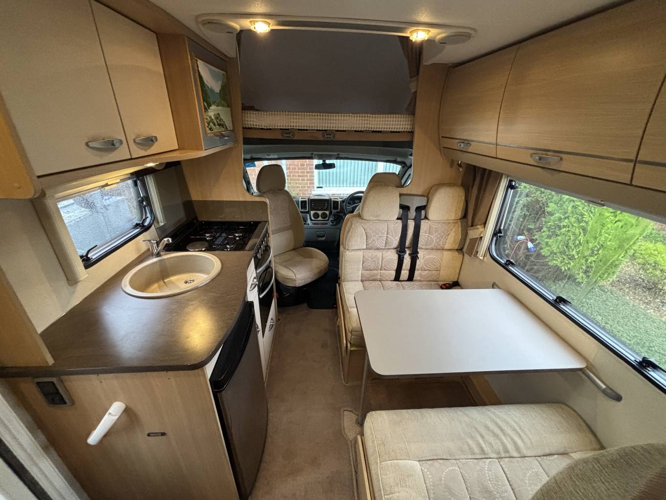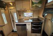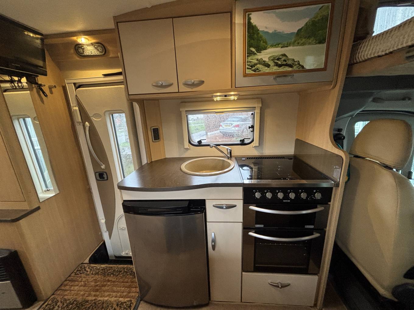 You enter the habitation area of the motorhome through a door on the passenger side of the vehicle with an electric step. To your left is the kitchen area, which has a Thetford fridge with icebox and a Thetford gas oven and gas/electric combi hob. There is a sink with mixer tap and worktop, and storage space both at eye level and under counter level.