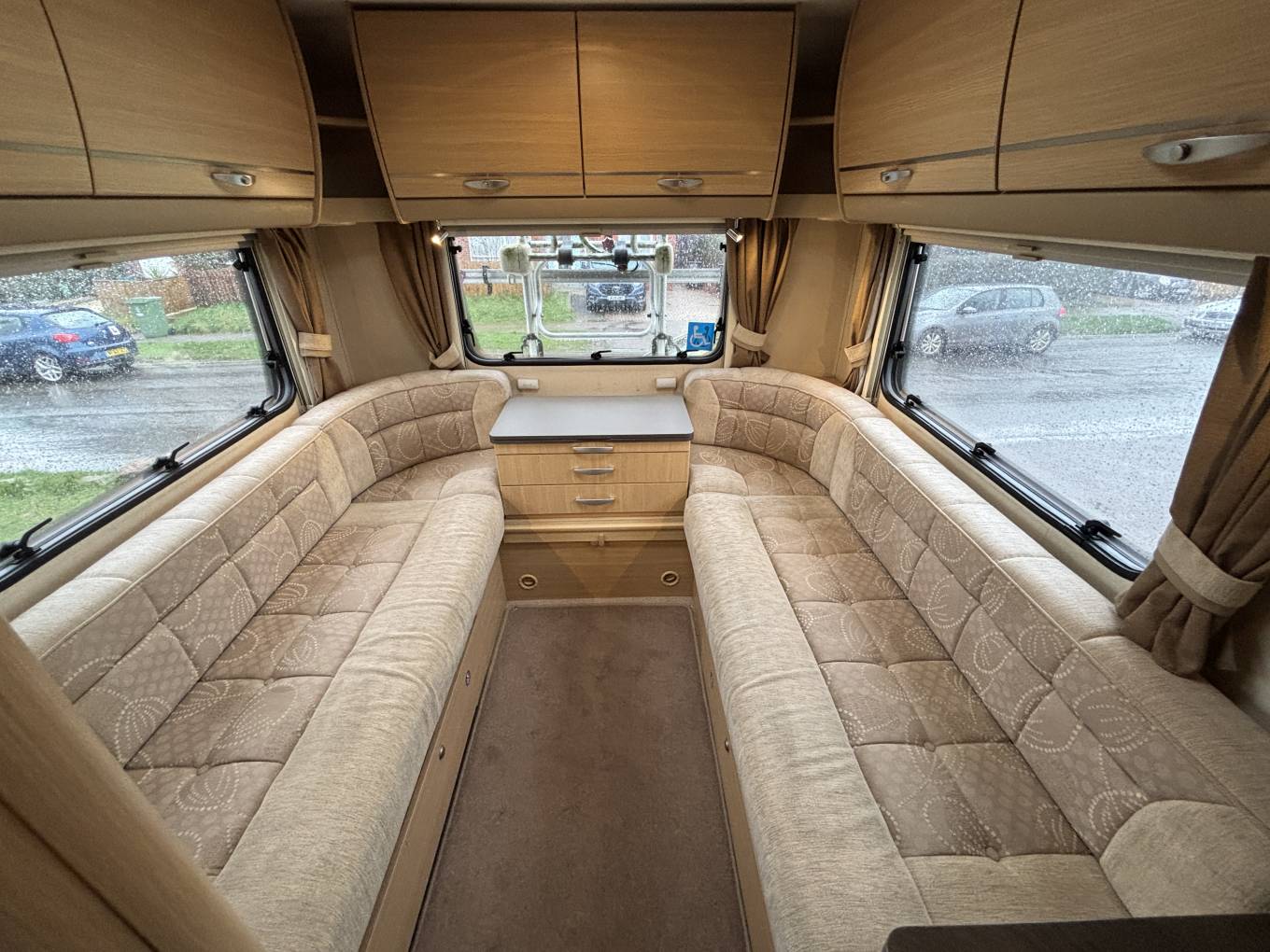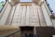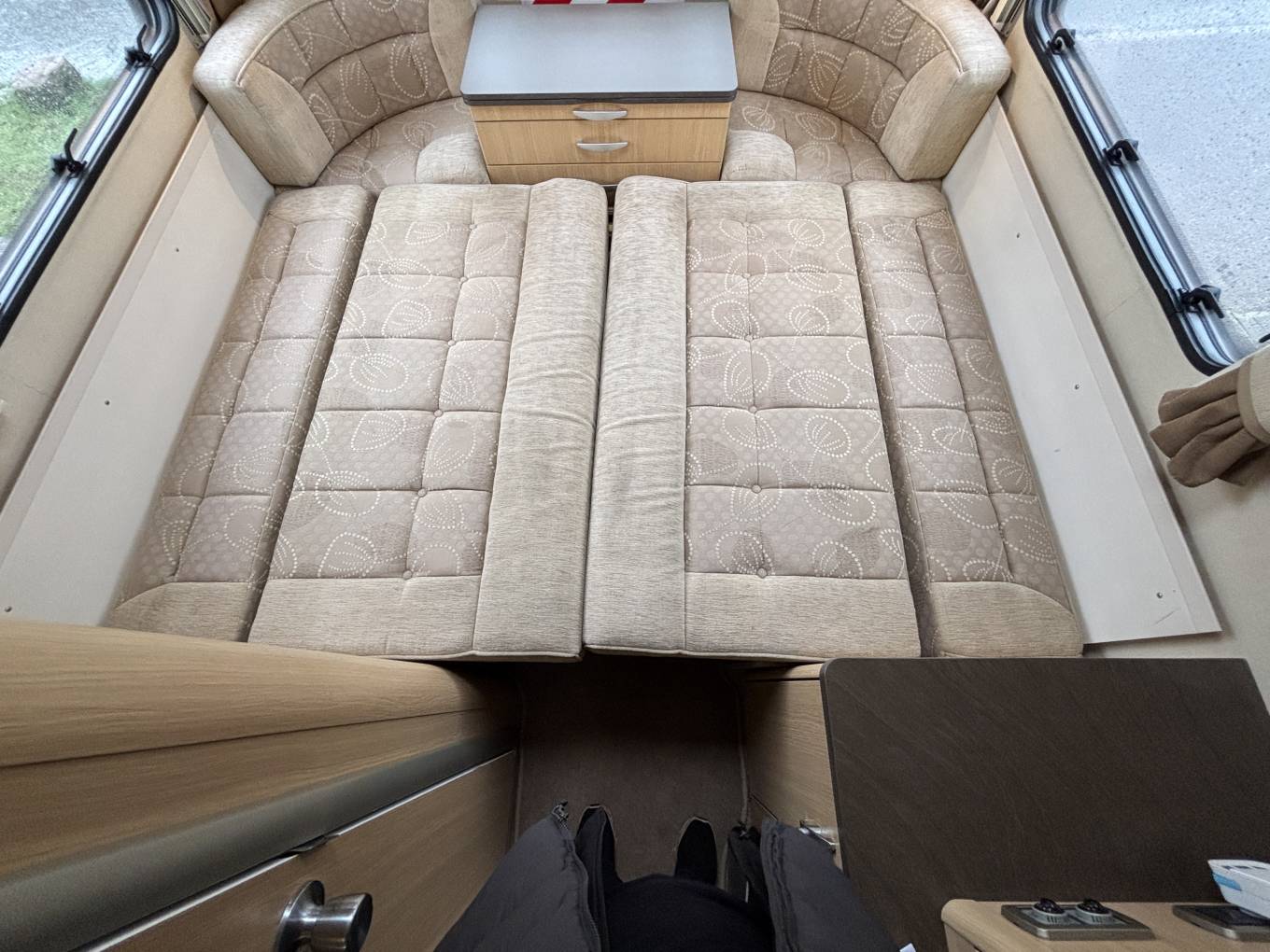 Opposite the kitchen area is the dinette with the table and rail table system which seats 4 and converts nicely into a small double bed. These seats with under storage are the belted seats which also benefit from the table while travelling. There are also 3 storage cupboards above where you will find the Sargent consumer box located.