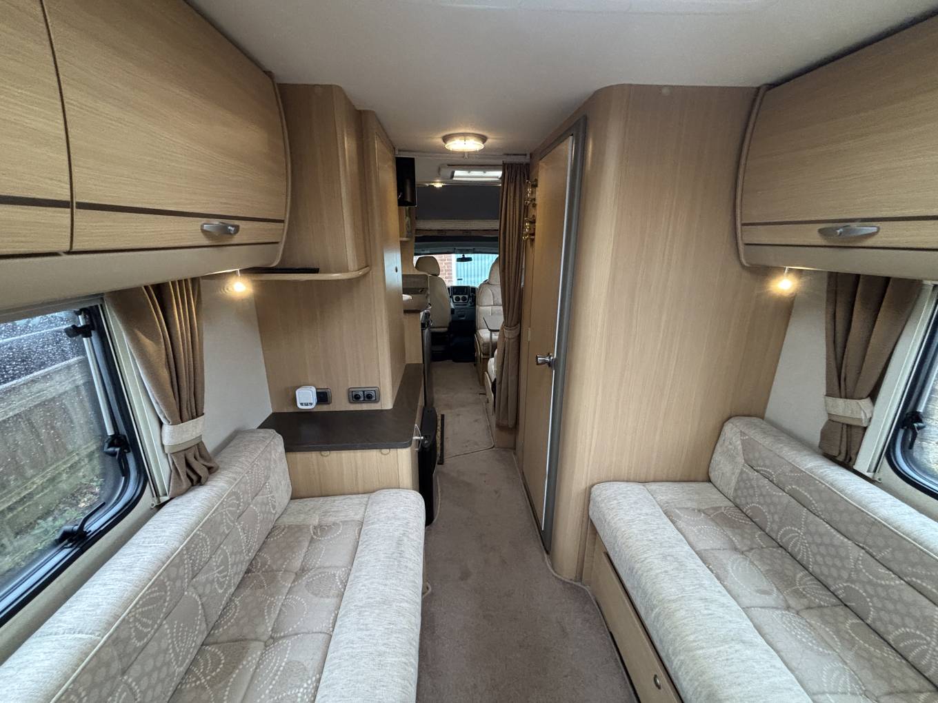 Some of the driving experience benefits of this Fiat motorhome are, air suspension, ABS, Bluetooth radio, electric and heated mirrors, electric cab windows and a factory fitted reversing camera. The motorhome is fitted with a gas & electric combination Truma hot air heating & hot water system and comes with a 6KG gas bottle. There are blinds and flyscreens throughout and the cab benefits from an integrated blind system.