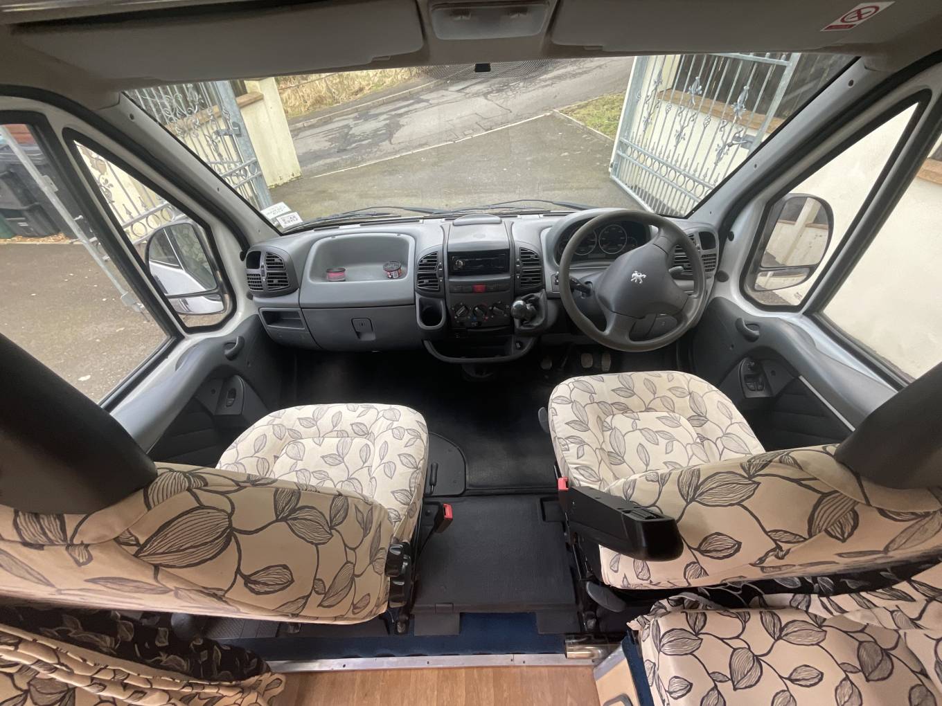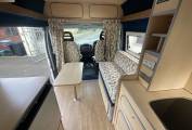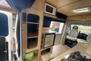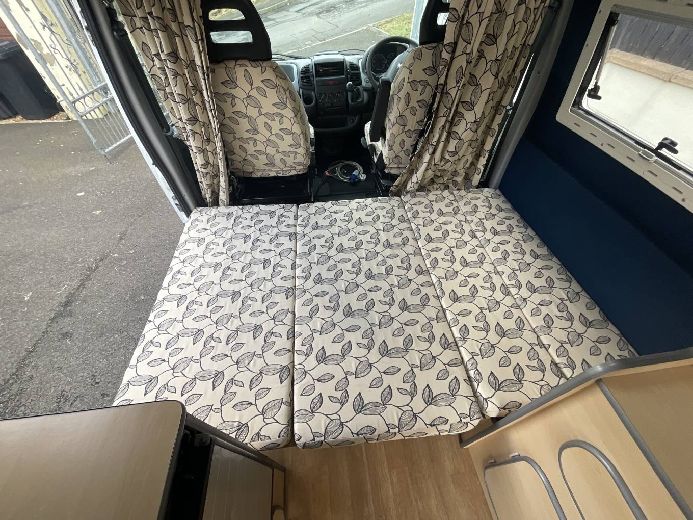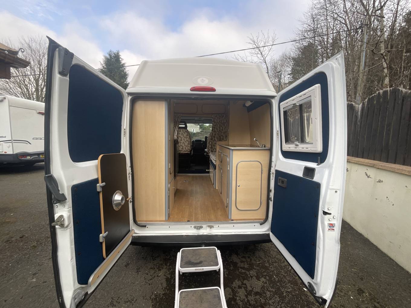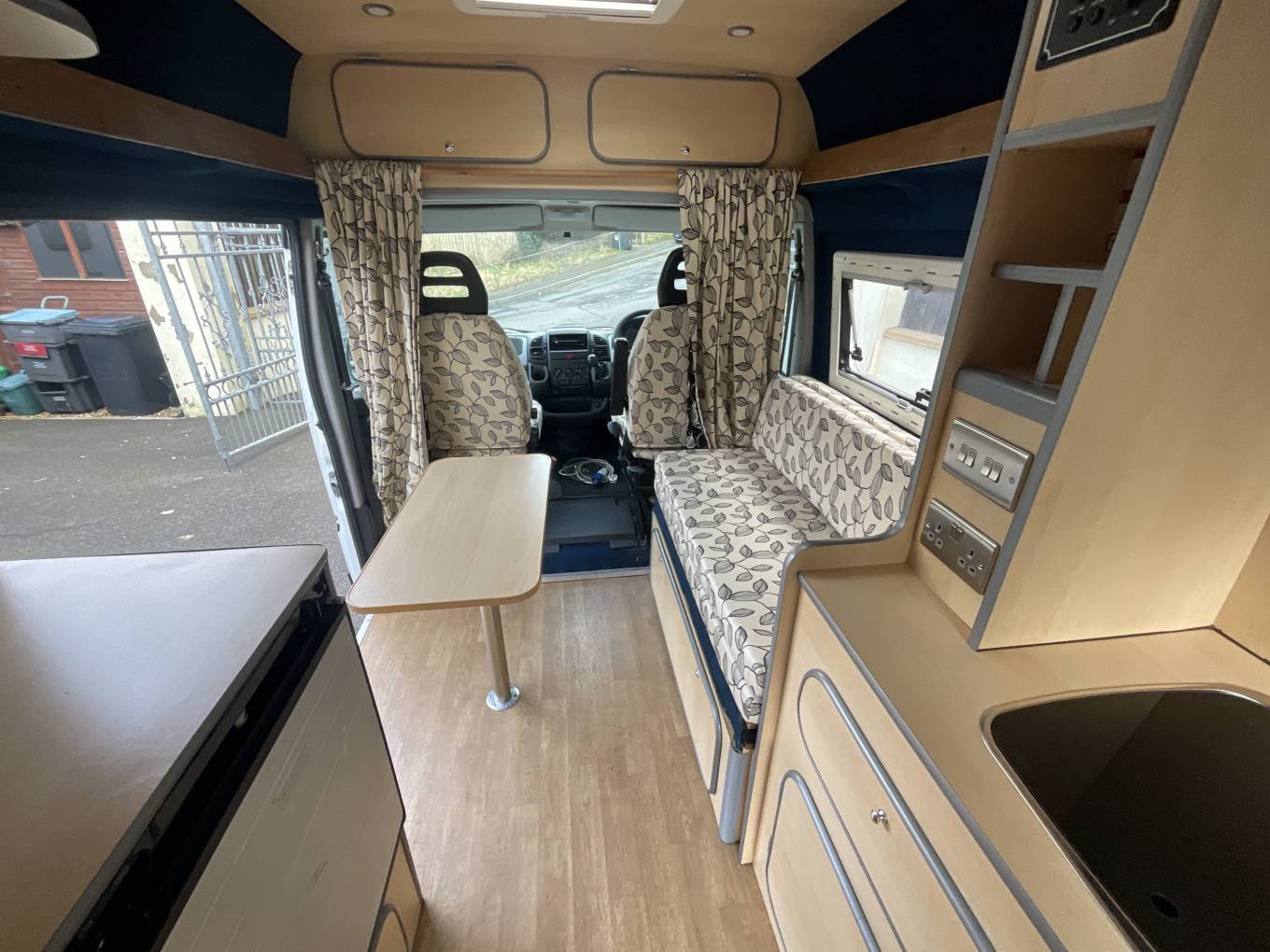Based on the Peugeot Boxer 2.2 engine 290LX SWB comes in under 5 meters so can go or park anywhere. The well equipped rear kitchen area comes with a triple gas hob, sink with cold water tap, fresh and waste water containers, two gas bottles, bespoke leisure battery, Dometic 3 way fridge, Microwave, Porta-Potti, and plenty of storage cupboards. The front bench seat, folds out to create a nice size double bed, 1200 x 1820. There is a removable table that stowes away in the rear doors to save space.