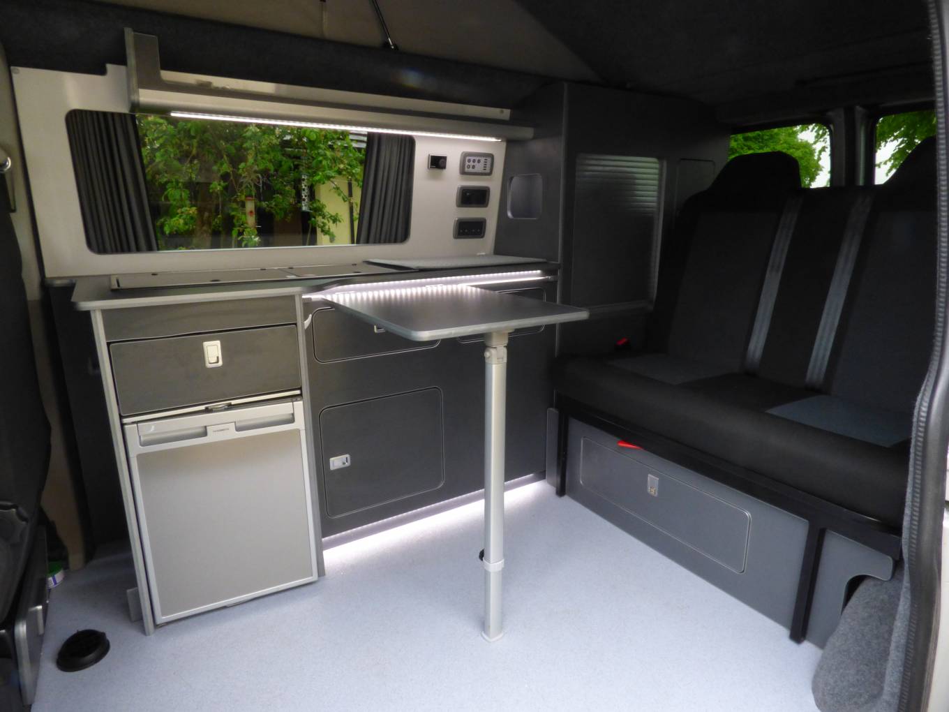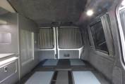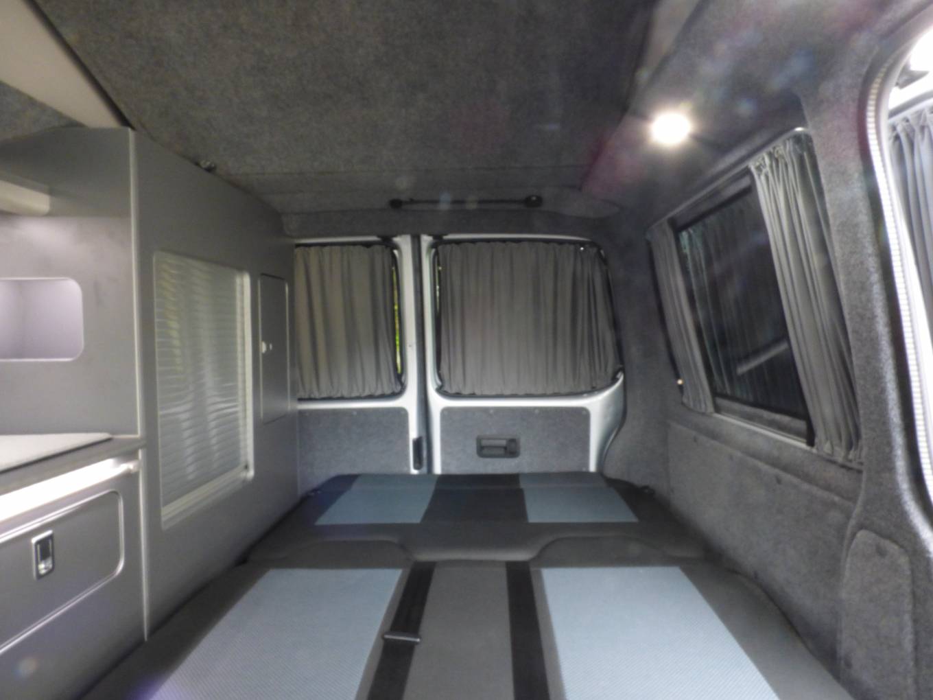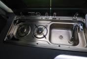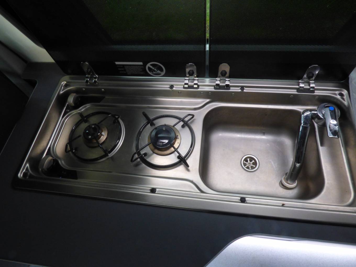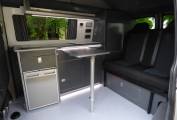 Converted by RocknRoll Campers in Consett and with a Skyline pop top roof, this top of the range vehicle comes with a number of significant extras to assist with off grid camping and some luxury. The cab has air conditioning, bluetooth, radio, heated front windscreen, cruise control and electric windows and mirrors. The double passenger seat swivels to provide more living space and convenience when using the full size rock'n'roll bed. The twin gas hob (with 2 gas canisters), sink with electric pump and underslung water tank, fridge with freezer compartment and various storage drawers and lockers provide some home from home comforts.