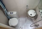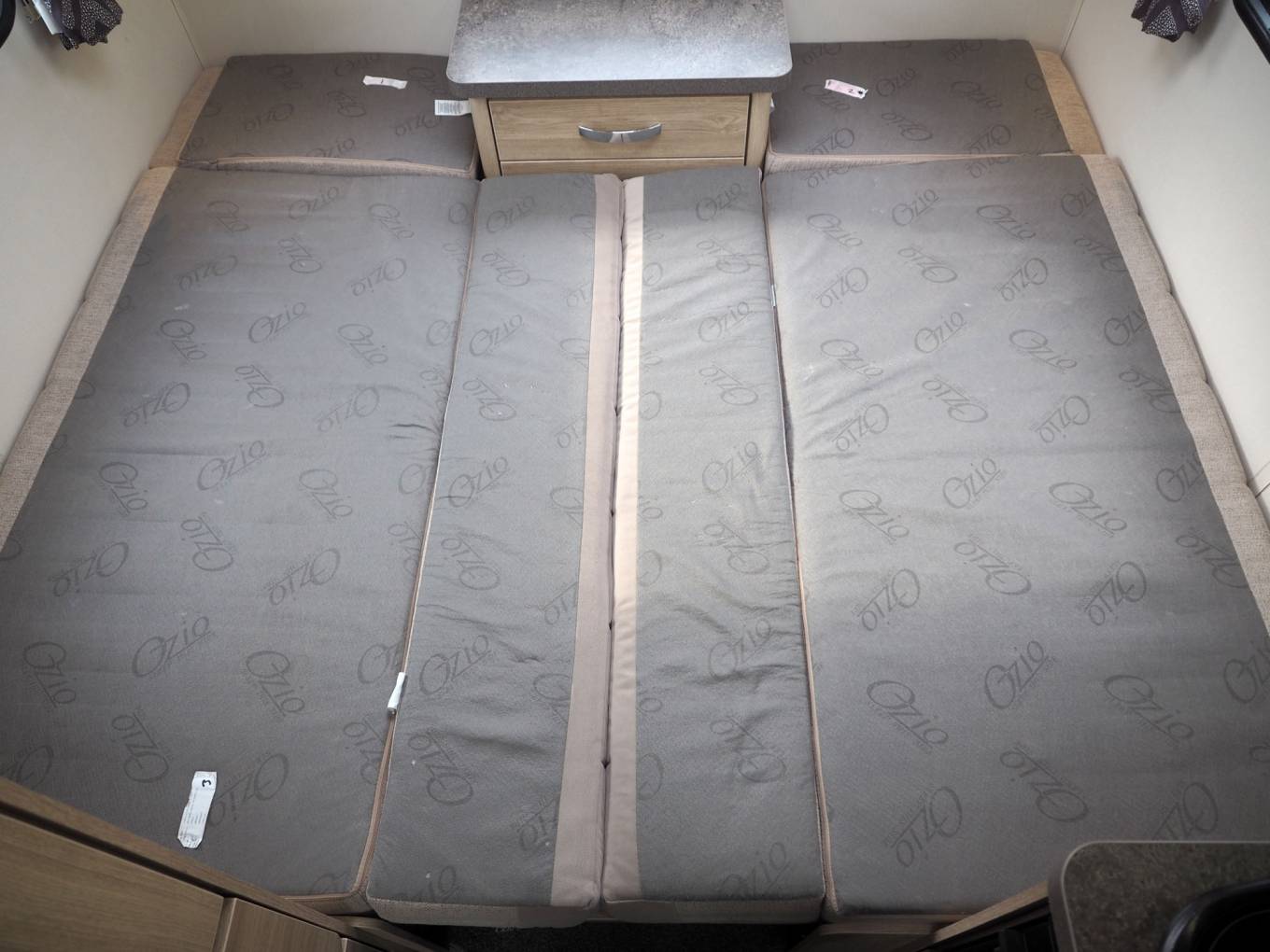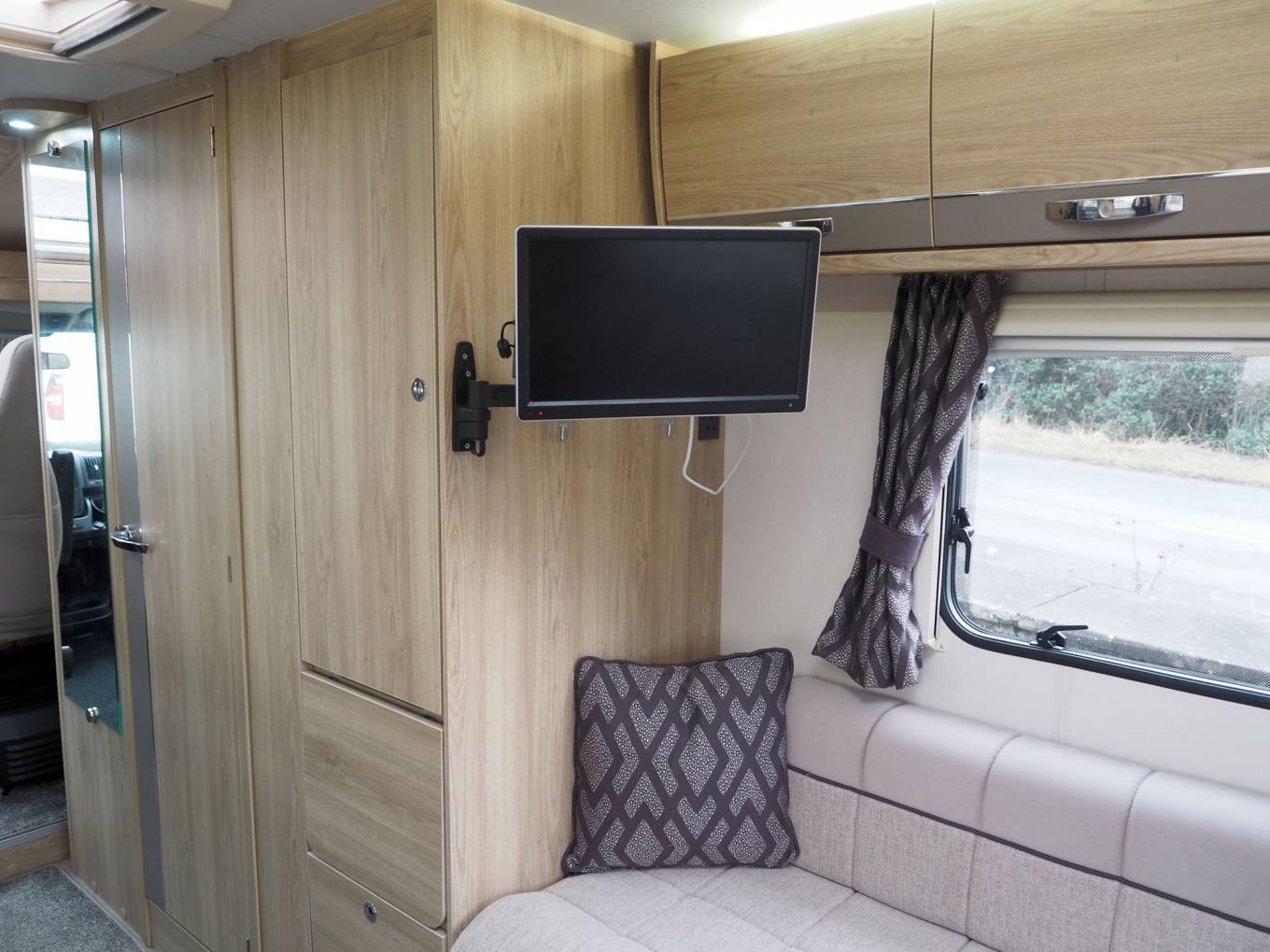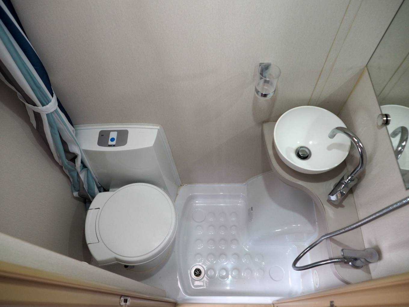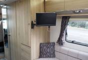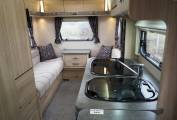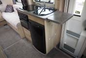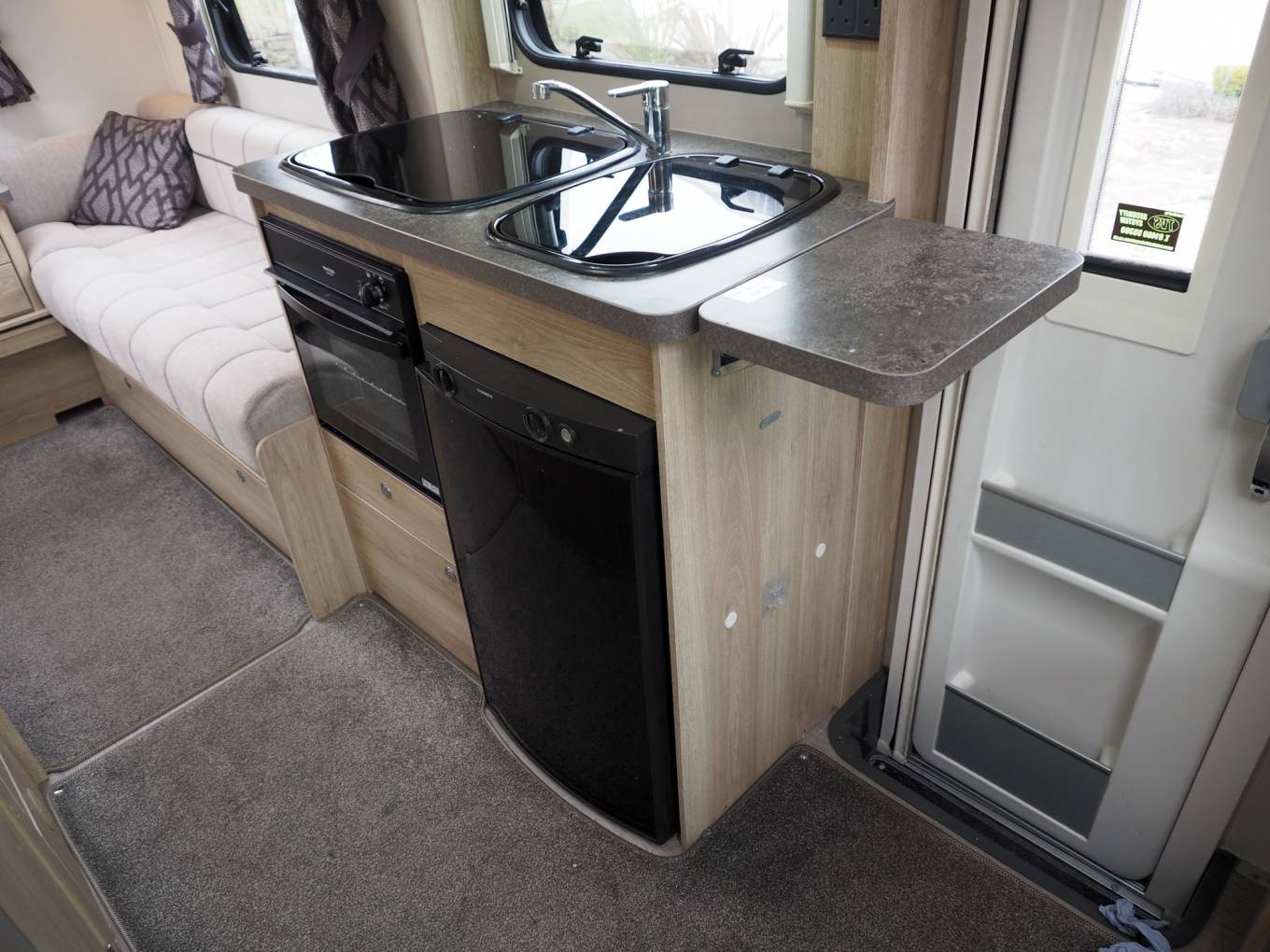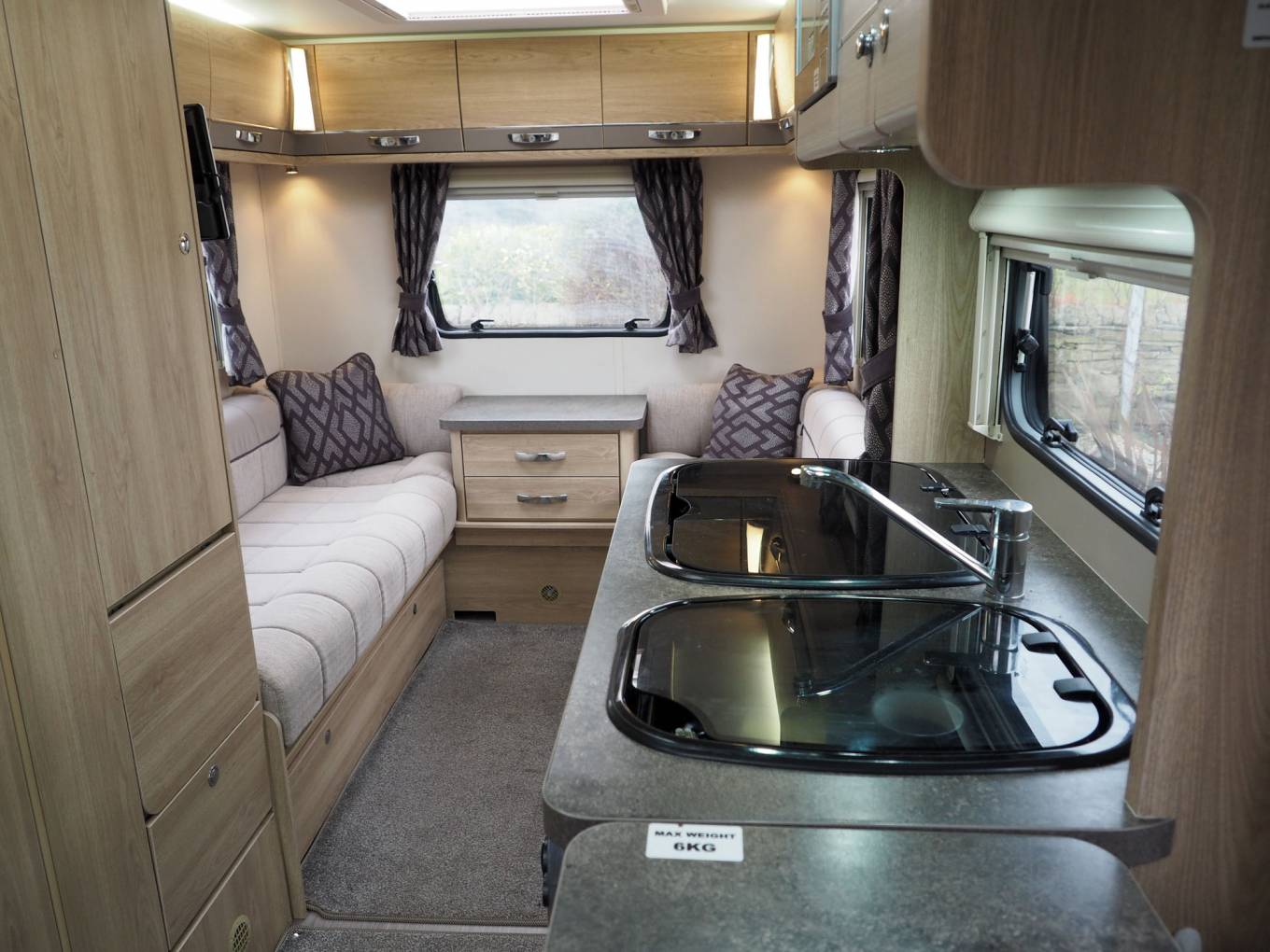 The rear lounge is an inviting space having twin settees which quickly convert into a double bed. There is good storage here too and a fitted TV combo connected to a roof aerial for entertainment. Midships, you will find a comprehensively equipped kitchen with 3 burner gas hob, gas oven and grill, fridge and microwave, plus pop up worksurface, lockers and drawers, opposite the washroom having toilet, vanity sink and shower with curtain. There is a good sized wardrobe and another pop up table facing out into the aisle.