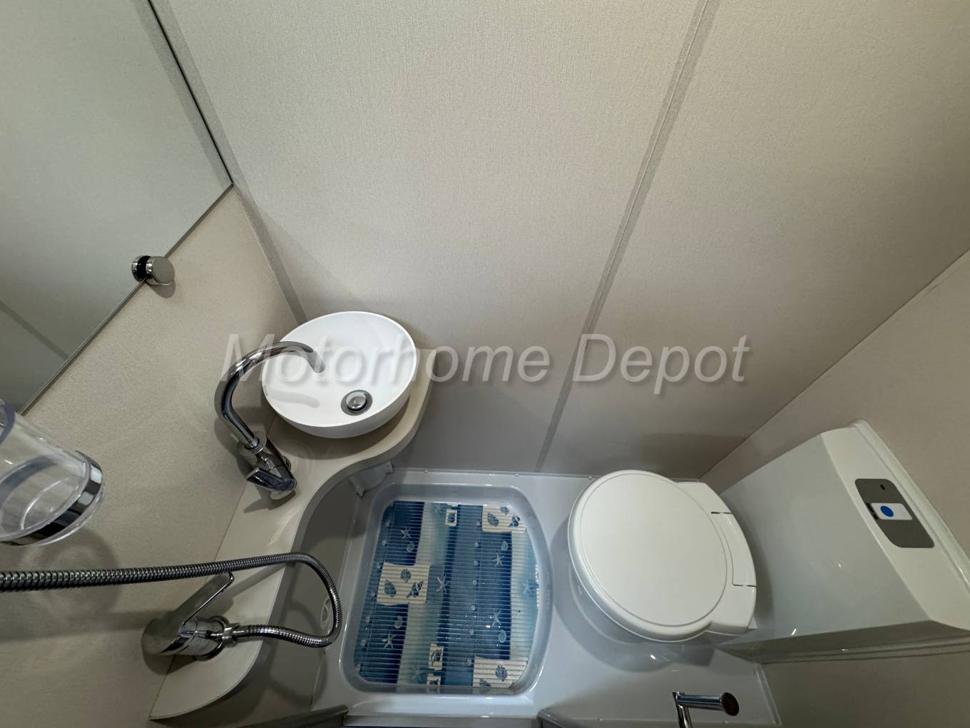 Next to the kitchen is the washroom which has a Thetford cassette style swivelling head toilet with electric fresh water flush, a designer round wash hand basin with swan necked designer chrome mixer tap. A good sized shower curtain and separate tap to control the shower handset, which is fitted to a rising rail. A good sized wardrobe is provided with hanging rail next to the bathroom.