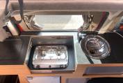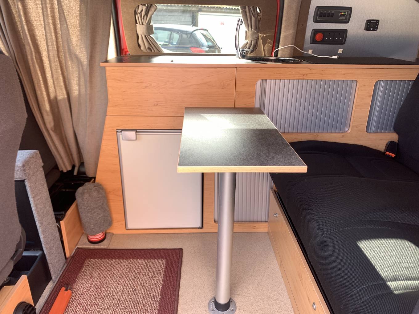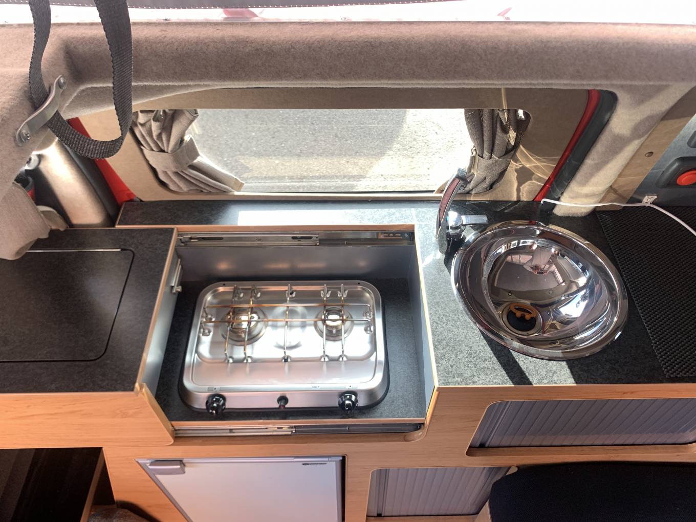 It has the added benefit of an Eberspcher diesel heater for all year round use, a 2 burner gas hob and stainless sink supplird by the onboard water tank.