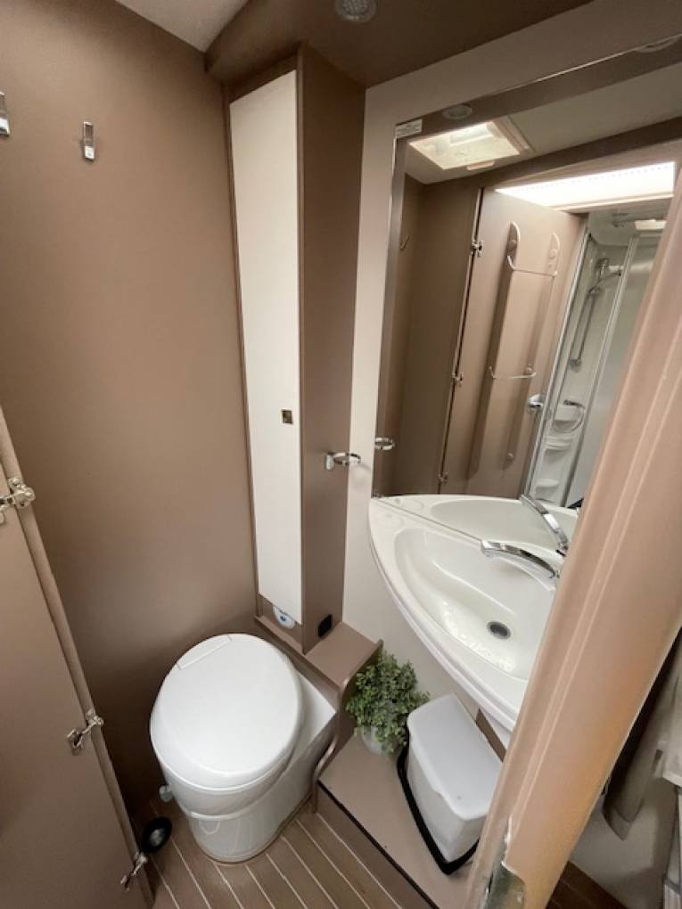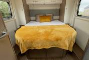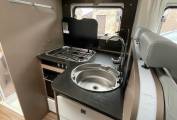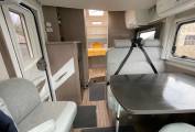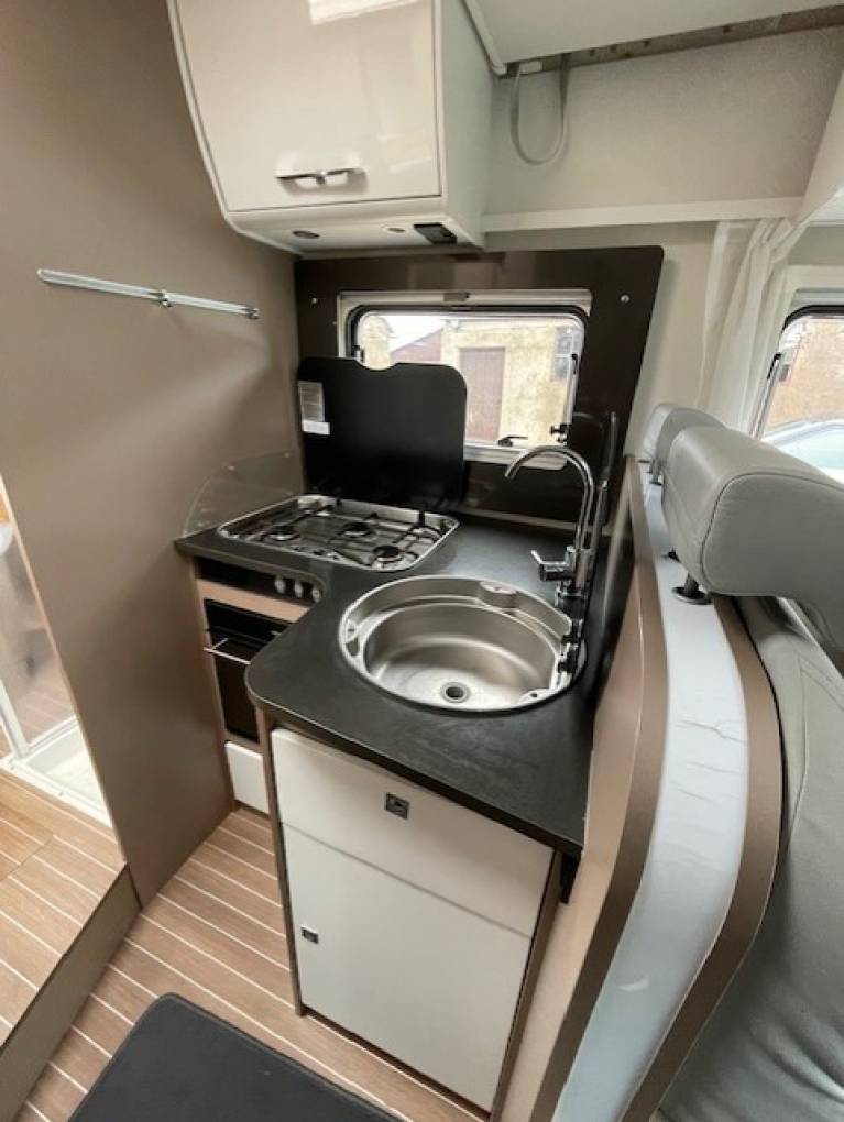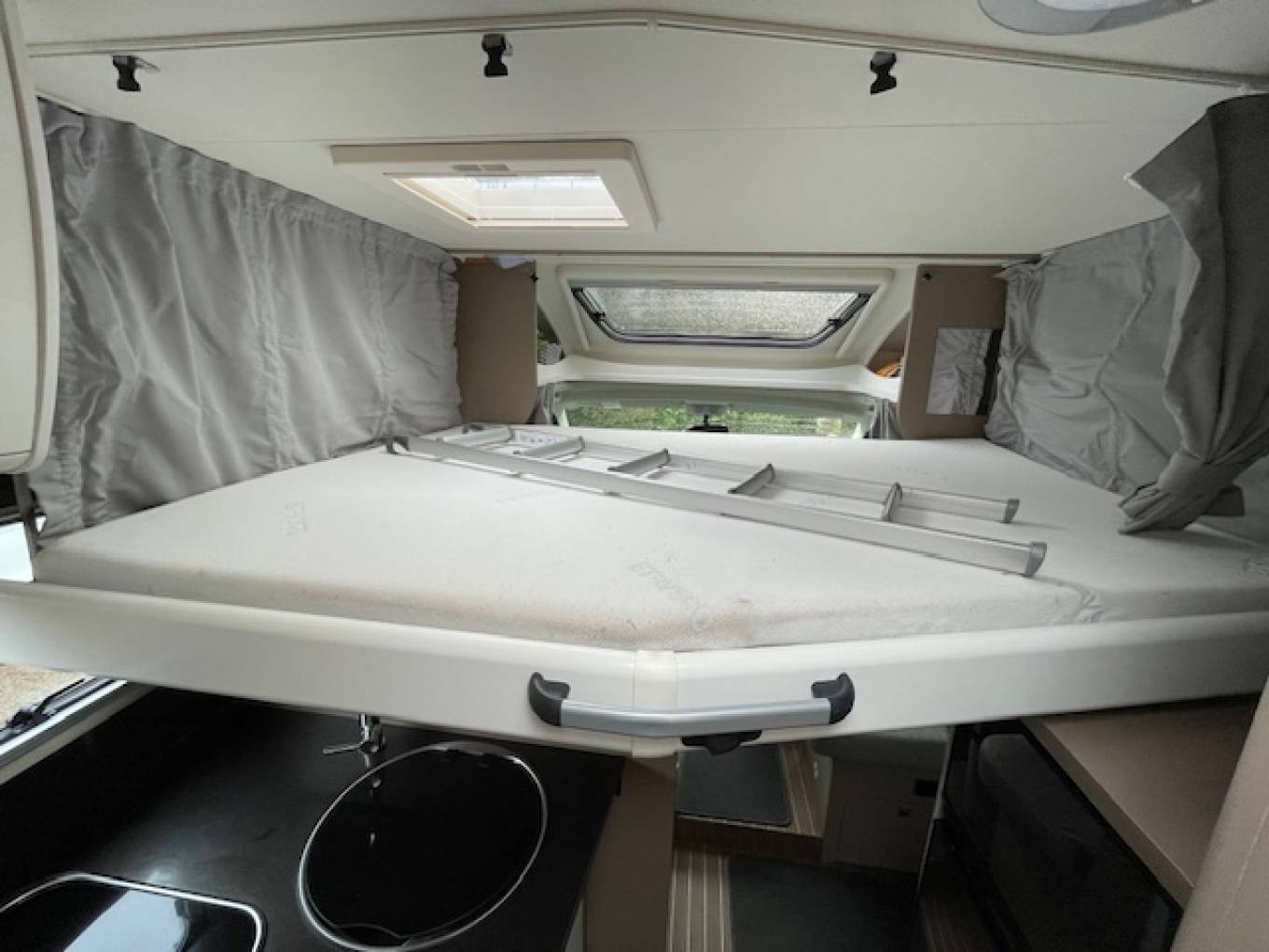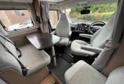 At the rear you have an island bed with good storage underneath. Washroom has a separate shower cubicle and a separate bathroom with a wash hand basin, cassette toilet and a vanity mirror. Kitchen is fully functional with a gas burner hob, grill, oven, large fridge freezer, sink with mixer tap and good storage throughout the habitation area. Lounge /dining area is comfortable allowing your front captains chairs to swivel round. Above the lounge your drop down double bed will accommodate 2 people. At the rear you have a garage area for travel essentials.