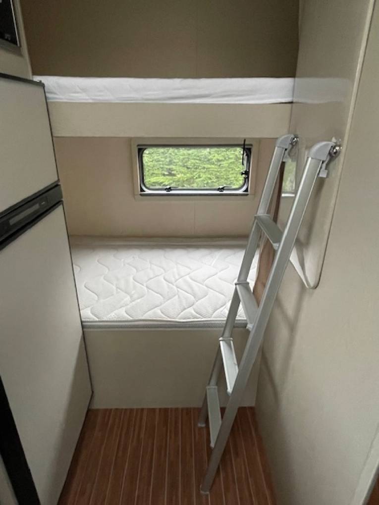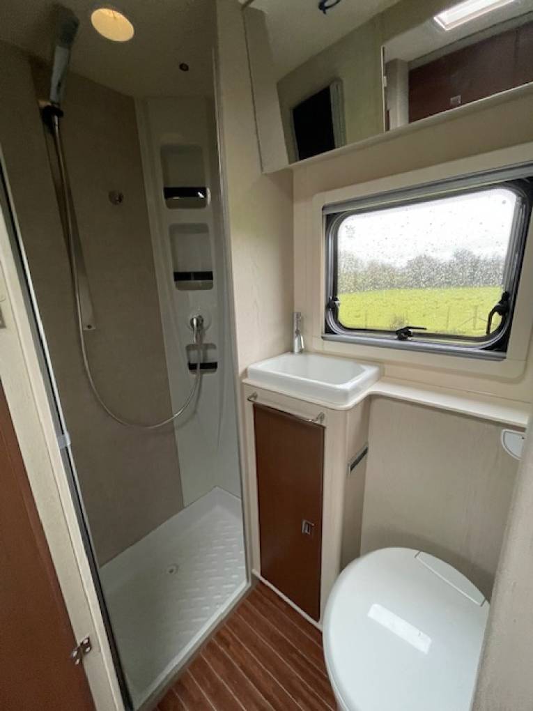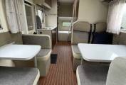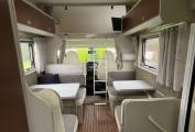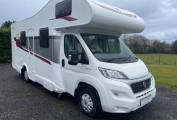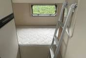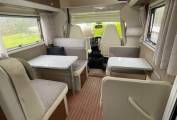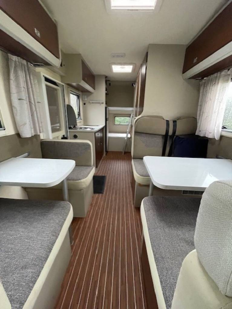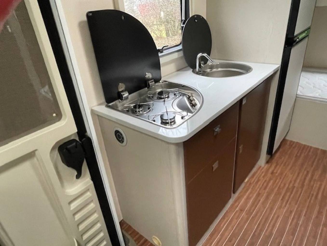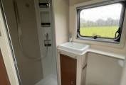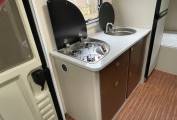 The layout consists of bunk beds at the rear, an over cab double bed and a spacious front lounge. This area makes up into a double and a single bed. Washroom has a separate shower cubicle, wash hand basin and a cassette toilet. Kitchen is fully functional with a 3 burner gas hob, oven, sink and a large fridge freezer.