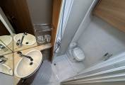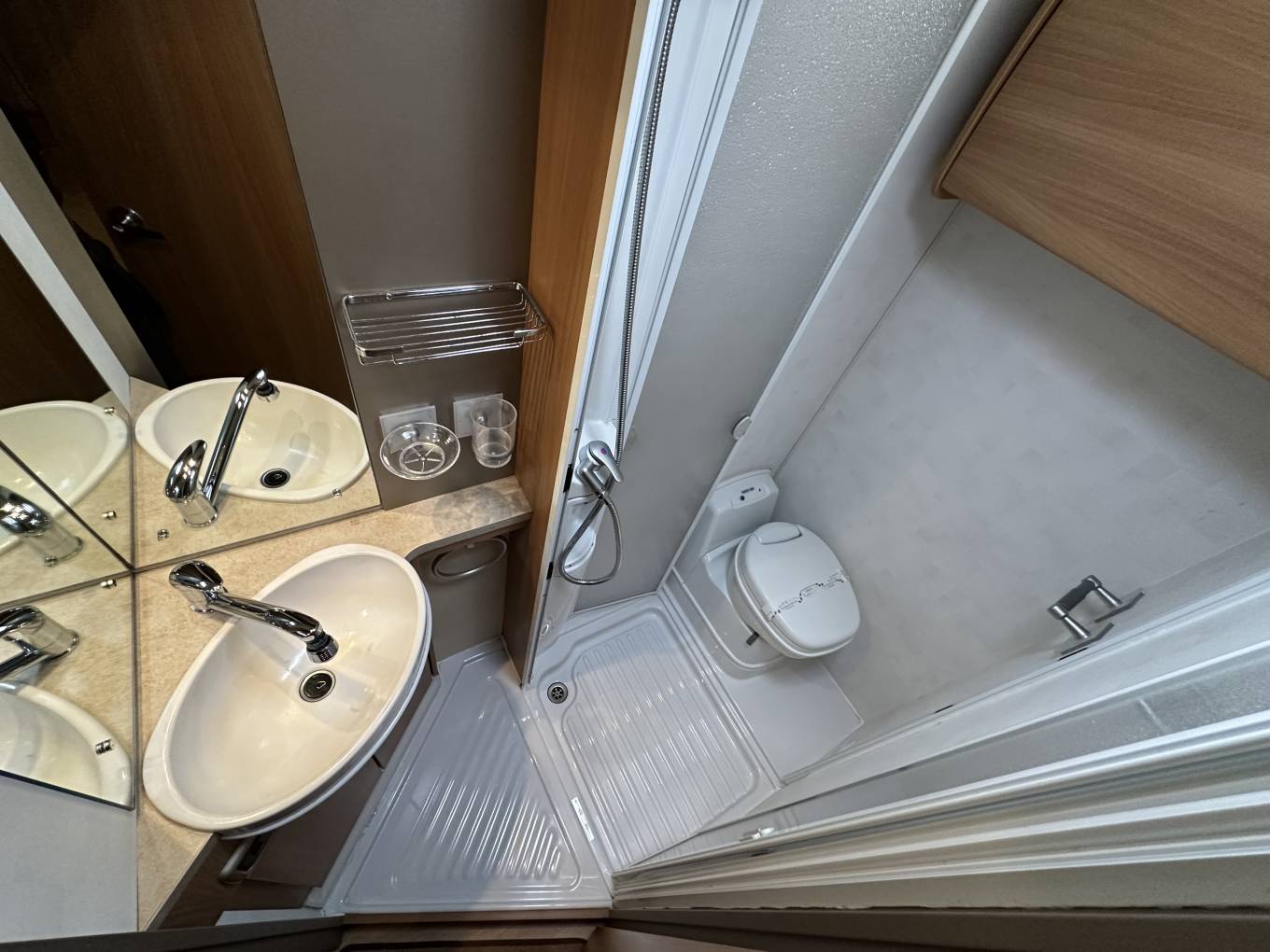 At the rear of the vehicle, on the offside, is a wetroom with a toilet, a hand basin, and a shower that can be screened off.