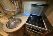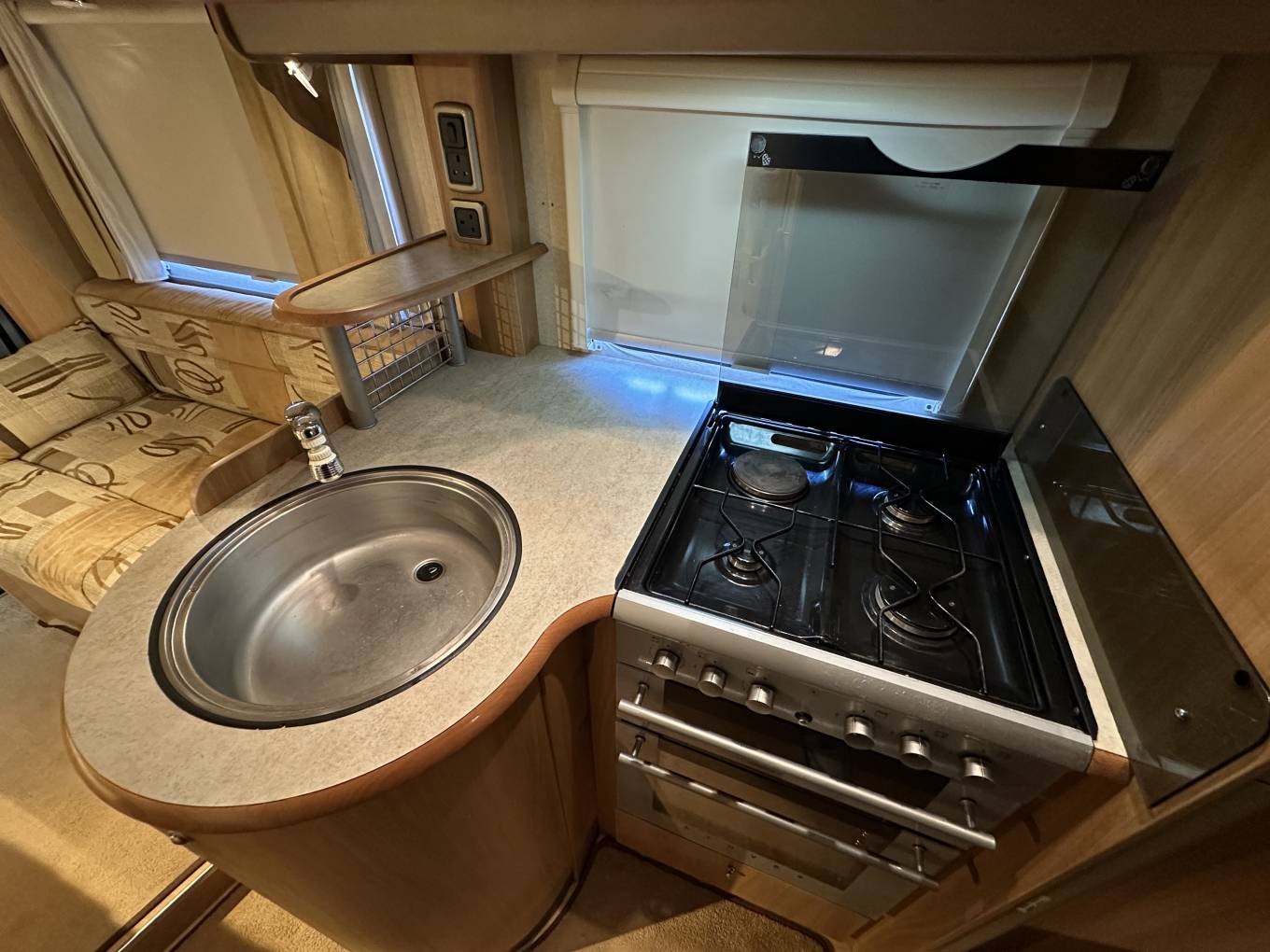 Progressing through the vehicle there is a nearside central kitchen complete with a sink, an oven, a grill, a hob with 3 gas burners and an electric plate, and opposite, by the habitation door, a fridge and a separate freezer.