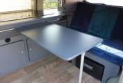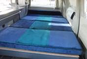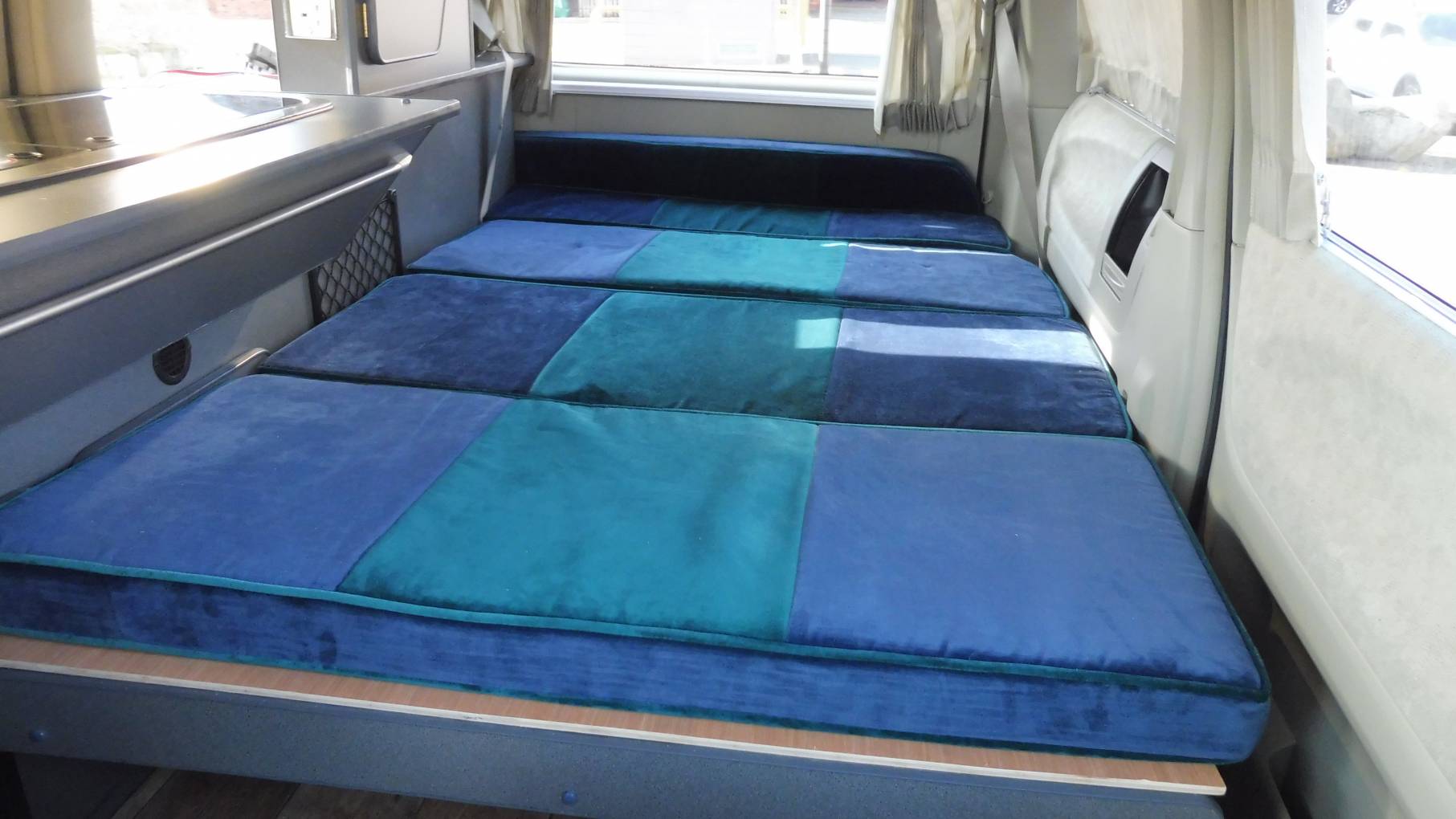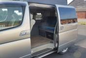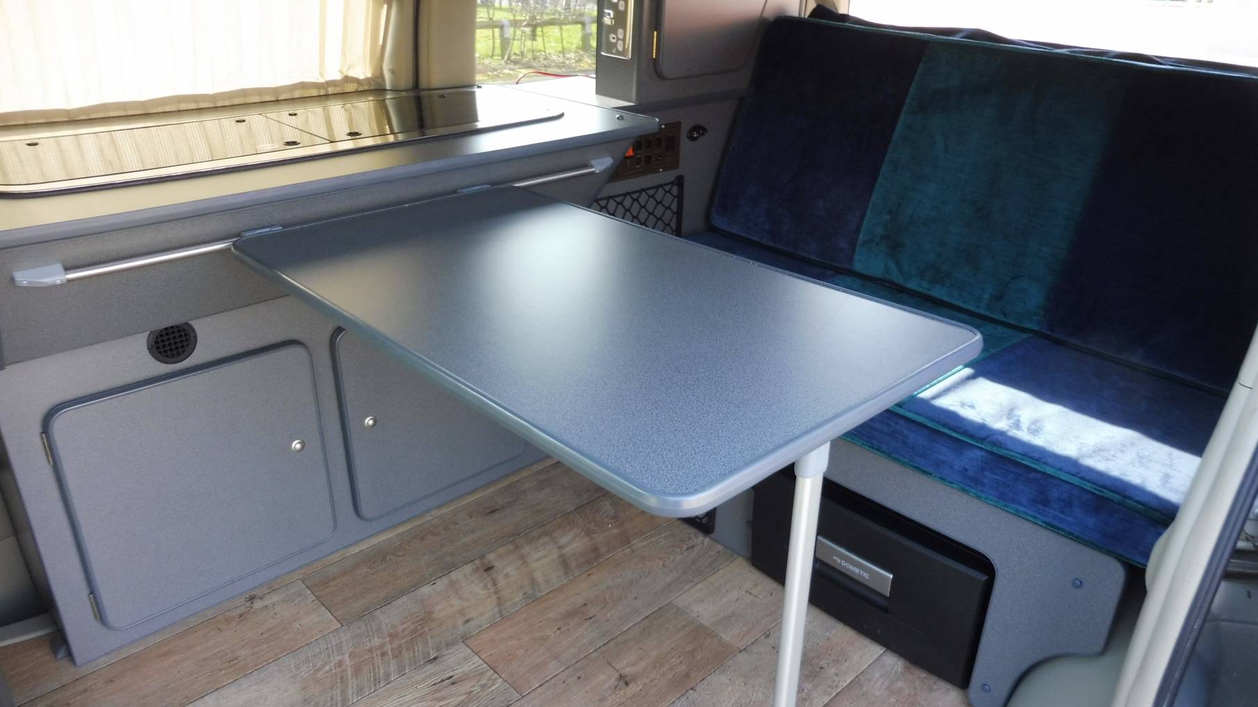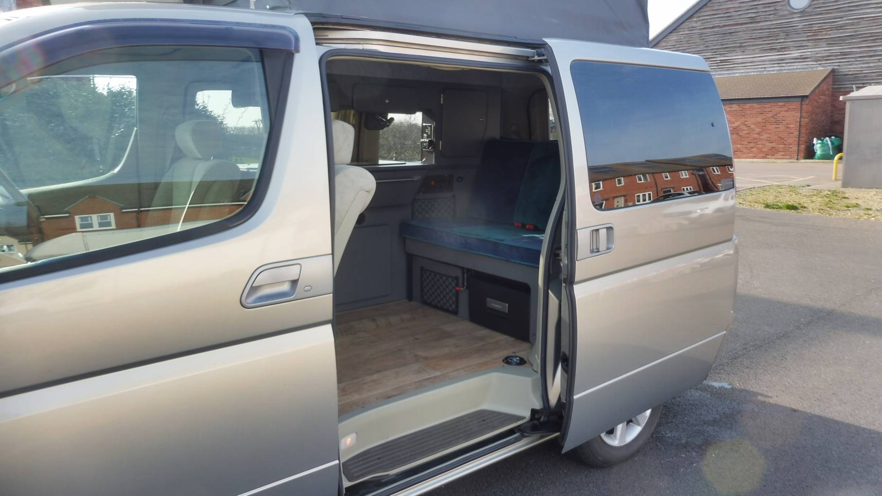 The campervan conversion features the super headroom Mushroom Roof with zip-out window, allowing a great space for children’s sleeping accommodation. The passenger seat swivels into the main cabin area with side kitchen, huge 47-inch Rock ’n’ Roll bed and enormous floor space.