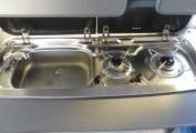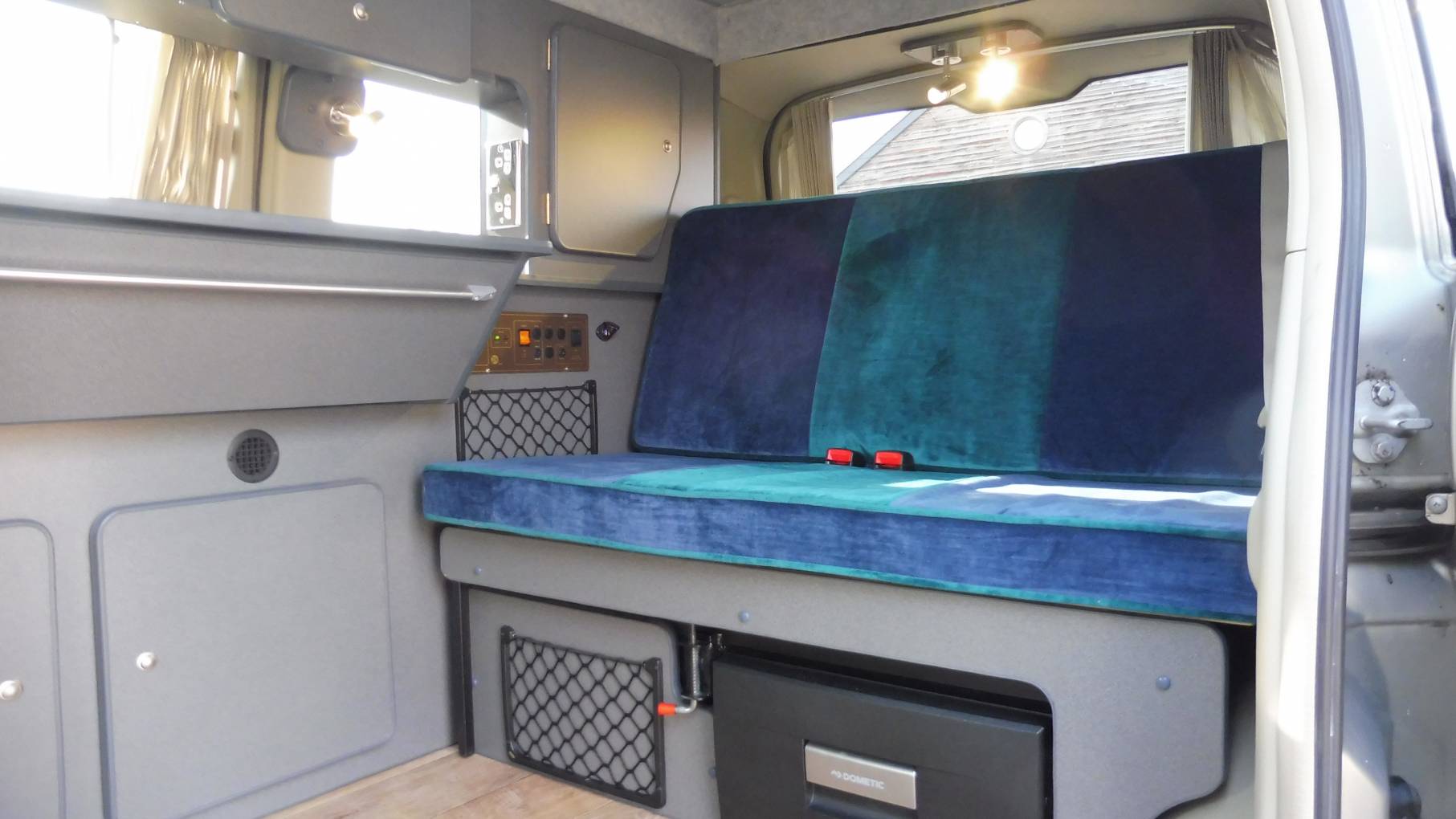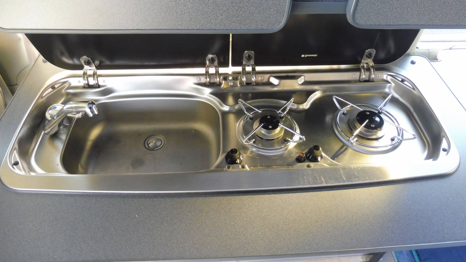 The kitchen comprises a Dometic 2-burner hob with cold water sink. There is a large Waeco fridge drawer to be found under the bench seat and a range of storage locations throughout. Mains electric and USB sockets ensure you can keep all your appliances in full working order.