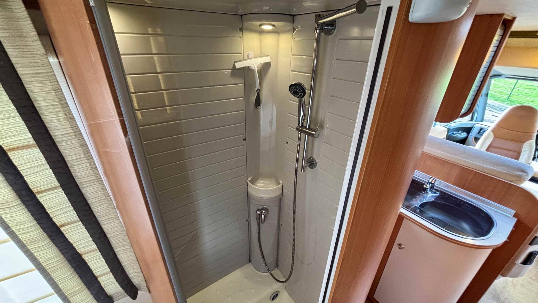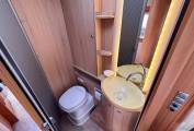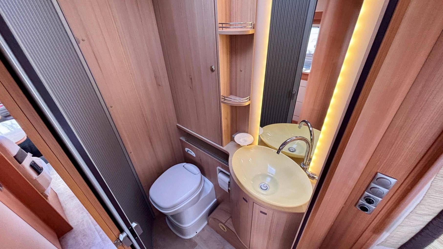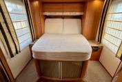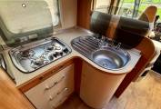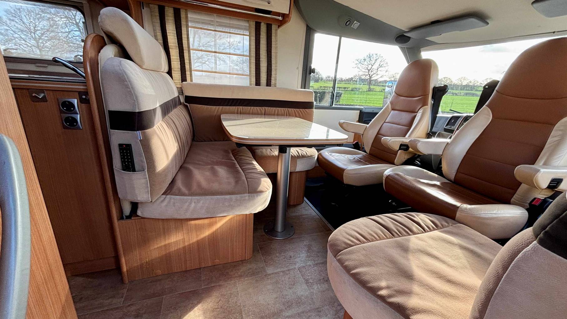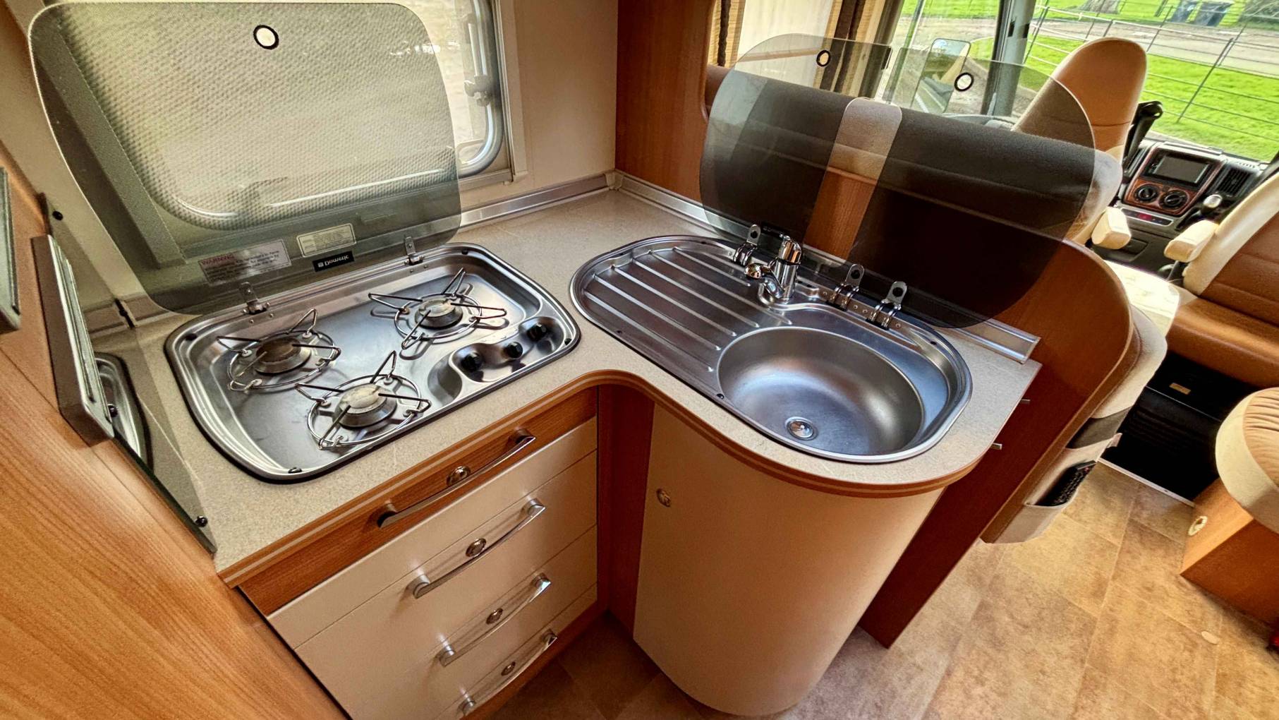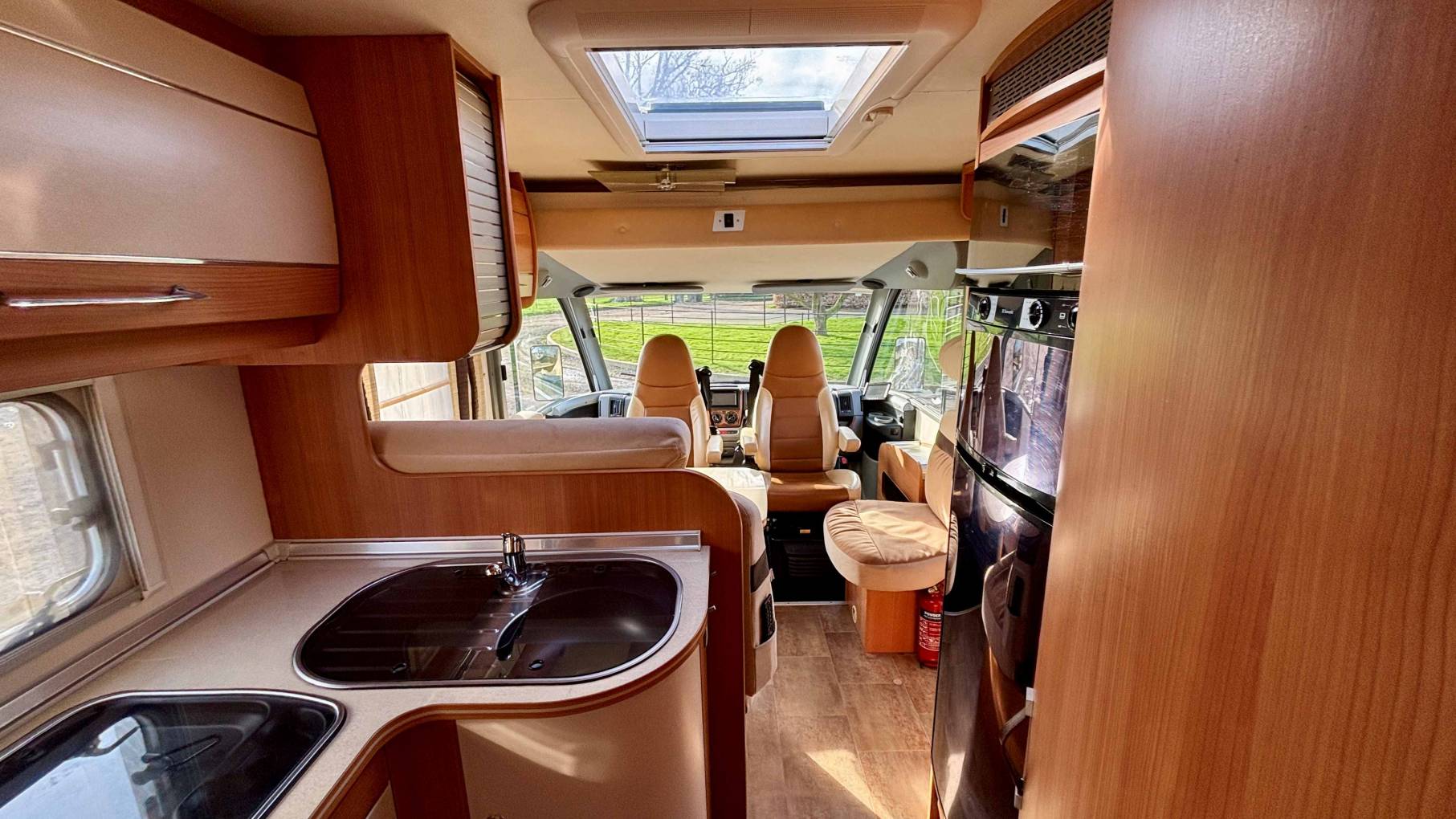The layout consists of a fixed island double bed to the rear which electronically reclines to create more space and allows you to sit up whilst reading/watching TV, off the bedroom is the separate shower cubicle to one side and opposite is the well-appointed washroom with Thetford swivel bowl toilet and wash hand basin. Additional sleeping is provided in the double drop-down overcab bed. The well-appointed mid-section kitchen comprises of a 3-burner hob, sink with drainer, combi oven grill, 3-way fridge and plenty of storage for all your essentials. Moving forward you have your lounge area where you will find twin forward facing belted seats, a seat to the right of the door and another opposite. Combined with the swivelling driver’s and passenger Captain seats and a pedestal table moveable in all directions for dining this is a comfortable area that can seat up to 6.