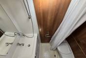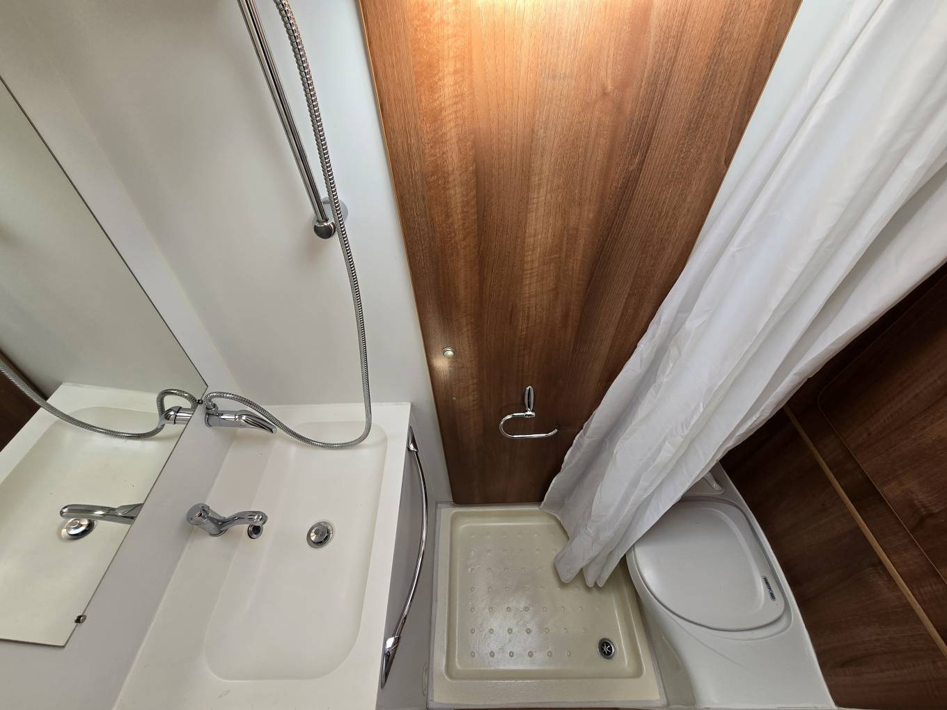 washroom with shower pod, toilet and vanity basin. Towards the front you have