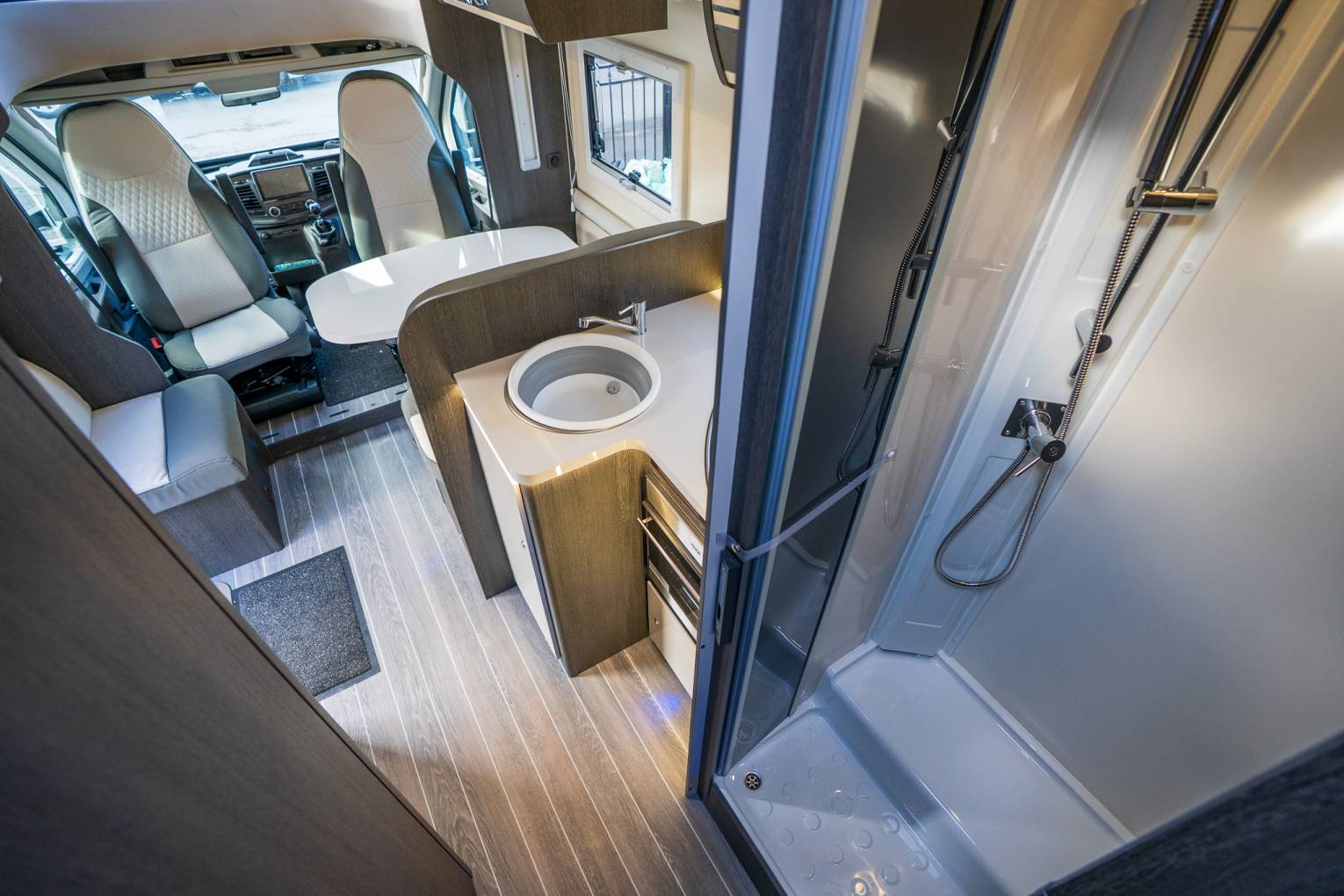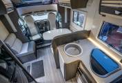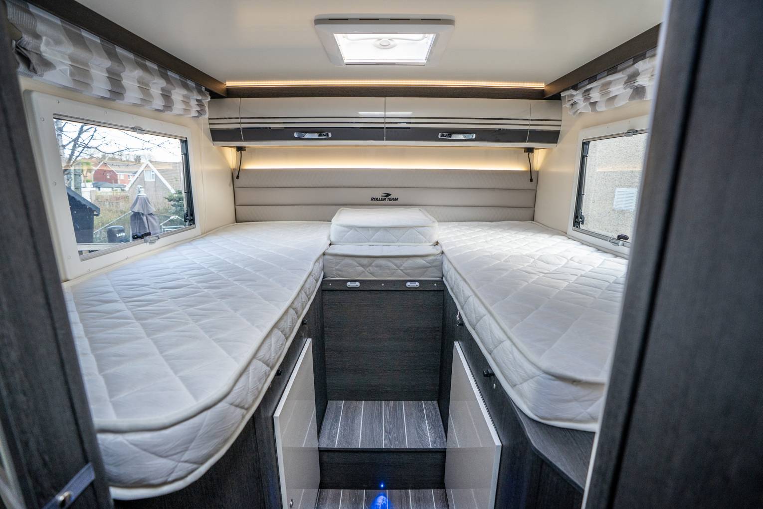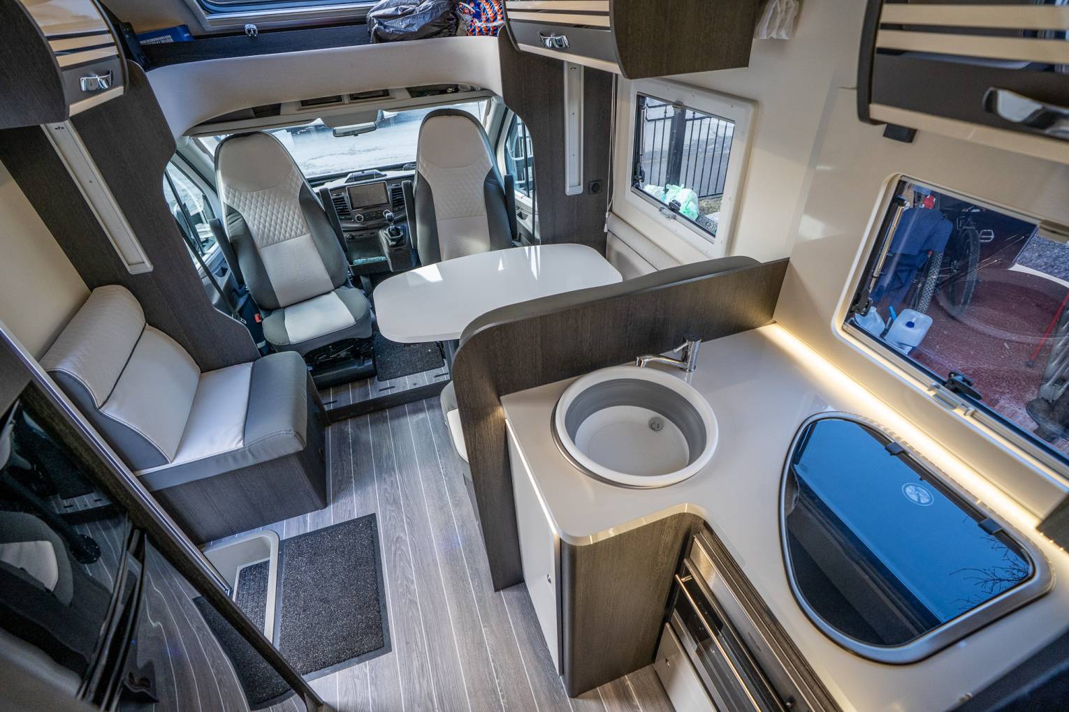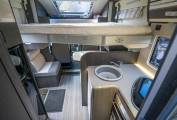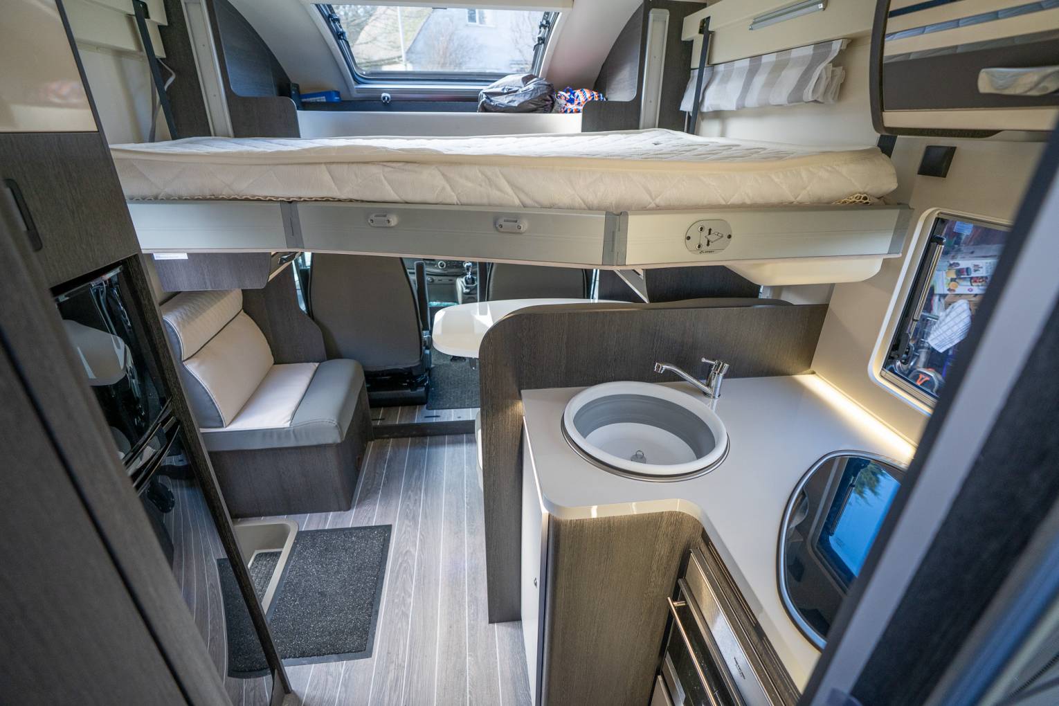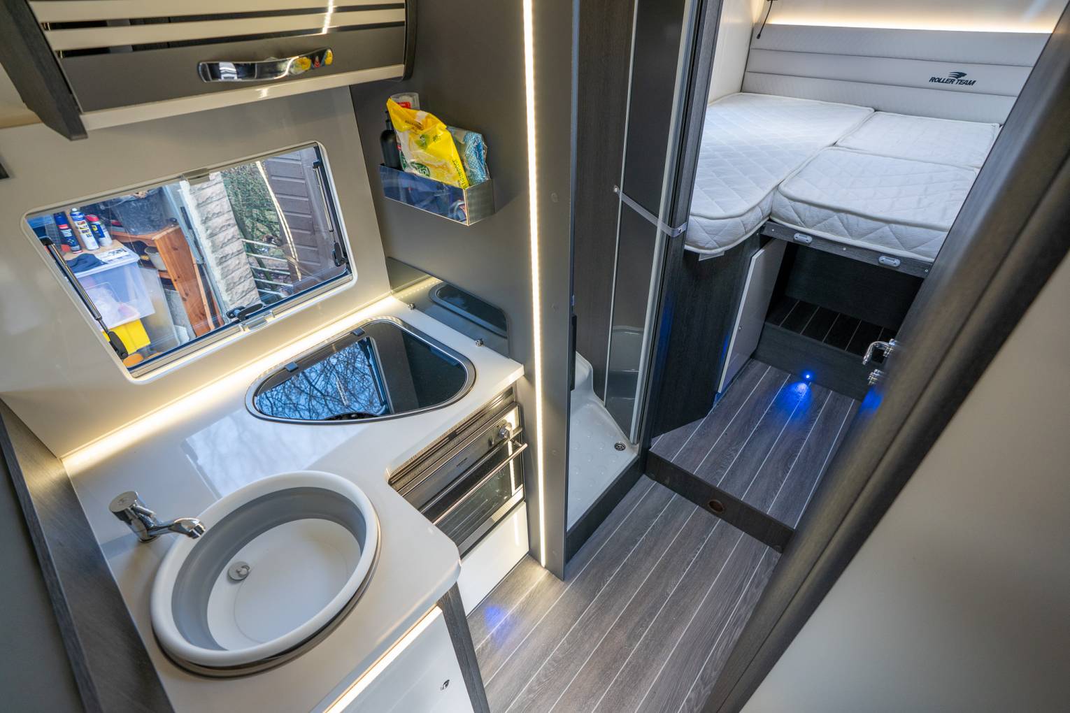 As you enter the vehicle you are greeted with smooth italian styling and that classic RollerTeam functional layout. Ahead is the drop down bed, which is electric powered and boasts enough space for two adults. The kitchen comes fully equipped with 3 Gas burners, a full sized 3-way Fridge and Freezer, a sink and then plenty of worktop space and storage. The living area has a lounge with an adjustable centre dinette table, and plenty of space for the family to dine in peace. All of this is complimented by stunning lighting and undercounter LED Lights to give you that luxurious feeling wherever the road may take you.