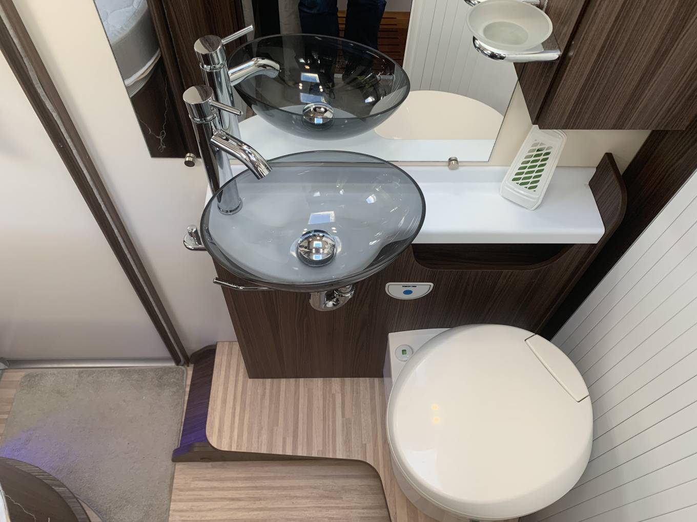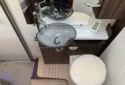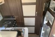 The well-designed L-shape kitchen comes equipped with a sink, 2-ring gas hob with 1 electric ring, Thetford tall fridge/freezer, and plenty of worktop space. Truma heating ensures you're comfortable in all seasons, whether you're camping in summer or touring in the cooler months.