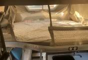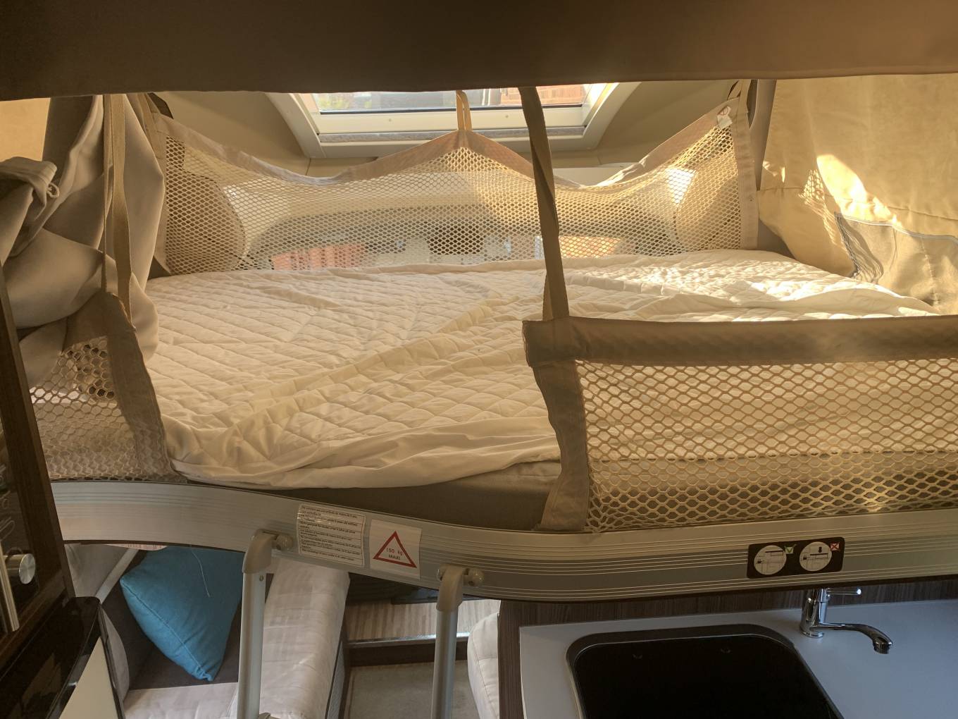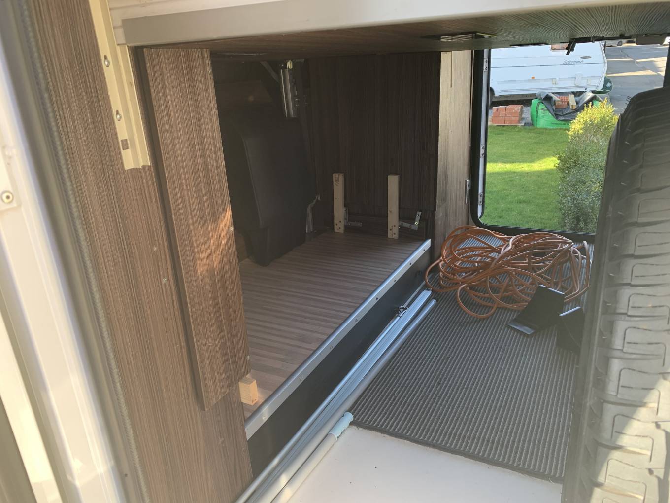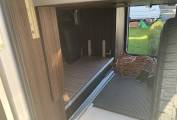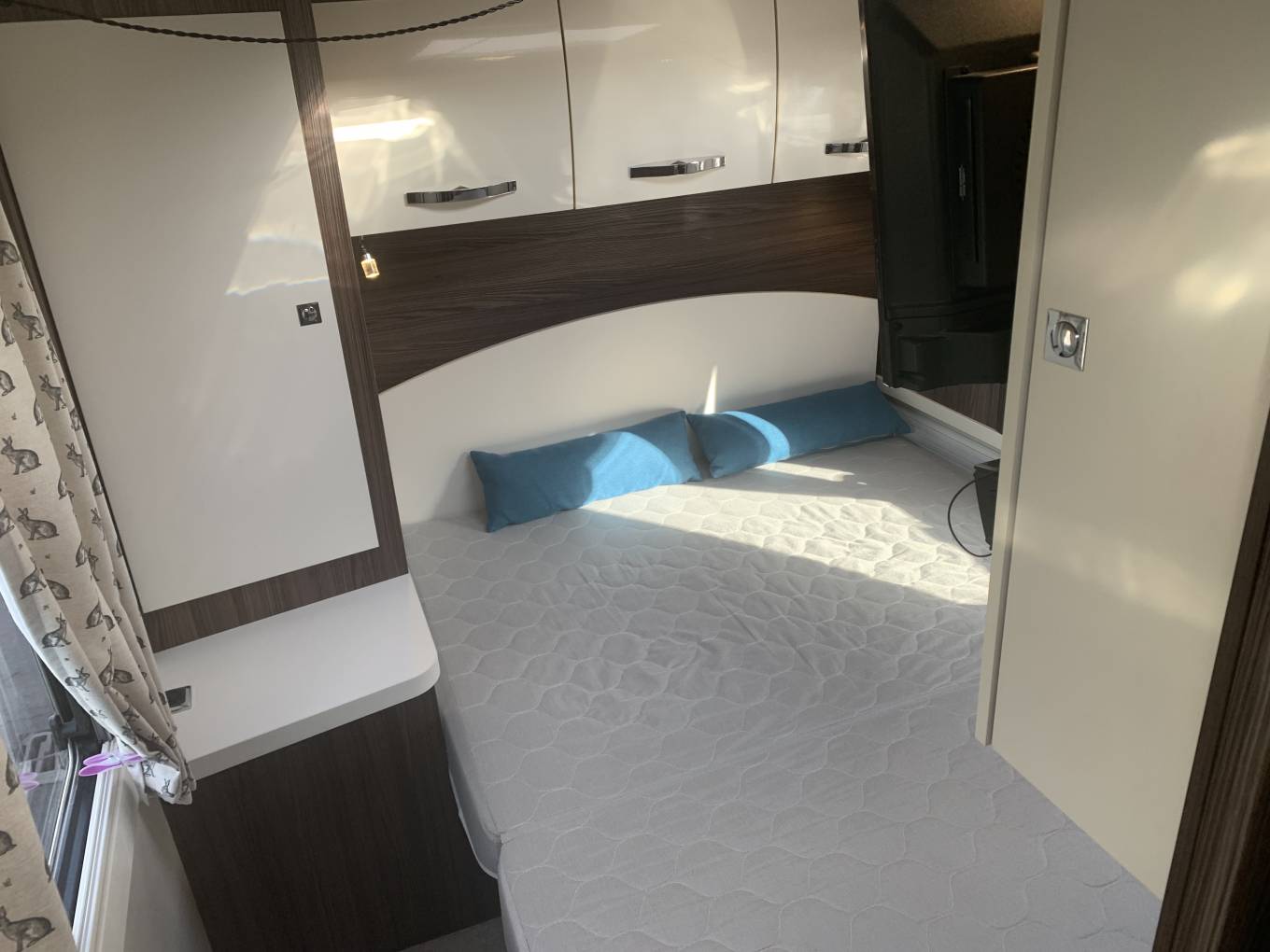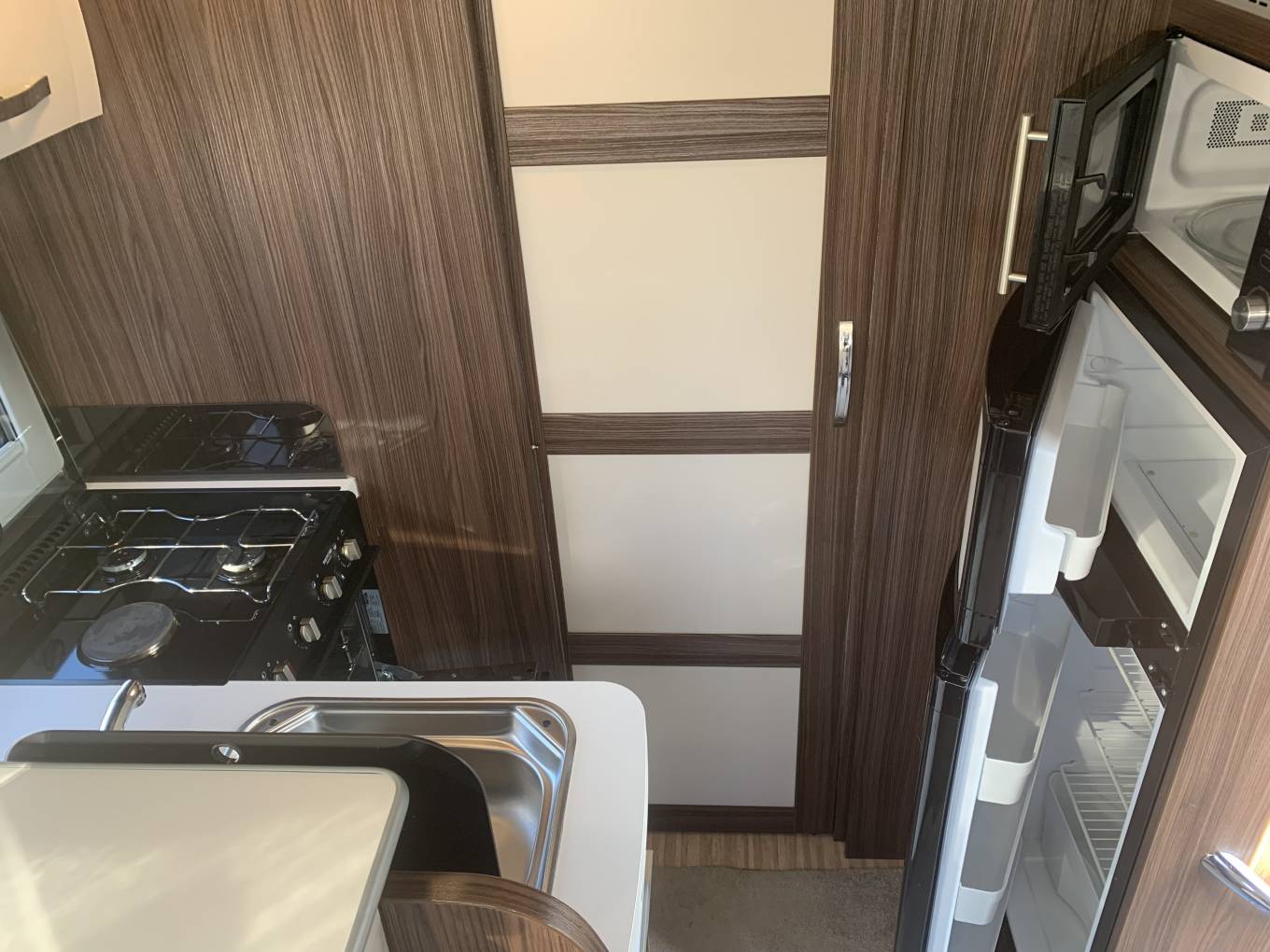 Over the lounge area is a drop-down bed, providing a quick and easy sleeping solution without compromising space. Towards the rear is a separate shower and washroom, leading to a fixed island bed – offering privacy, comfort, and excellent storage options throughout.