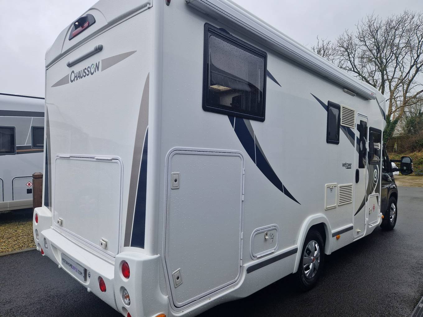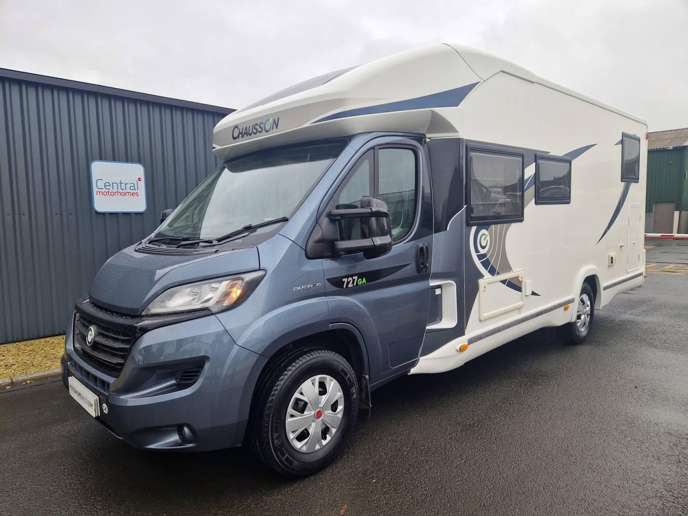 2018 Chausson 727GA Welcome for sale. Well presented motorhome with a huge specification and comes fully serviced with 4 new tyres. This layout features a rear bedroom with ensuite and separate shower, well equipped kitchen with large fridge freezer, euro style lounge area with twin swivel chairs and a drop down bed. The 727GA model has lots of storage space with a large rear garage area, multiple internal storage cupboards and 2 rear wardrobes. Other defining features include a 3500kg Fiat Ducato chassis (standard car license) reverse camera, awning, slide out easy chef BBQ, cab shades, cruise control, cab air con, mirror covers, dual heating and hot water and much more. Sale includes 1 years comprehensive warranty. Please call for further details….