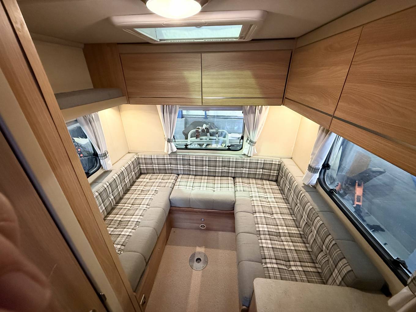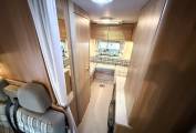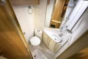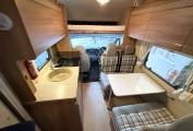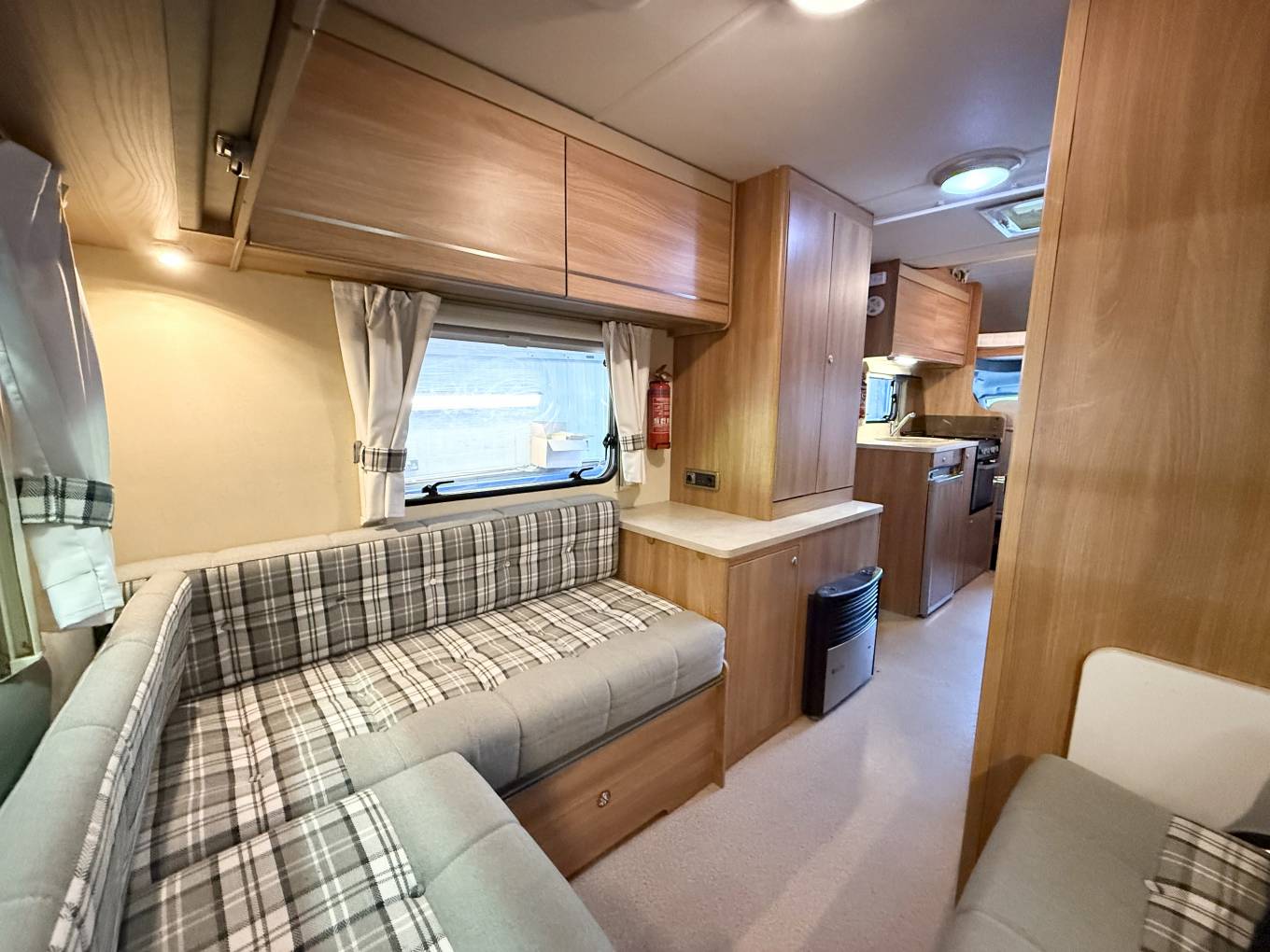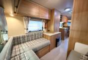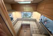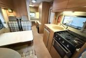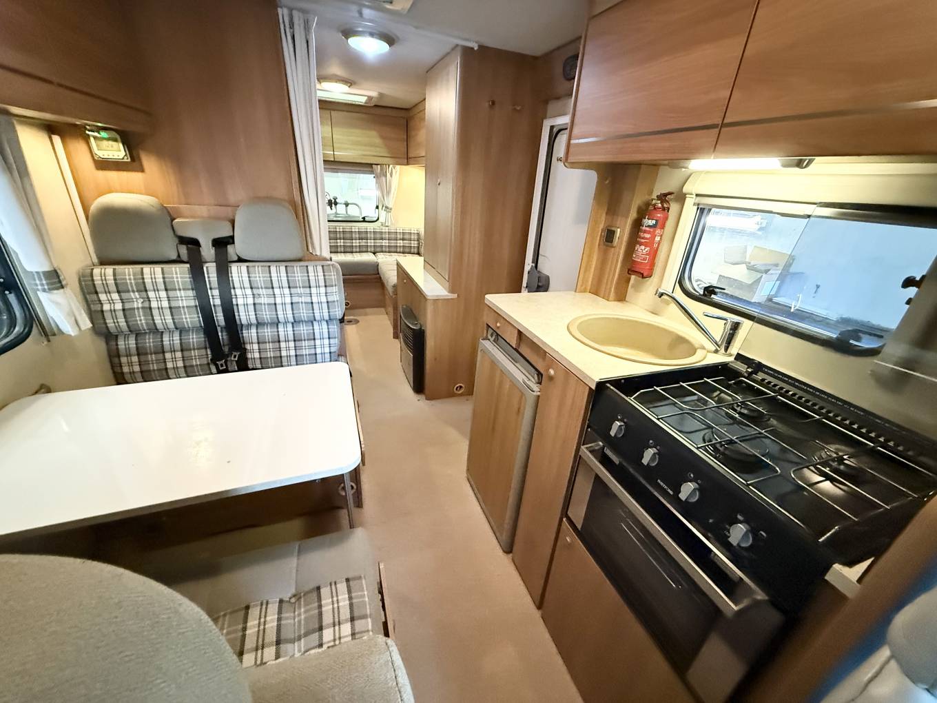 the perfect spacious motorhome. The 6 berths consists of an overcab bed, the rear lounge makes into a double, and the dinette converts in to the final double. so there is no shortage of sleeping space for children and adults. At the rear you have the exceedingly popular U shaped lounge layout which is a great spot to relax in after a day out seeing the sights. Thanks to the plentiful windows and large roof light this area benefits from lots of natural light. There is quite a substantial amount of storage space under the sofas, as well as in the overhead lockers. You can also choose to dine in either the rear or the front of the vehicle. There is a freestanding dining table with a chrome table leg that fixes into the rear lounge floor or alternatively there is a detachable table in the dinette if you prefer to eat meals in the front of the motorhome. Moving forwards, you come to the washroom which has all the facilities you need to keep fresh. There is a shower, a Thetford cassette toilet with electric flush, a wash basin with mixer tap, a mirror, and a bathroom cabinet to store your toiletries. Next up is the kitchen which has a combination thermostatic oven and grill with electronic ignition, a 3 gas burner hob, a three way fridge with icebox, a sink with mixer tap and plenty of cupboard and overhead locker storage space. The front lounge consists of forward facing and rear facing 2 seater sofas with 4 travelling belts in total. The dining table clips on to the side rail and can easily be detached and stored away when not in use. There are fly screens, blinds, and curtains throughout the motorhome as well as cab privacy blinds
