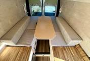 Starting at the rear of this campervan, you have a large, comfortable dinette area with bags of storage underneath accessed through the rear doors. This is the perfect place to relax or dine with a practical table that is easily removed and stored. As the evening nears, this area converts in to a generous double bed. Moving forward, is the bright and airy kitchen area. The kitchen features copious amounts of worktop space, plenty of cupboard storage, a 2 burner gas hob and a Belfast style sink. The fridge with a freezer compartment ensures that your ingredients stay fresh, allowing you to enjoy home-cooked meals even while travelling