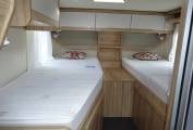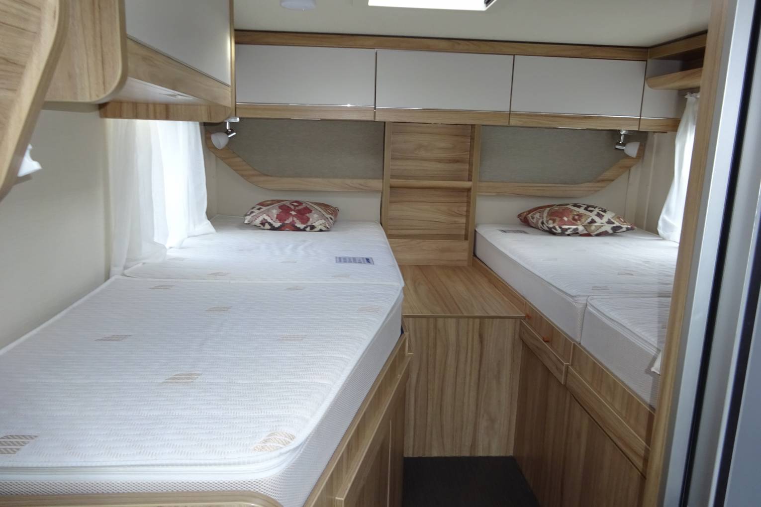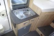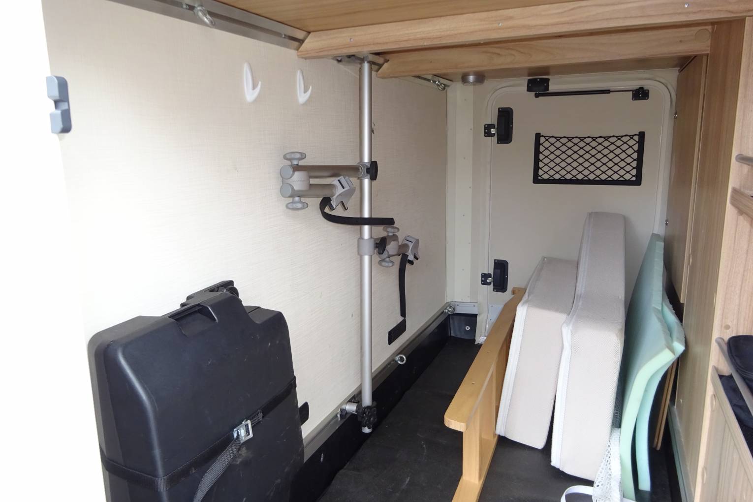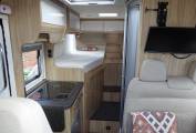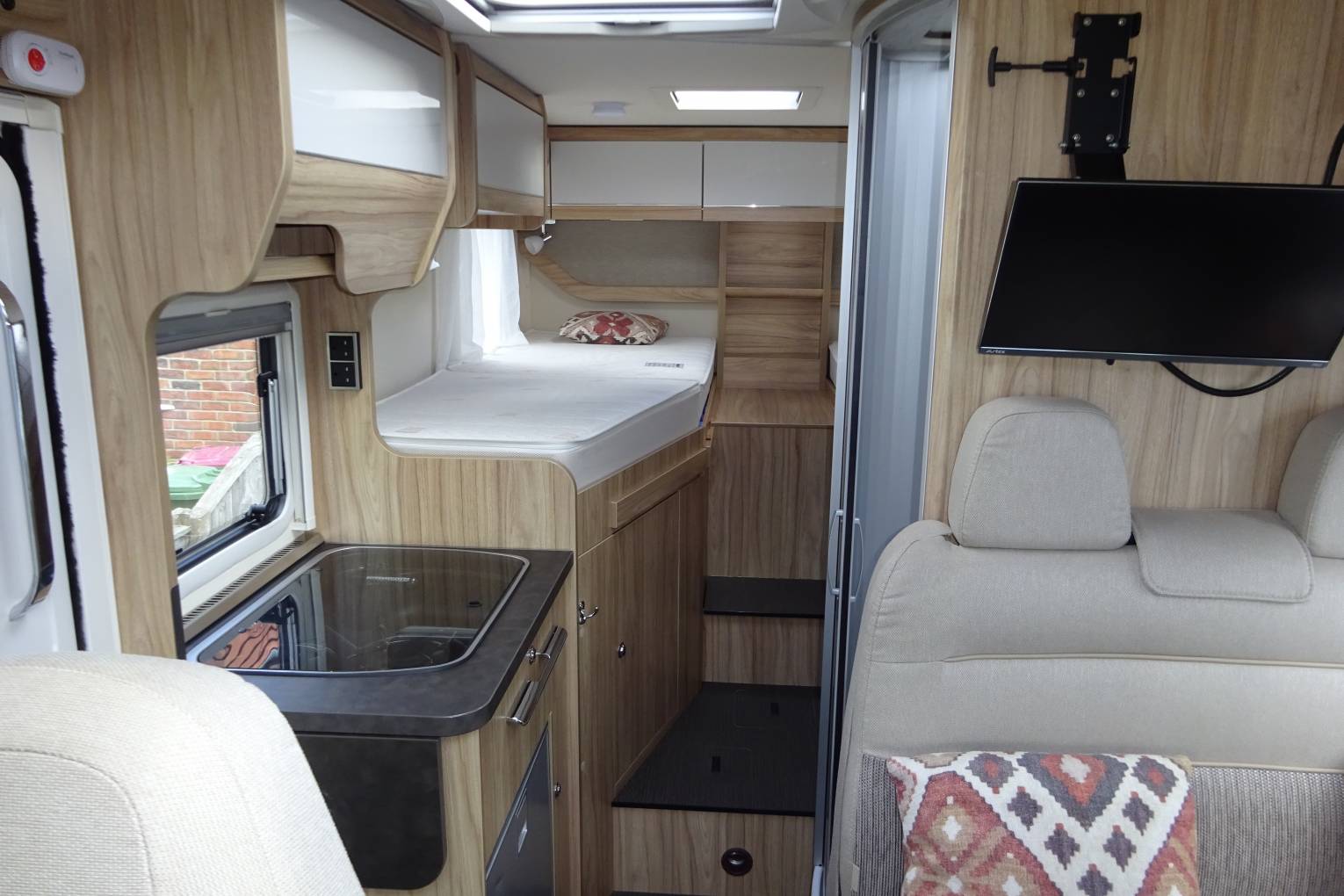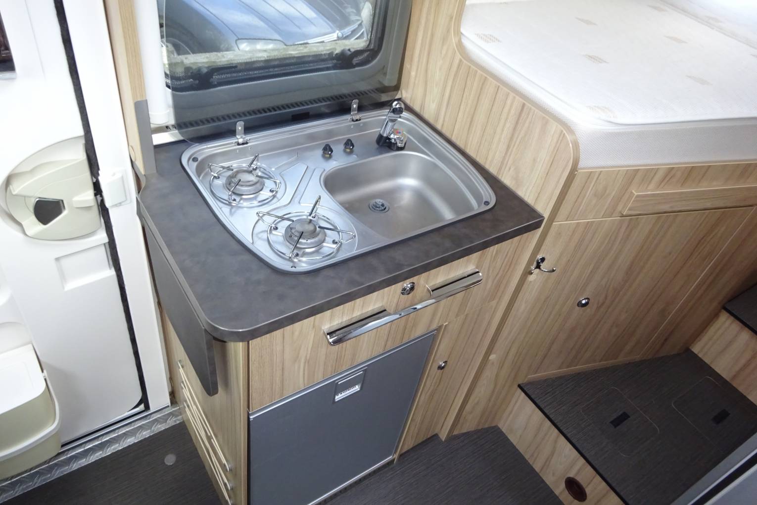 When you walk through the door you realise that the inside of this compact motorhome is as well kept as the exterior. At the front of the motorhome there is seating for 4 around the table. There is also the added benefit of a custom made smaller table to offer the option of extra space in the seating area. The kitchen is equipped with a 2 burner gas hob, sink and a fridge with an ice box. The wash room is equipped with a shower, toilet and sink all in excellent condition. The rear of the van has twin beds fitted which can also be made up in to a large double. You will not find many compact motorhomes with fixed twin beds like this. With plenty of storage including a large garage and wardrobe, it really does make the best use of the space in an excellent compact motorhome, allowing you to bring anything you would like with you.