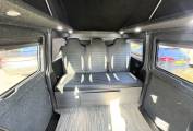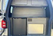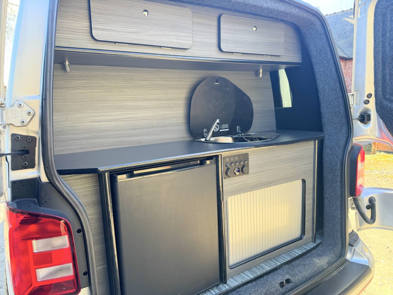 The van features a full-size, three-seater M1-tested rock ‘n’ roll bed with under-bed storage, along with a pop-top roof that includes a stylish internal VW logo. The well-designed conversion keeps things simple yet functional, with an end kitchen layout that includes a tap, sink, storage space, a single gas hob, large countertop, and an under-counter fridge—perfect for cooking on the go.