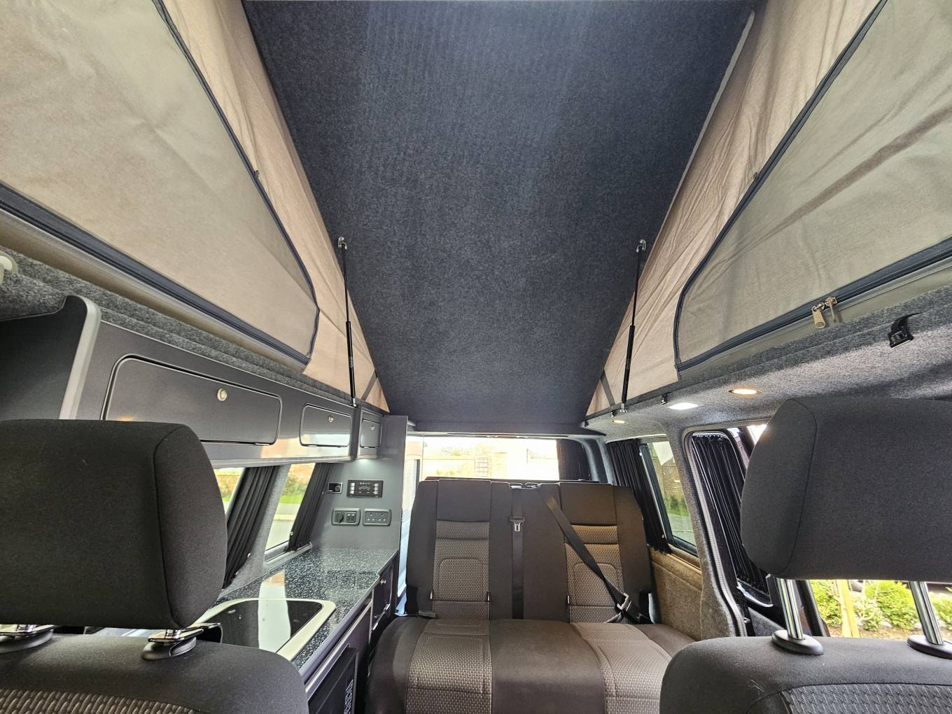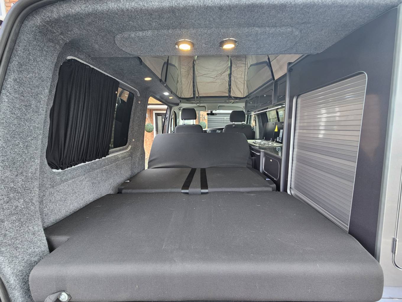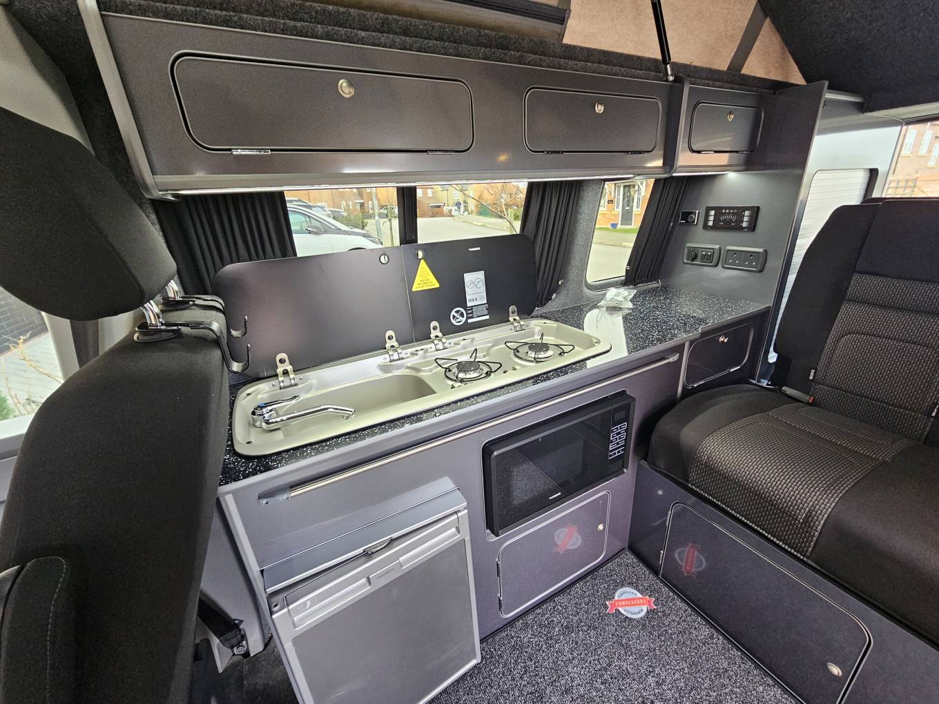 The kitchen area includes a two-burner gas hob, sink with mixer tap, microwave, and fridge with freezer compartment, everything you need to cook on the go. It also comes stocked and ready for adventure with cutlery, kettle, toaster, and pots and pans included. A 240V hook up provides campsite power, and an integrated water tank adds convenience. A solar panel ensures off grid capability, ideal for wild camping.