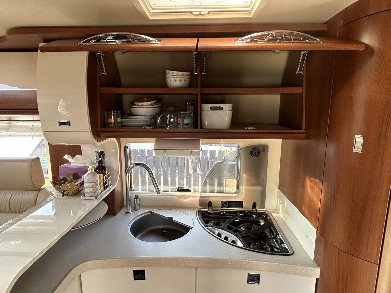 The mid-kitchen is well equipped with an oven and grill, a 3 gas burner hob, a stainless steel sink and a mixer tap and a large Dometic fridge freezer which has automatic selection.