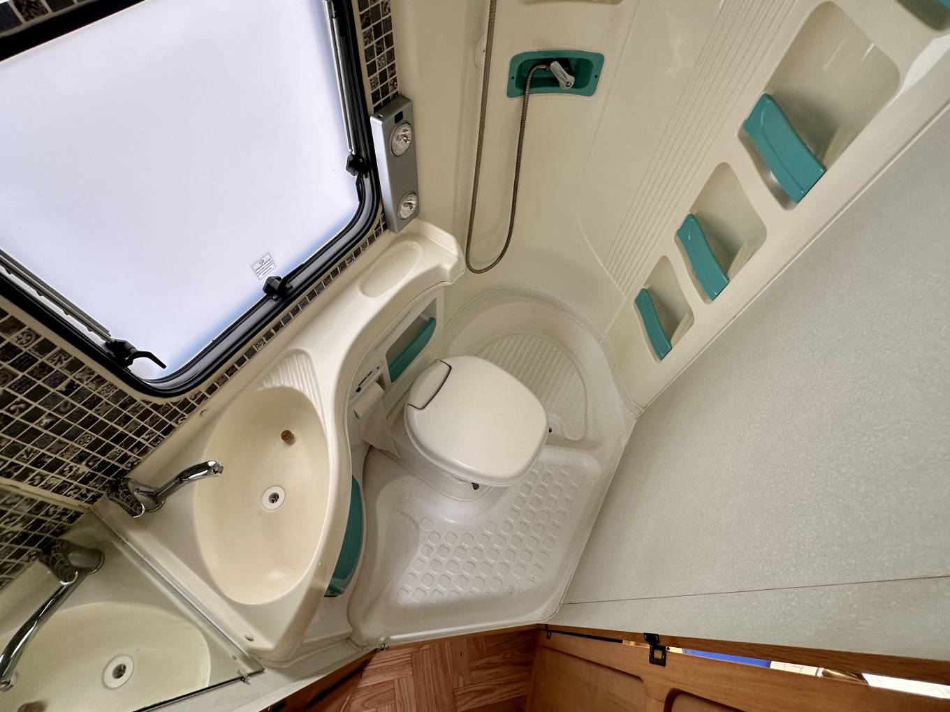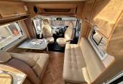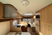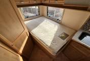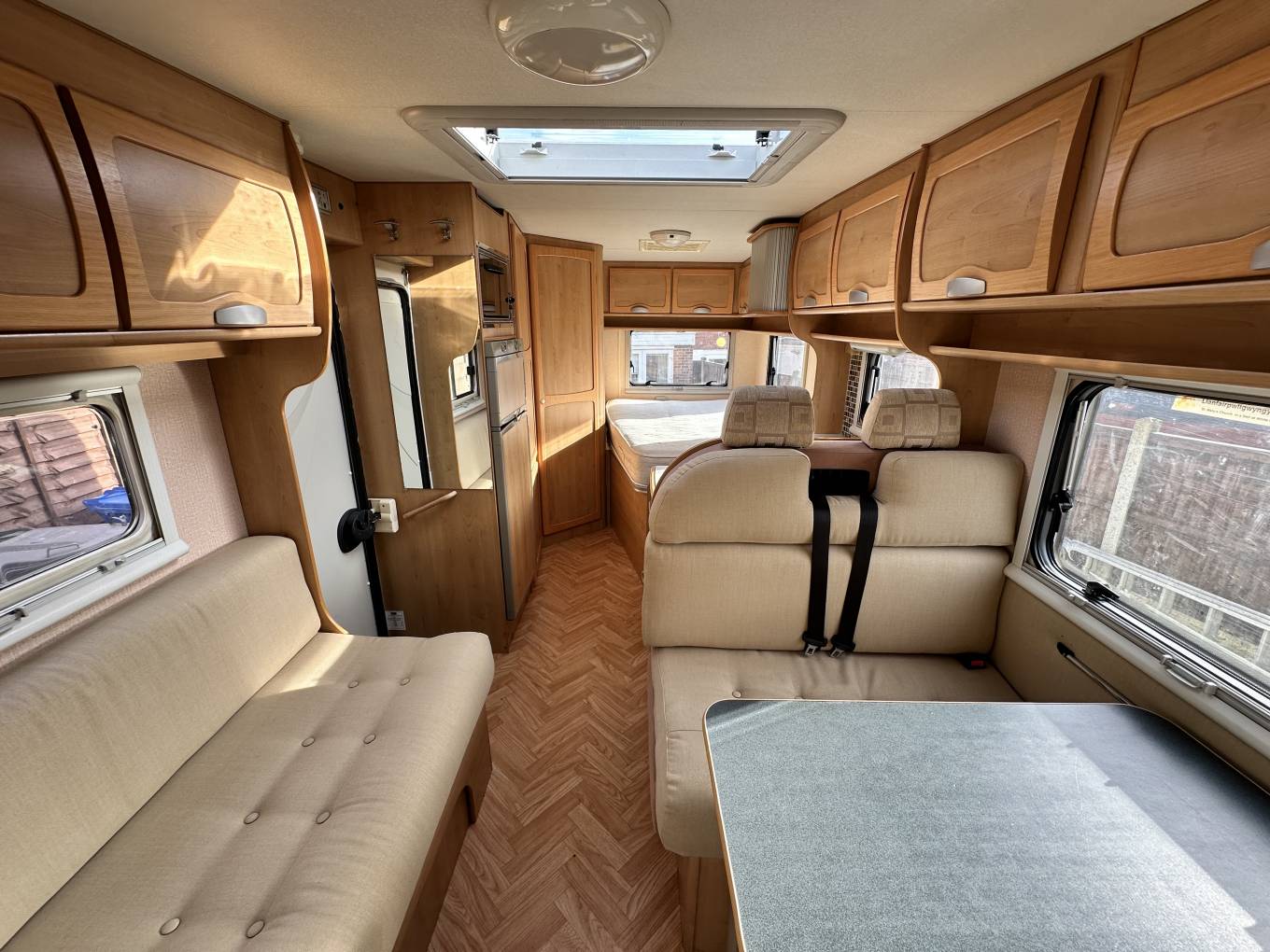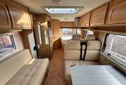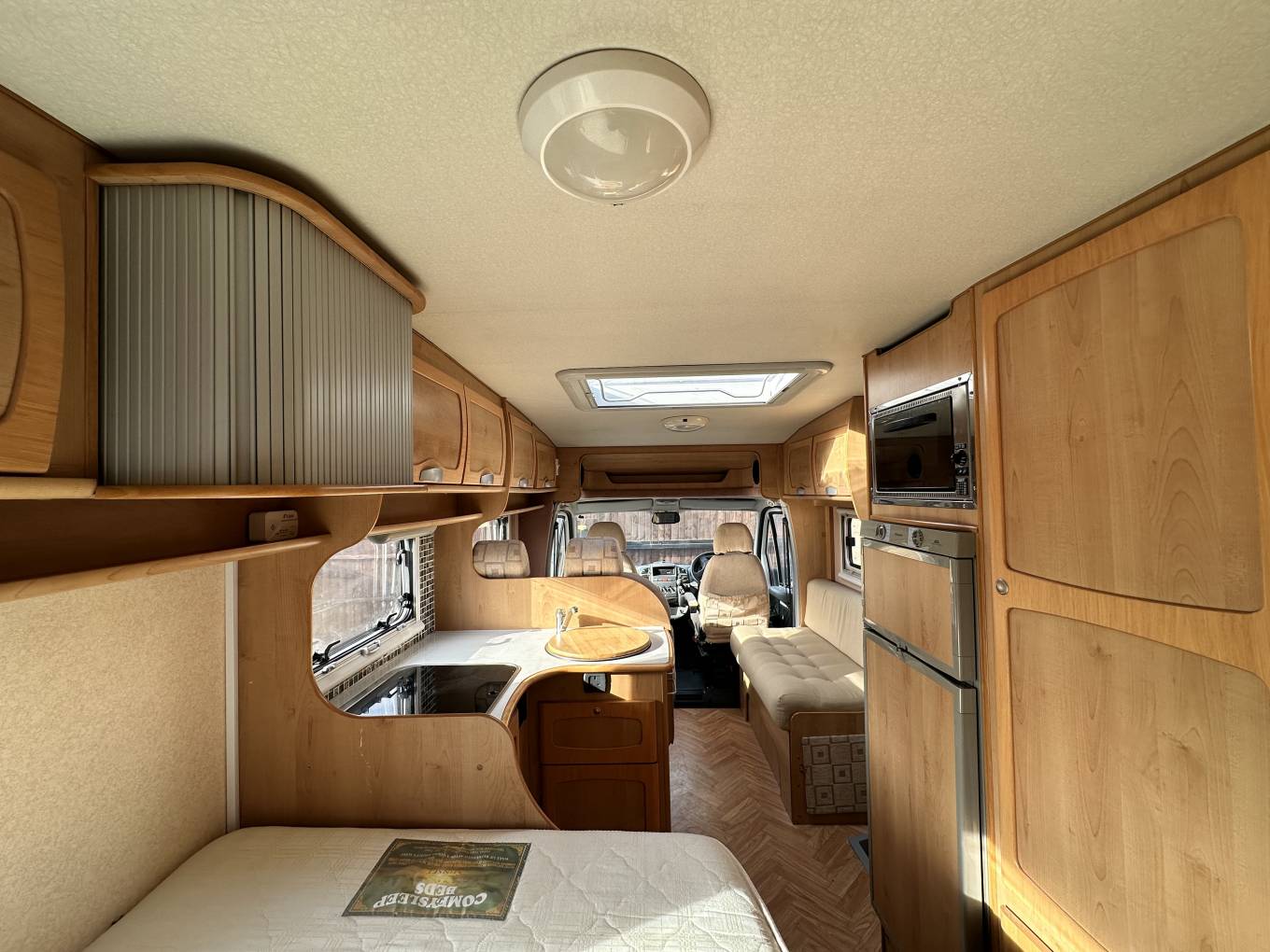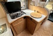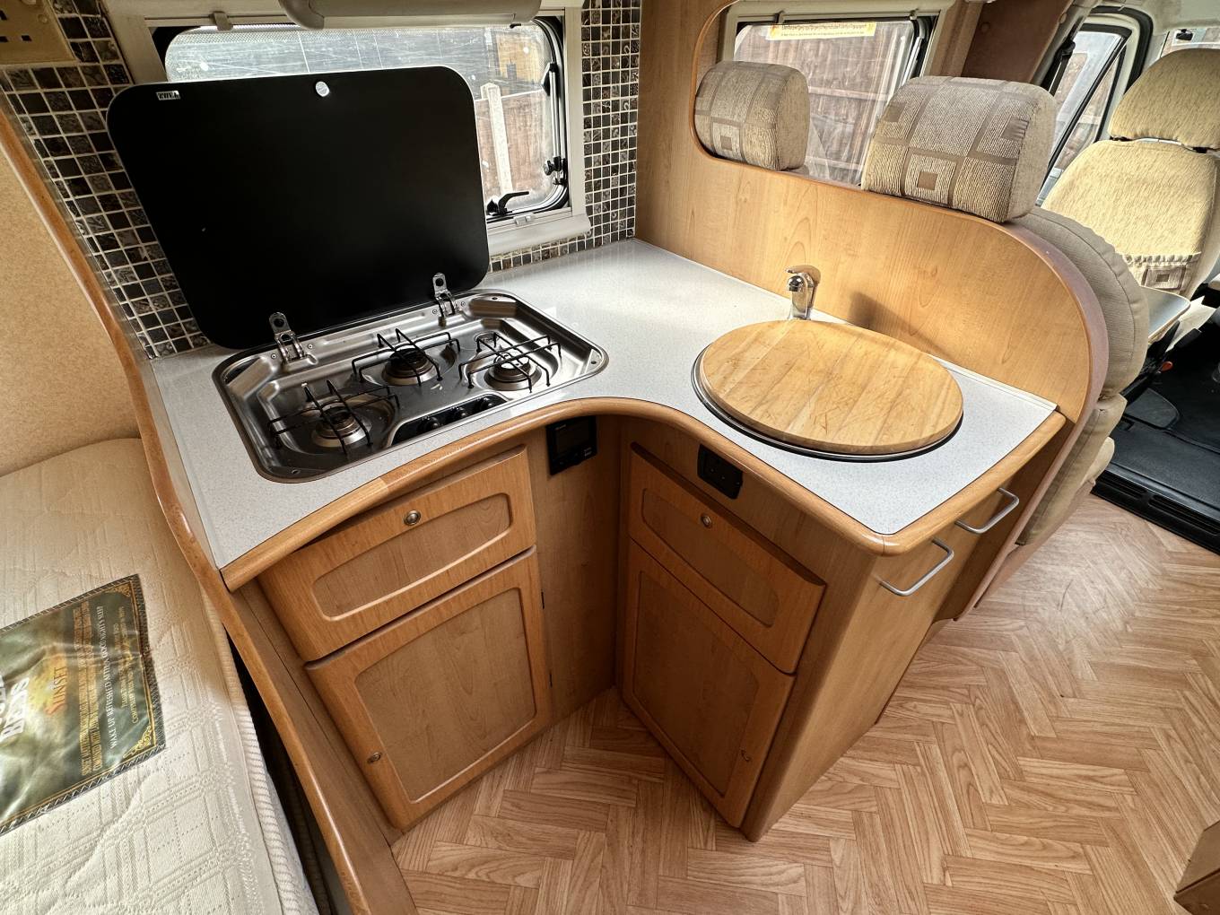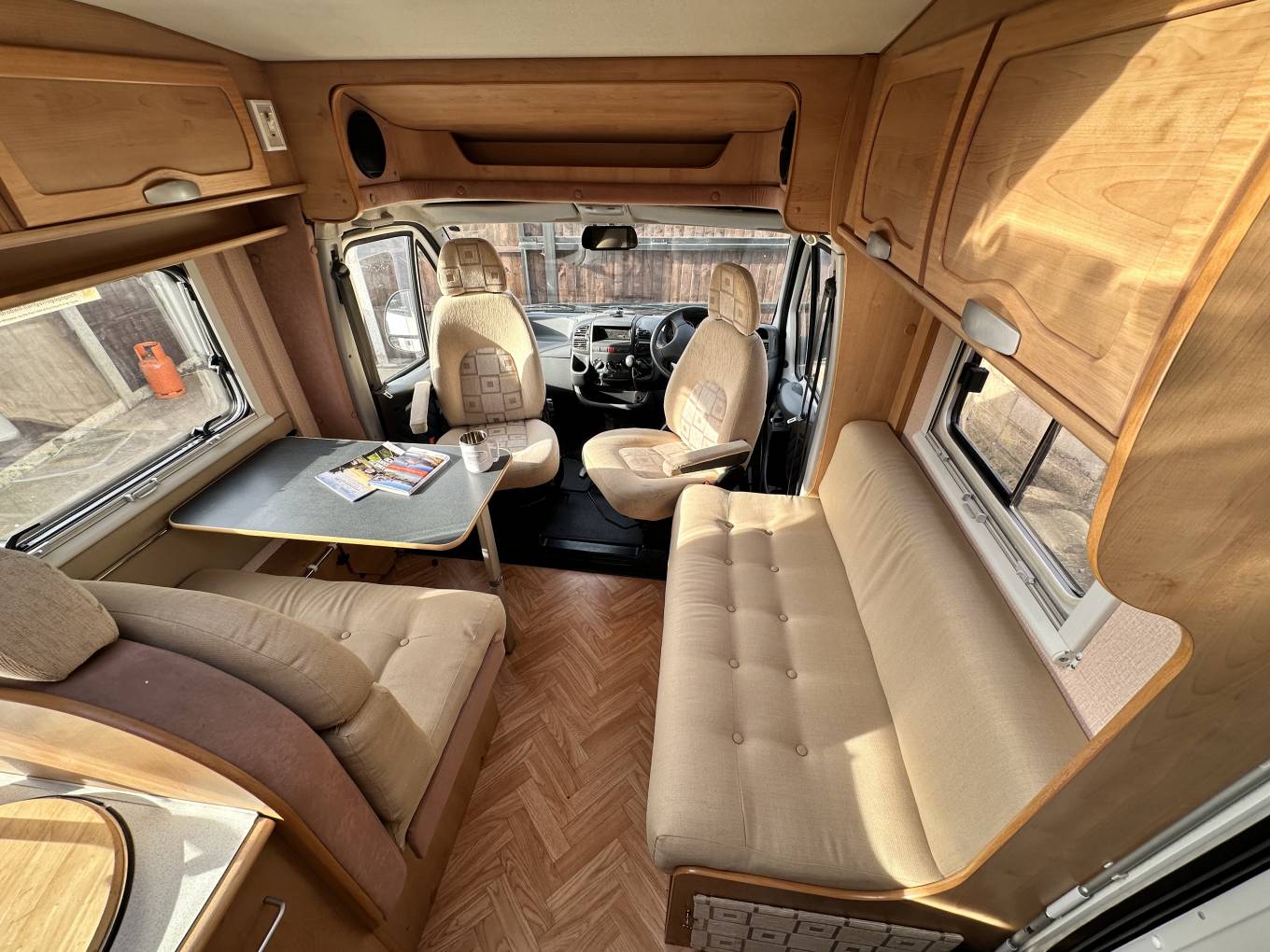 Starting at the rear of this well designed motorhome is the desirable, fixed French double bed. Adjacent to this is the practical washroom including a Thetford rotating cassette toilet, wash basin with mixer tap, mirror, storage and separate shower hose. Moving forward you will find the well-equipped kitchen area including a three ring gas burner, oven, stainless steel sink with mixer tap and worktop cover, large fridge with separate freezer compartment and plenty of storage. In the heart of the motorhome is the dinette area featuring a large dining table, twin swivel captain’s chairs and seating that can easily accommodate dining for up to 6 people. This light and airy space is perfect for entertaining or relaxing and has been upholstered in a stylish cream fabric. As evening nears this area easily converts into a comfortable double bed, completing this 4 berth Motorhome.