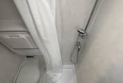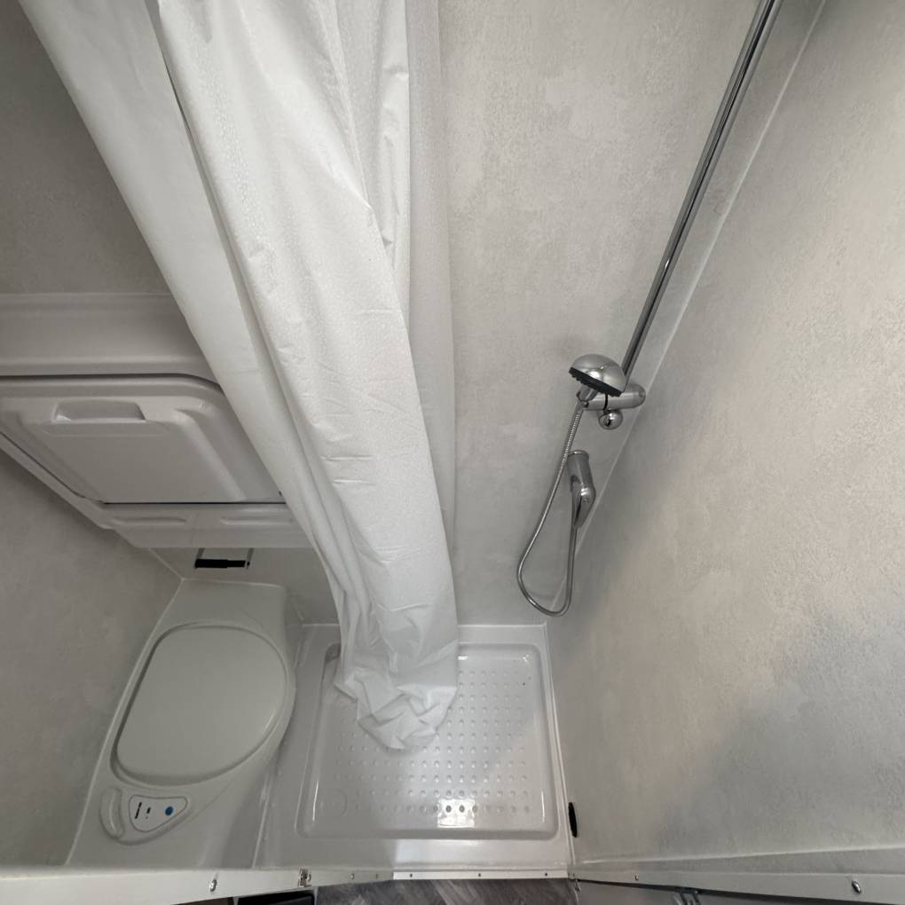 Bathroom with cassette toilet, sink, cabinet and good size shower