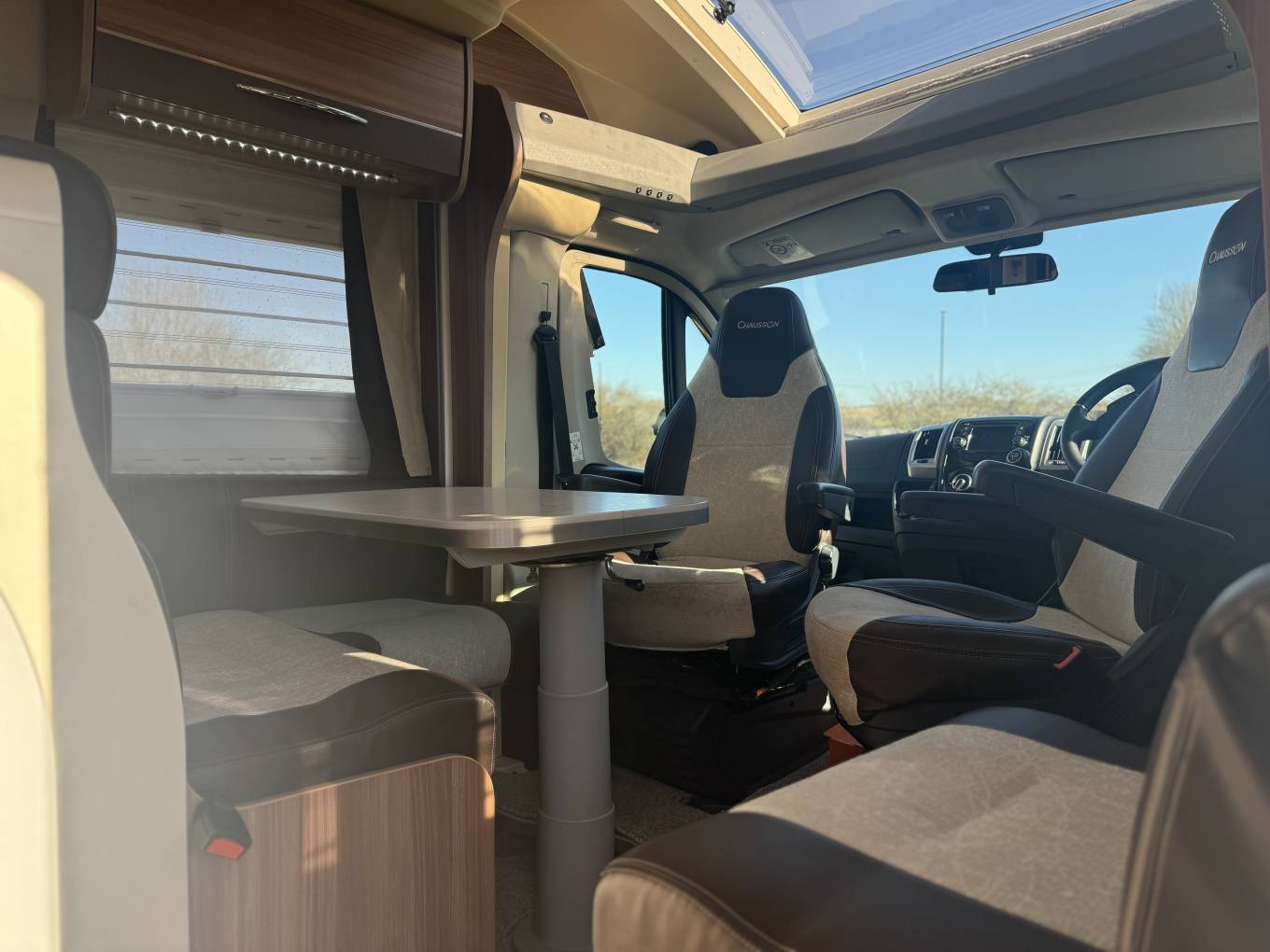 The lounge area is bright and comfortable, with swivel cab seats that turn to create a sociable space for dining and relaxing. A drop-down double bed is neatly concealed in the ceiling and can be easily lowered when needed. The large panoramic skylight brings in plenty of natural light during the day, while LED lighting throughout creates a cosy atmosphere in the evenings.