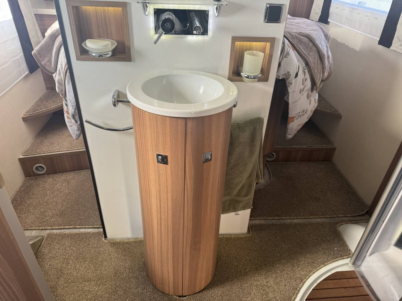The washroom is thoughtfully designed with a separate shower cubicle. its also houses the cassette toilet with an electric flush, hand basin with built-in storage for toiletries, large mirror and additional shelving make the space practical and easy to use.