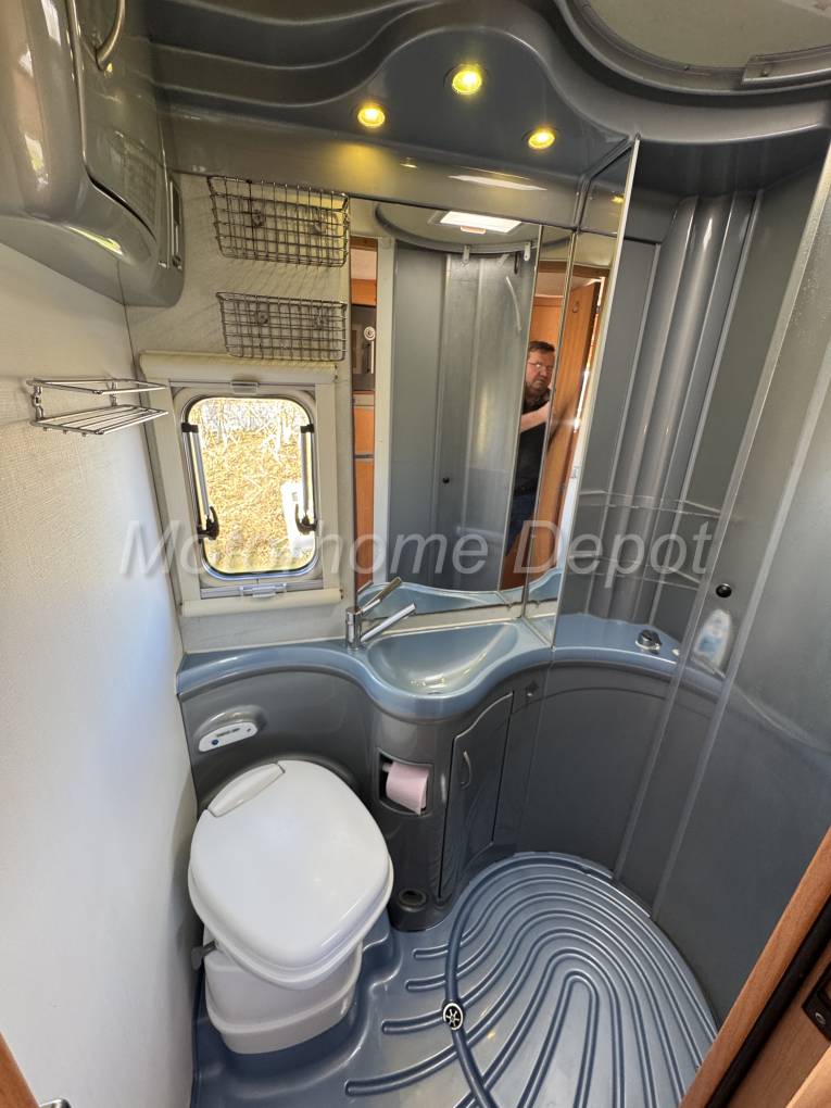 The washroom has a Thetford cassette style toilet with electric fresh water flush & a swivel head, built in sink with chrome mixer tap above. There is a separate shower cubicle with sliding Perspex screens.