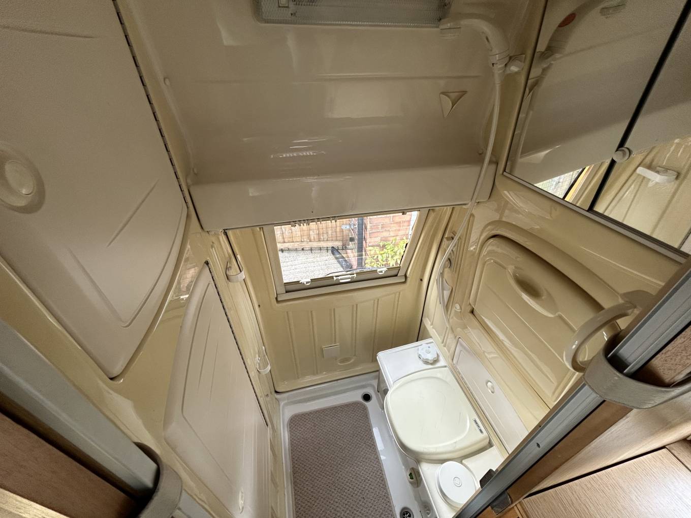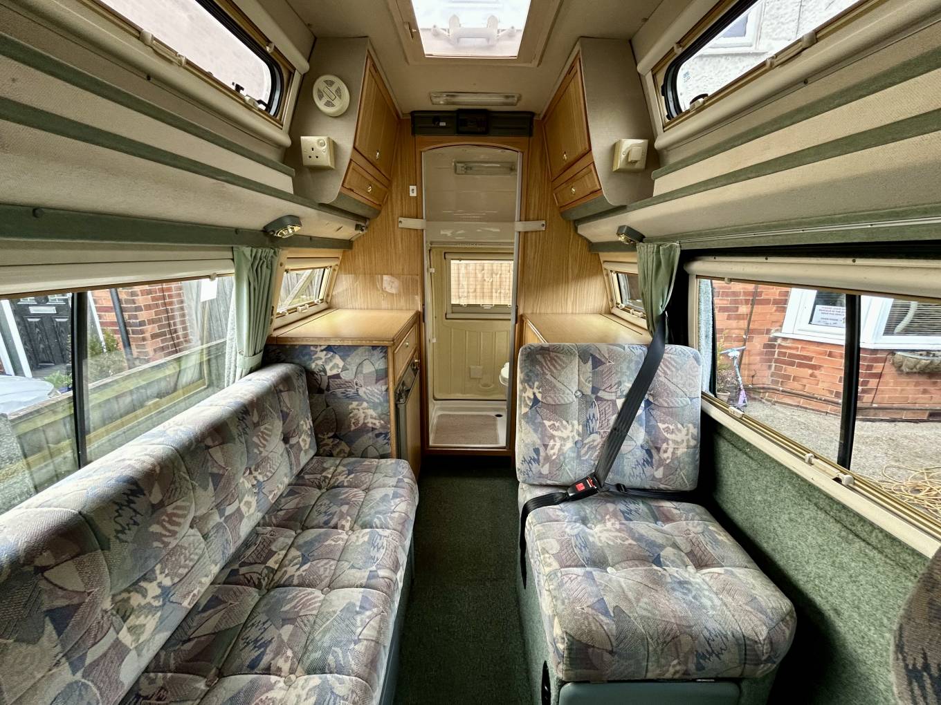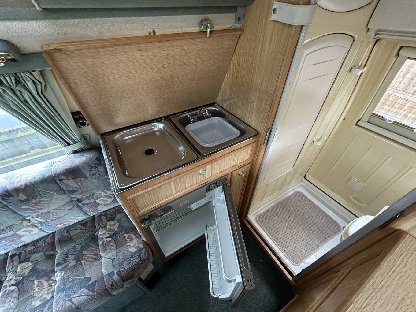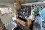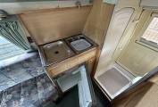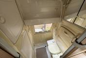 At the front of the vehicle we have the cab with two swivel seats which rotate to create a light and airy lounge area with the long bench seat and single rear seat creating ample seating for five, this rear seat is also home to a third three point seat belt meaning three can travel safely. Moving rearward we have the well equipped kitchen area which is home to a sink with separate drainer and fridge with ice box opposite a two burner hob with grill. The kitchen area also has a large amount of storage for pans and cutlery etc. Moving further backward we have this vehicles piece de resistance with a fully equipped washroom complete with cassette toilet, hand basin and shower with hot and cold water. There is also a wardrobe with hanging space and vanity basin.