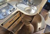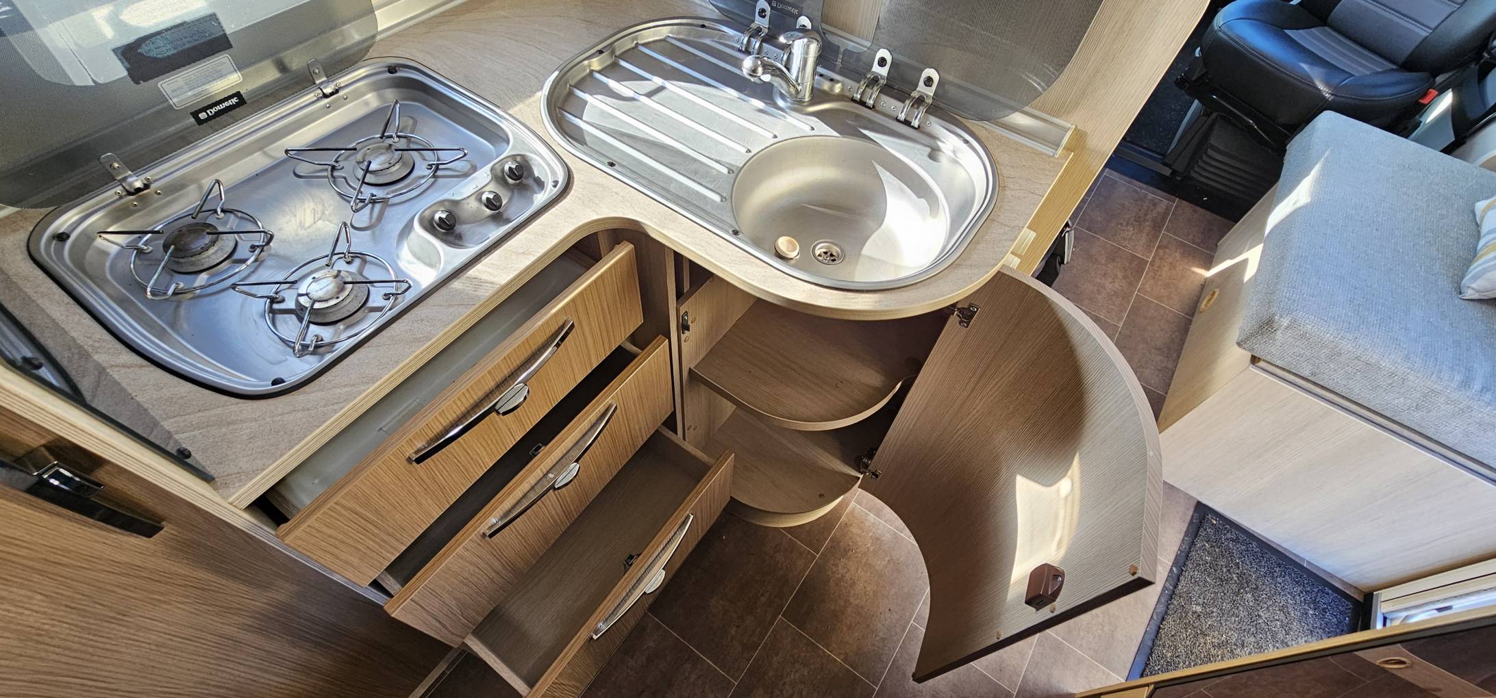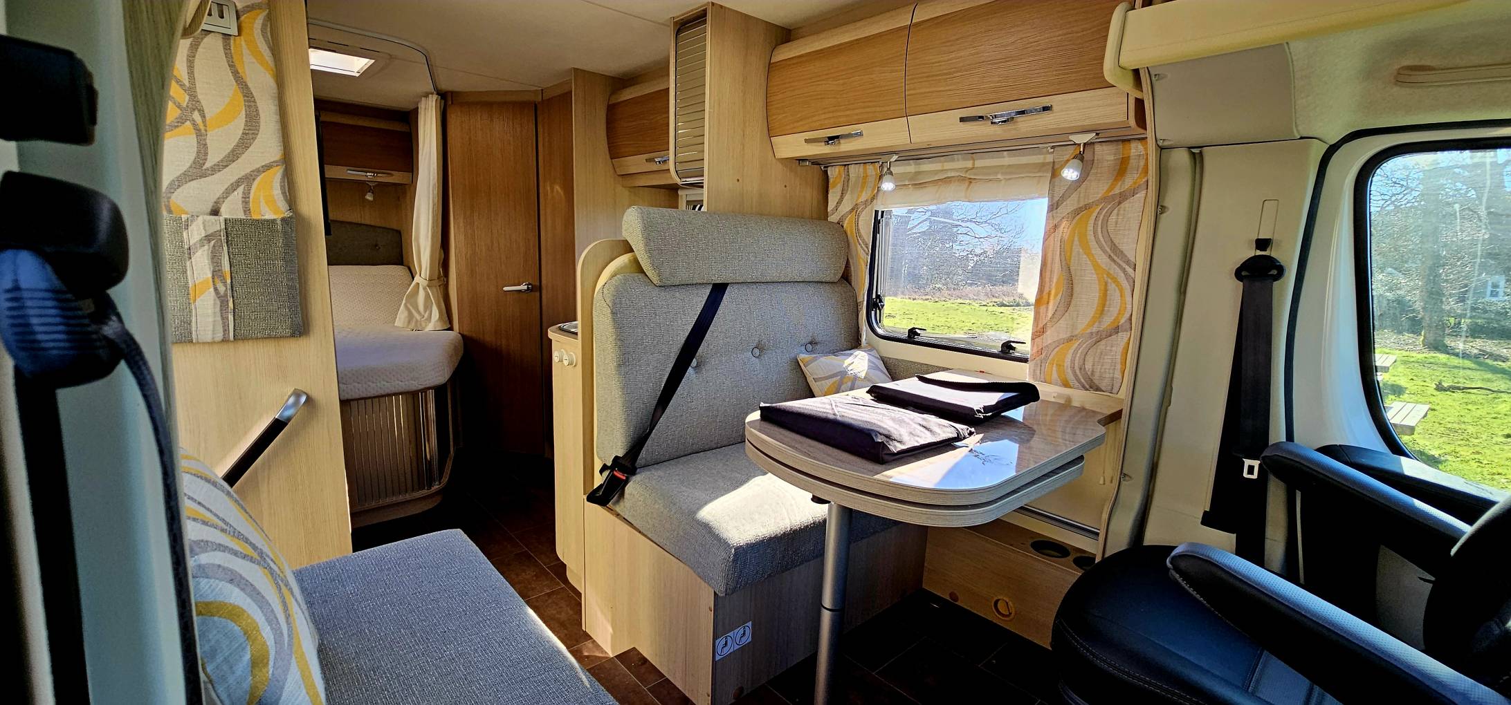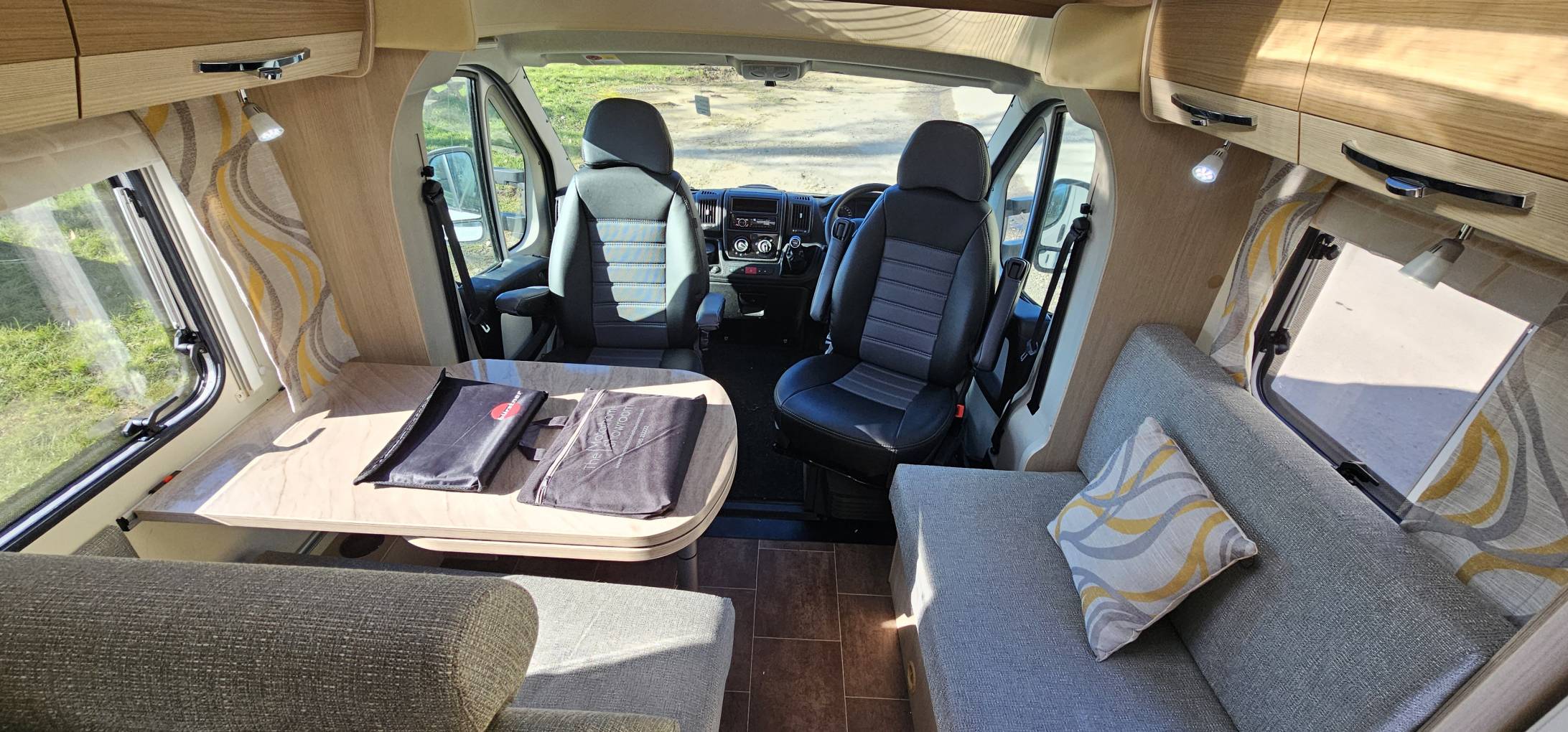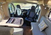 Being a Burstner and of German quality, this vehicle oozes style and good design elements. Stepping inside you are immediately aware of the modern, neutral and light coloured materials used. Front dinette with 2 swiveling seats and multi positional dining table.