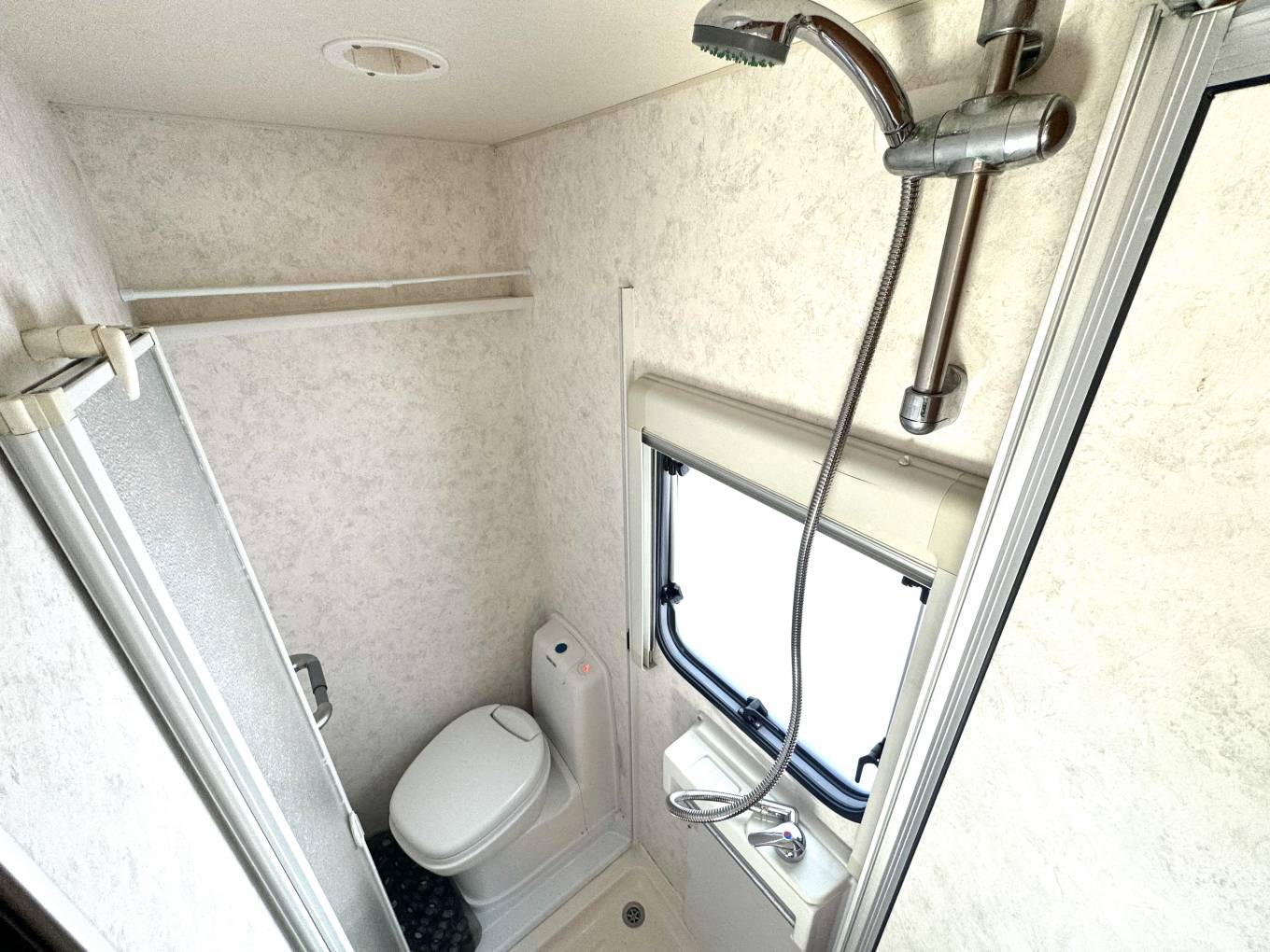The washroom is designed for convenience, featuring a cassette toilet, a sink with a vanity unit, and a separate shower, giving you home comforts wherever you park up.