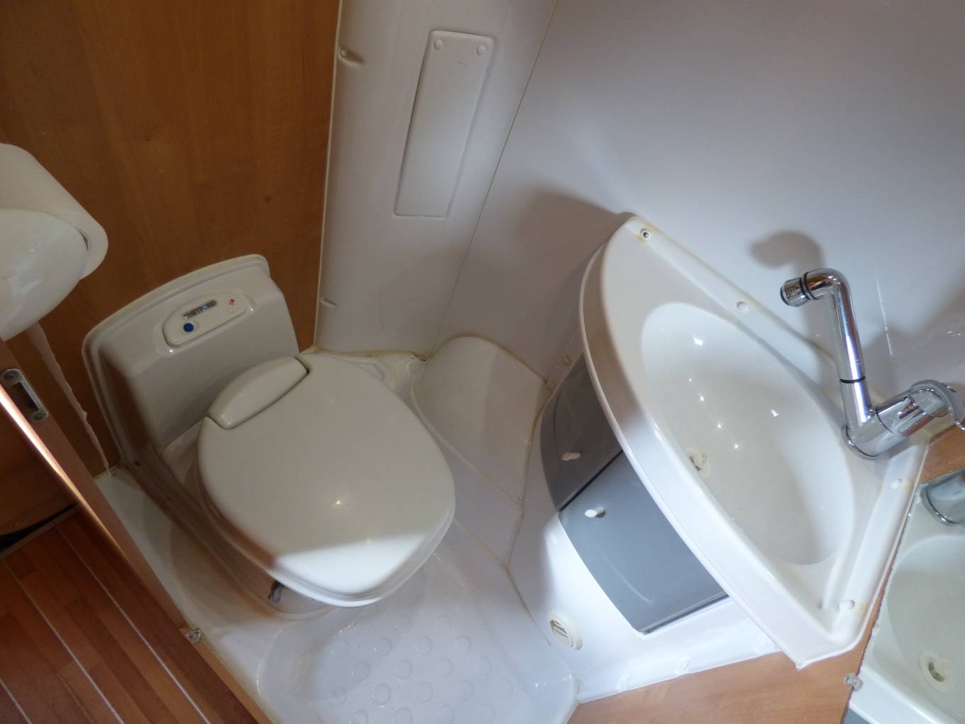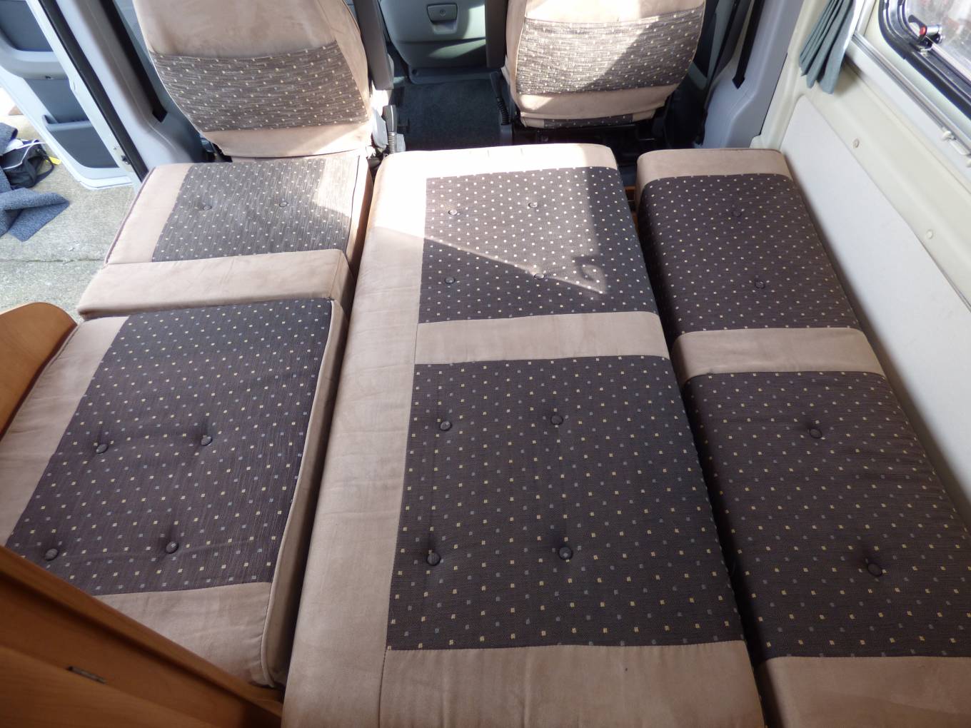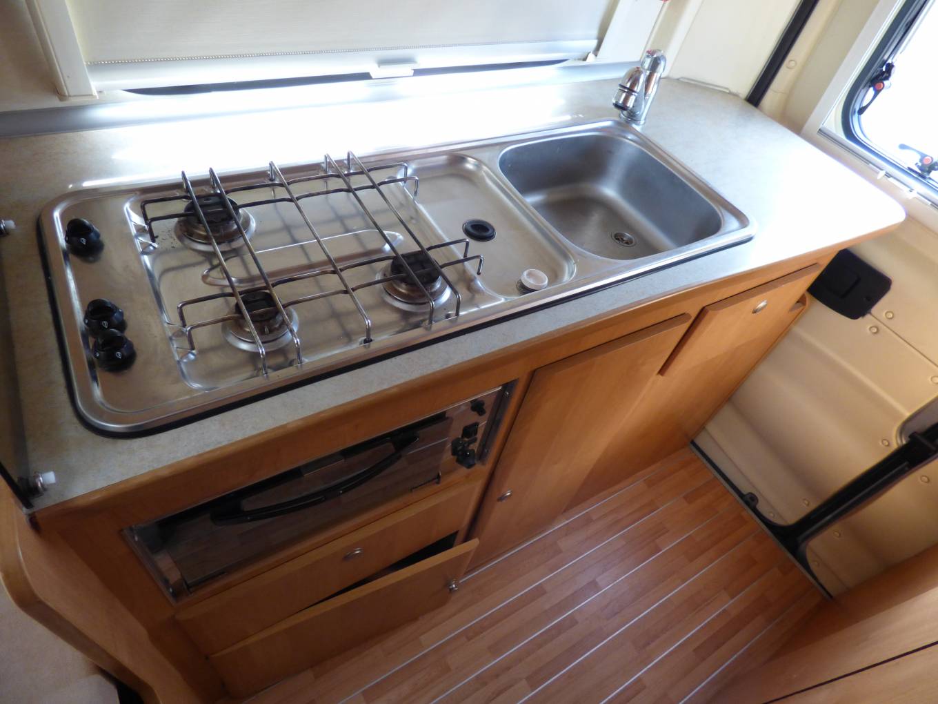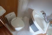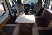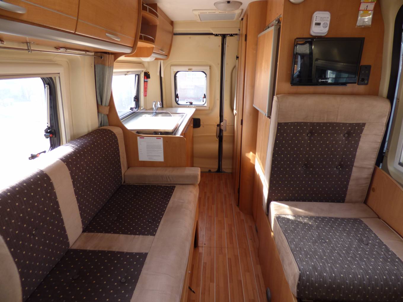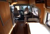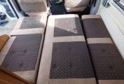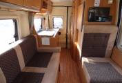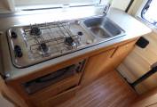 The vehicle is very light and airy as a result of the extensive windows around the vehicle and the large Heki style rooflight. The front seats both swivel to face the rear of the motorhome and with the stowable large dining table and TV in this dinette area it doubles as socialising and dining space. The side facing banch seat and the forward facing single seat collapse very swiftly into a large transverse double bed. The kitchen area, with preparation area, grill, 3 ring hob and sink sits towards the rear of the vehicle and opposite is the washroom with W.C. vanity unit and mixer tap which doubles as a shower head.Heatng is provided by a Webasto unit and hot water via a Truma boiler.
