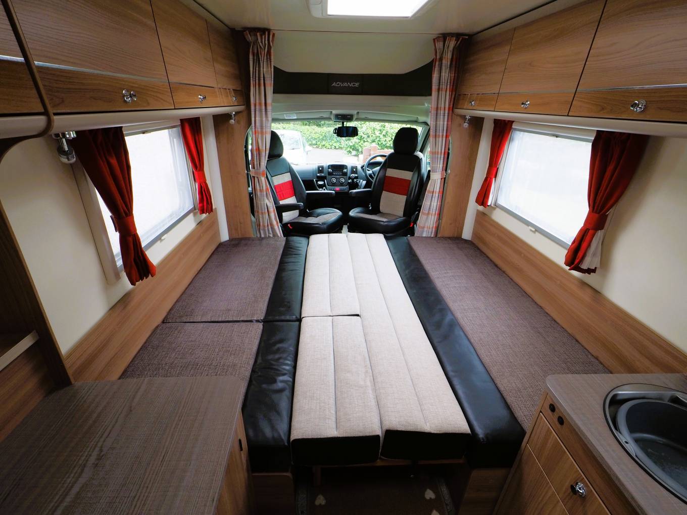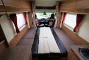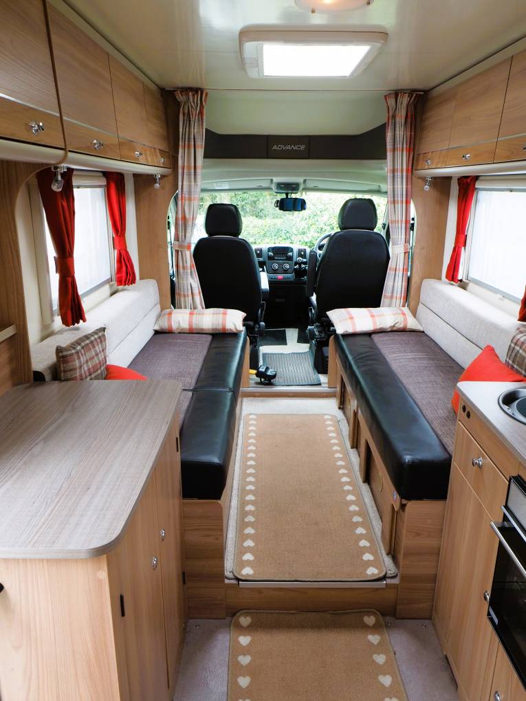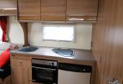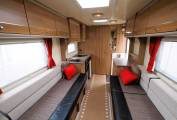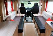 The comfortable lounge has two long side sofas and the front driver and passenger seats swivel to provide additional seating options. Drop in the occassional table for a relaxing place to dine and entertain and at night the sofas can be used as two separate single beds or pull out to create a huge double sleeping space. Plenty of storage in the overhead lockers to both sides and the nearside sofa has storage under with external access via a locker door. The well equipped kitchen comes with a 3 burner gas hob, combi oven and grill, microwave, sink with mixer tap and an under counter 3-way fridge with freezer box. Storage to both sides with cupboard and drawer space and an additional work surface gives a further prep area and a place to site a TV. To the rear is a good sized private washroom with flushing cassette toilet, sink with vanity mirror, separate shower cubicle and wardrobe with hanging rail.