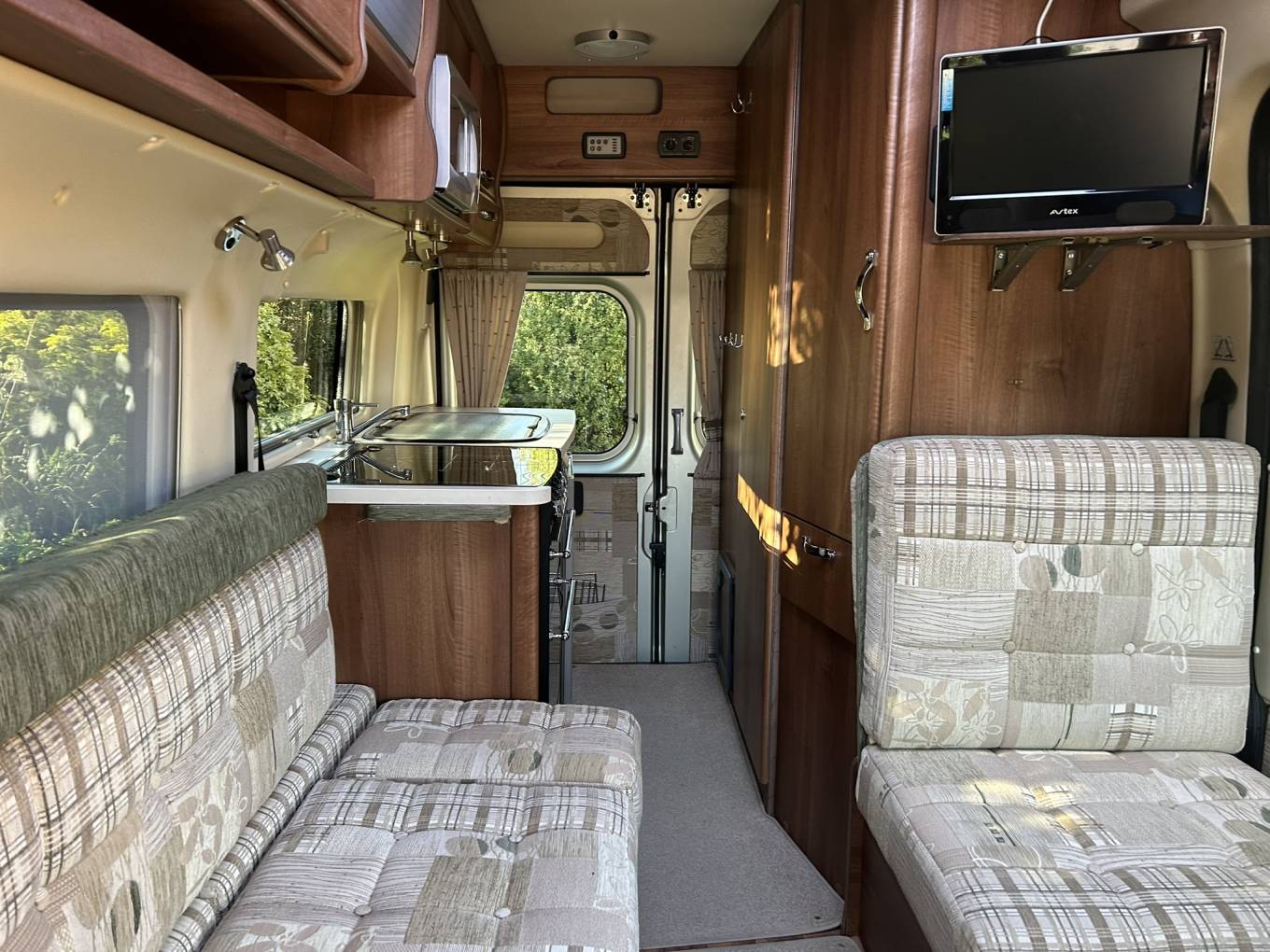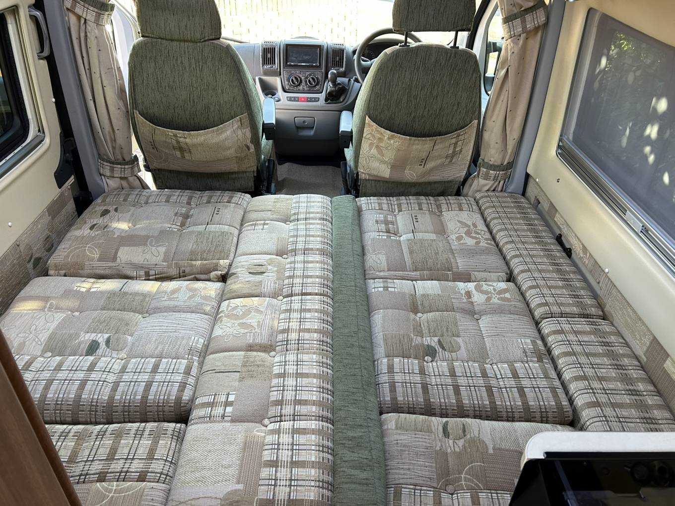 The cab has a good sized over head space to store all you bedding, air con, cruise control, ceiling mounted TV, Sony DAB Radio with sat nav capabilities, electric windows and privacy curtains.