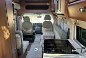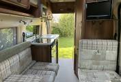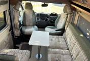 When you open the side door and enter the van, you have the lounge dining area with a side sofa and a forward facing seat that has a 3rd seatbelt. This area can be make up 2 single beds or one large double. There are 2 dining tables, that fit into the floor on a single pole leg. Large side windows and a wind up sunroof flood the lounge with plenty of natural light.