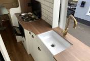 A practical washroom on the offside behind a very functional kitchen with a good amount of work surface on the other.
