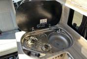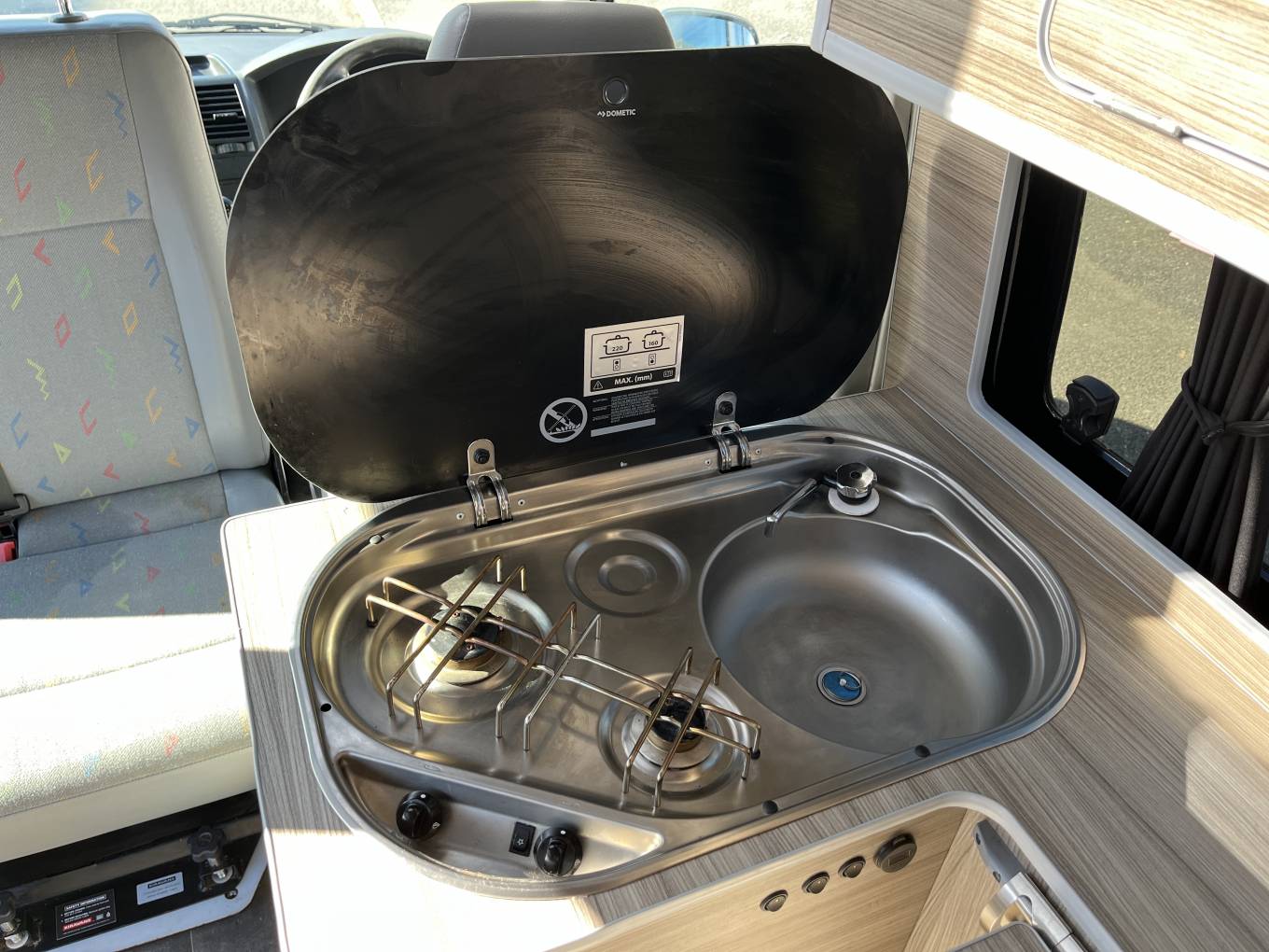 kitchenette with a gas hob, sink, and fridge, plus storage compartments. The