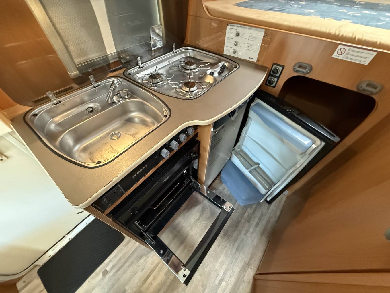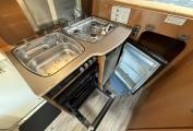 To the left of your entrance door is the fully equipped kitchen consisting of a Three Burner Gas Hob, an Oven/Grill combination, a Three Energy Source Dometic Fridge and a Sink with a Hot and Cold Mixer Tap.