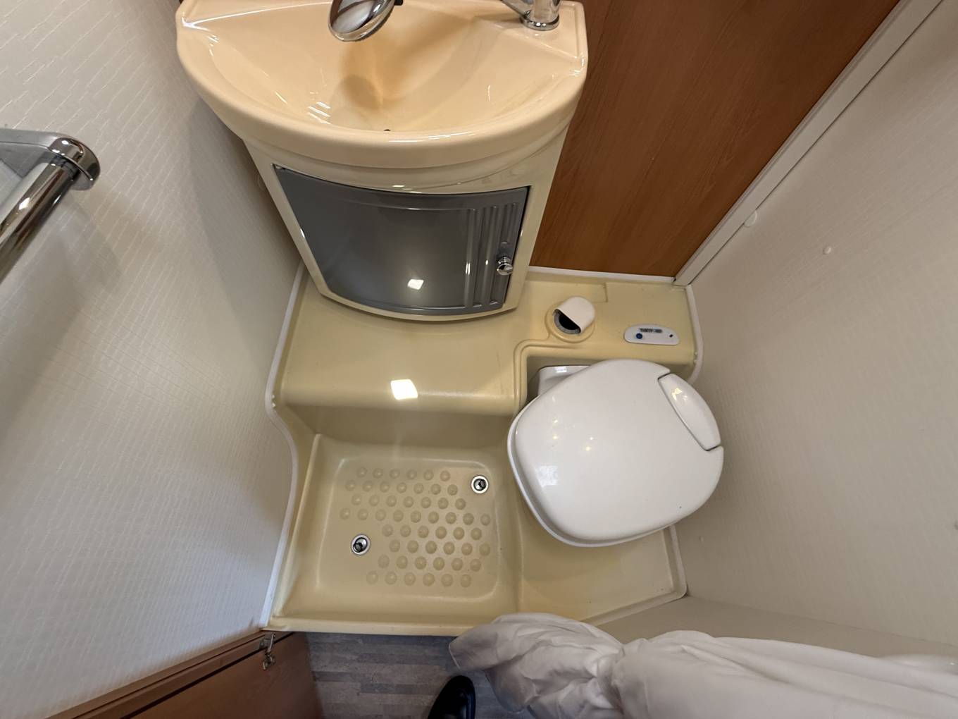 Opposite the kitchen is the bathroom where you will find a Thetford Flushing Cassette Toilet, a Wash Hand Basin and a Shower Unit.