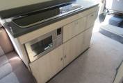 Mid habitation is one that offers plenty of natural light and here you have the kitchen area that is next to the sliding door which gives you extra ventilation when cooking up a hearty meal for any occasion. You have an extendable work top, a large 3 way fridge with freezer space, x2 gas hobs, a microwave and a sink with a hot and cold mixer tap, and plenty of surrounding storage space.
