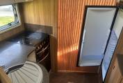 The 745 has a fantastic layout as mentioned - at the front of the motorhome you have a spacious lounge area that uses the front two captains chairs, an L-shaped sofa and a further double side facing sofa to create an ideal place for up to 6 people to relax. There is also a large extendible table (stored under the bed) - that can be set up if you want to have somewhere to enjoy a meal or even as a place to browse a tablet or laptop. There is a TV attached to an extending bracket. Moving back the motorhome has a well equipped kitchen - this feature a full size oven, grill, duel fuel hob with 3 gas burners and electric hot plate and a microwave oven.There is a sink with mixer tap as well as a large fridge with freezer box.