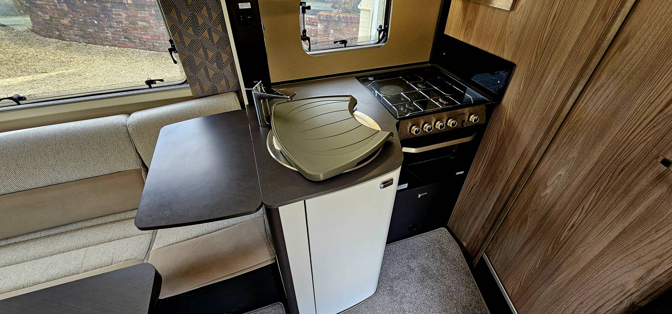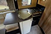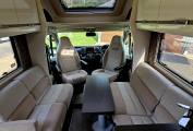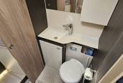 Behind the drivers cab is the lounge featuring 2 forward facing chairs under the seats, both fitted with seat belts. There is a freestanding dining table that is used for meal times and this is electronically height adjustable to make up the 2nd double bed. A large skylight throws in lots of daylight making this a great spot to relax. Moving on to the mid-kitchen, this has everything you need if you enjoy cooking. There's a microwave, a 3 gas and 1 electric burner hob, an oven and grill, a large fridge freezer with automatic selection and a sink with a mixer tap. Up from the kitchen is the washroom where you have a separate shower, a cassette toilet with electric flush, a wash basin and mixer tap, a large mirror and a bathroom cupboard. A skylight ensures that you have plenty of light to help you get ready in the mornings.