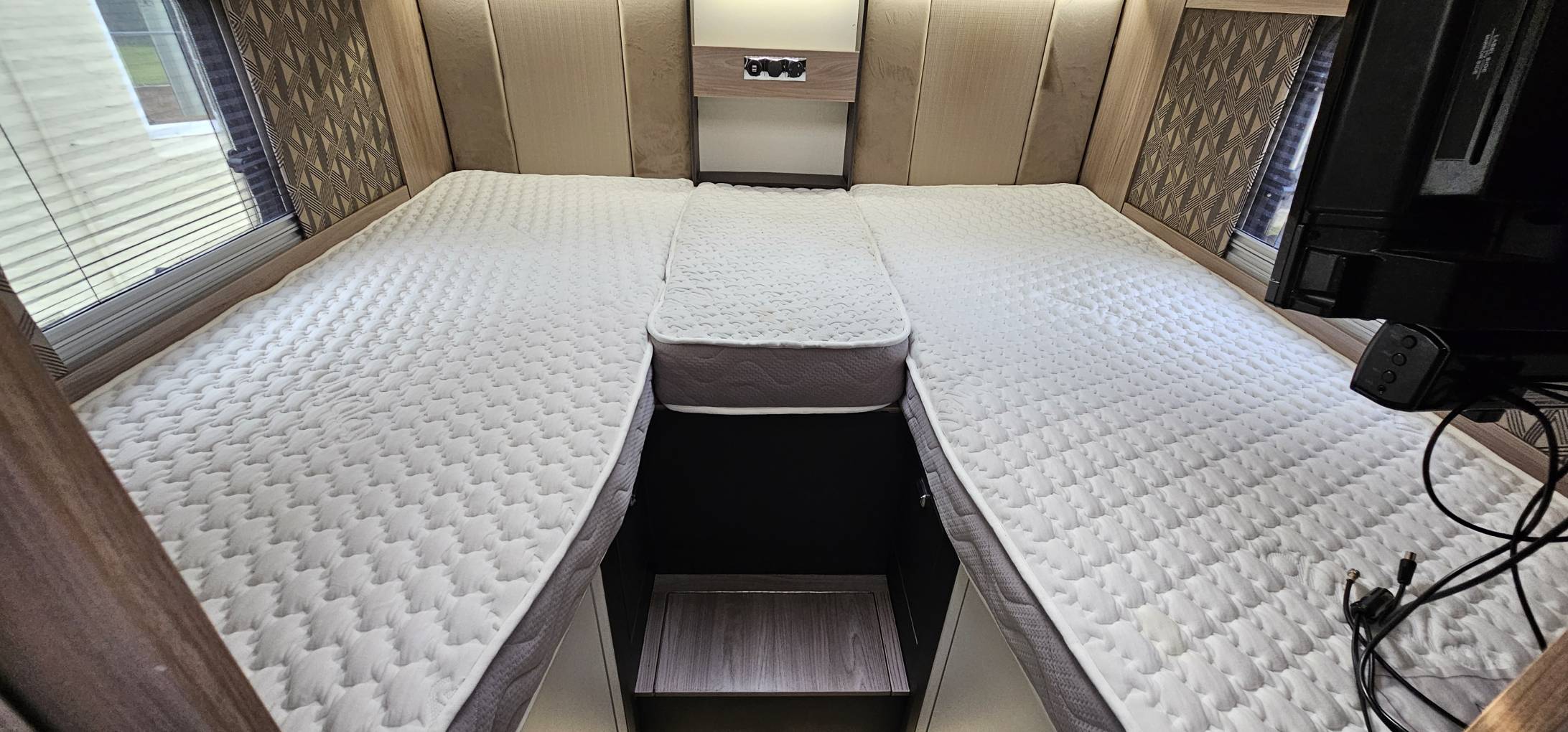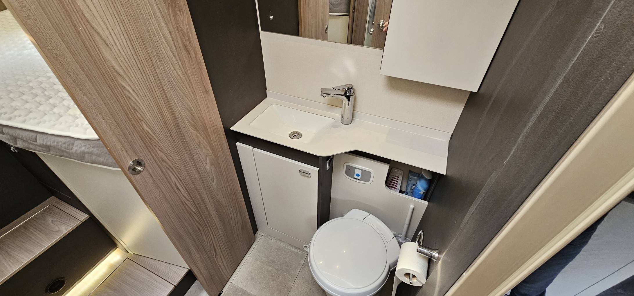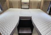 At the rear of the motorhome you have a really comfortable fixed bed which can be used as two singles or as a huge double bed measuring 82 x 57 inches. There is loads of storage space in the lockers under the bed and the bedroom is flooded with light thanks to the 2 large windows and the skylight.
