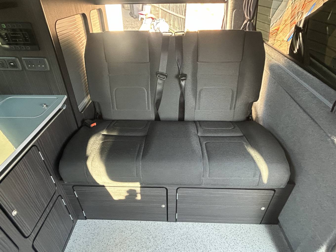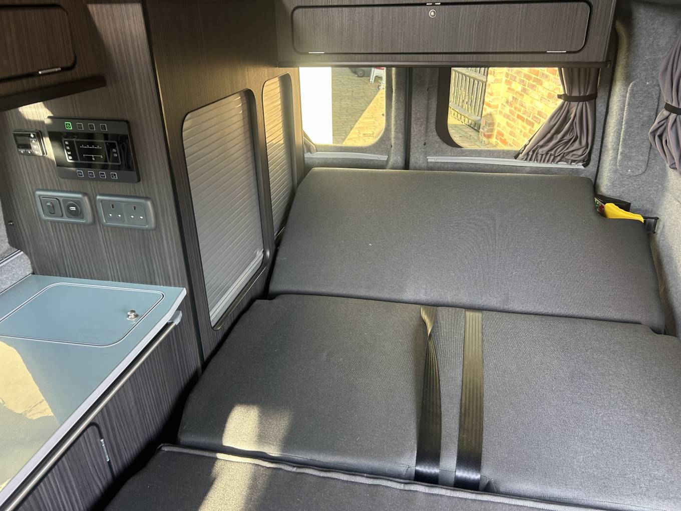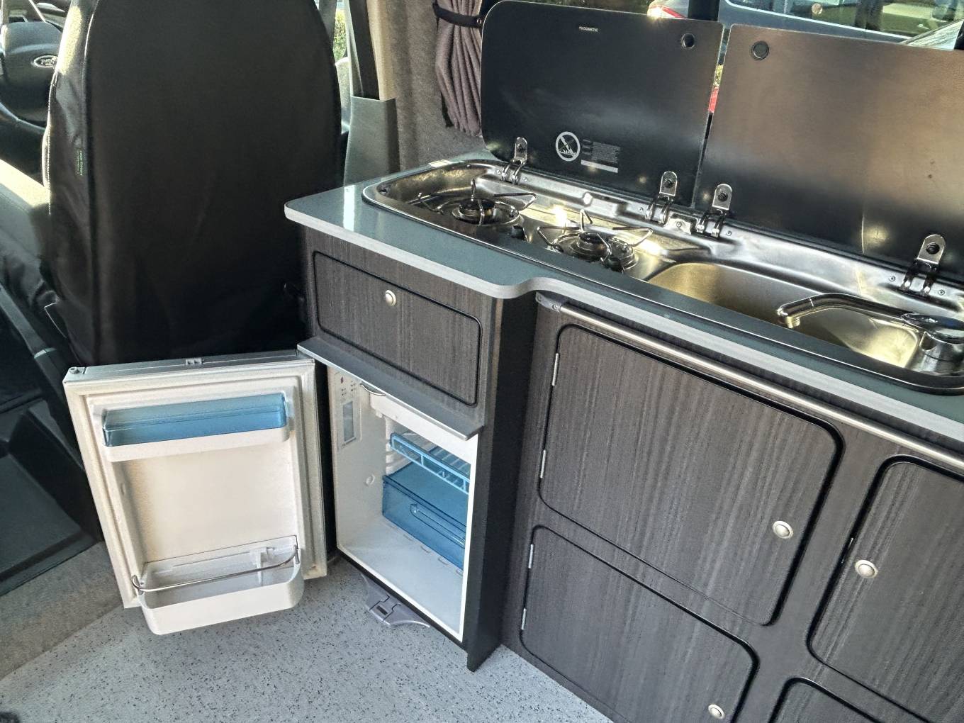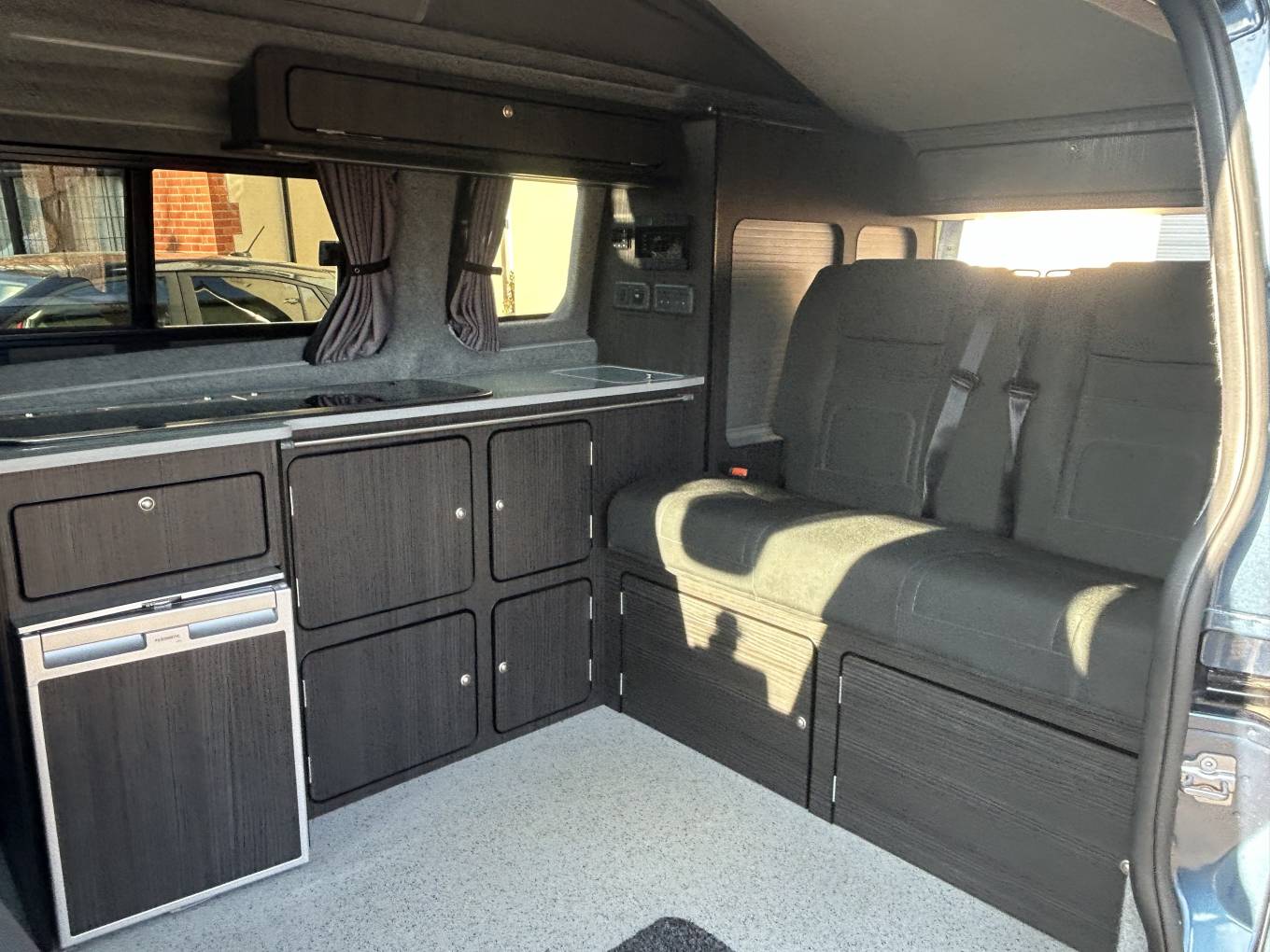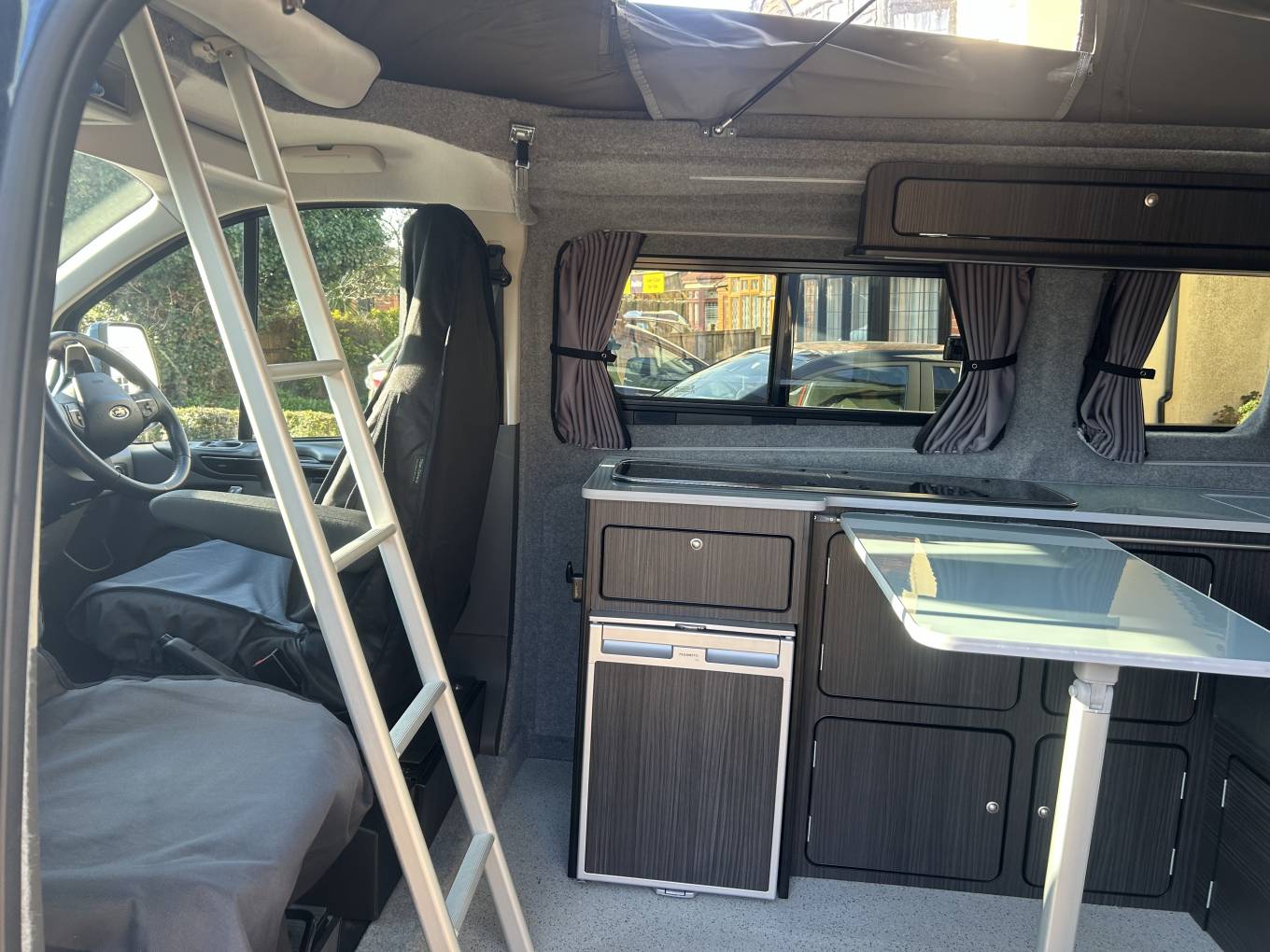 As mentioned, this camper is built to the highest standard and includes all the standard features in a camper and much more. It has a gas hob with two burners, cold water sink and 12v Fridge and LED lighting in the cabin area. It also comes with a diesel heater, swivel passenger seat and heavy duty Altro non slip flooring. Sleeping in this long wheel base camper is extremely comfortable with the option of the Rib bed or the large sleeping area in the Pop Top roof. This camper has lots of cupboards and storage space, with additional storage found under the RIB bed. The camper has a Full Power Management System with 240v Hook Up (cable included), leisure battery and solar panel for off grid use. The camper also has an awning rail attachment and the owner has a drive away blow up awning that is available on separate negotiaton.