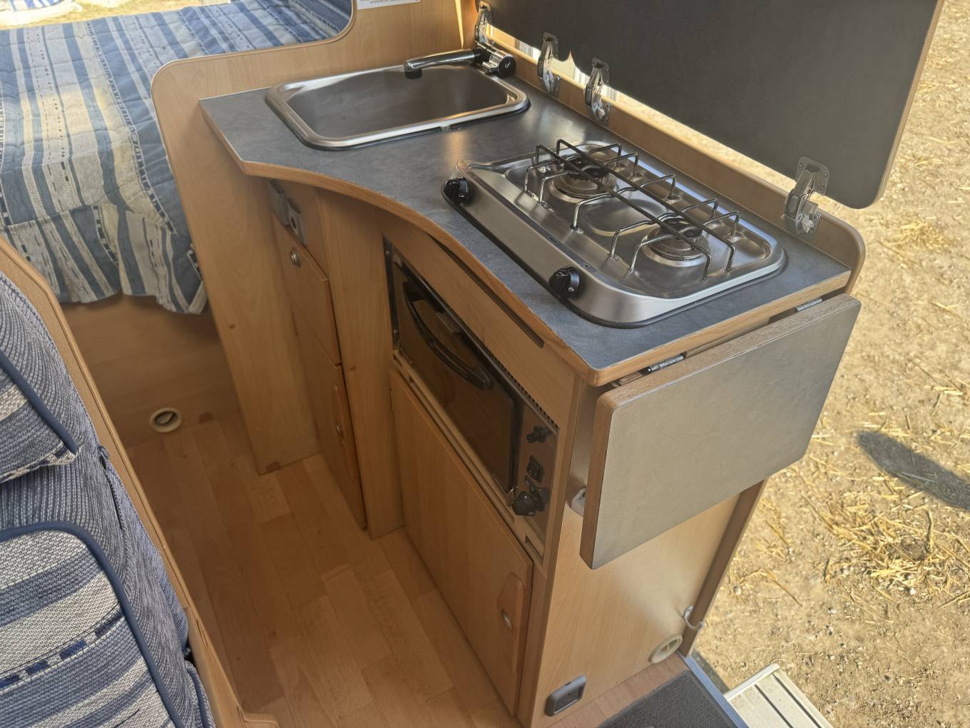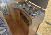 Moving through to the centre of the motorhome, there is a 3 ring gas hob supplied from the gas bottles in the locker under the bed. adjacent to the cooker is the sink and a fridge with separate freezer compartment. Opposite this area is the large washroom with a toilet, sink and shower area with a plenty of storage space too.